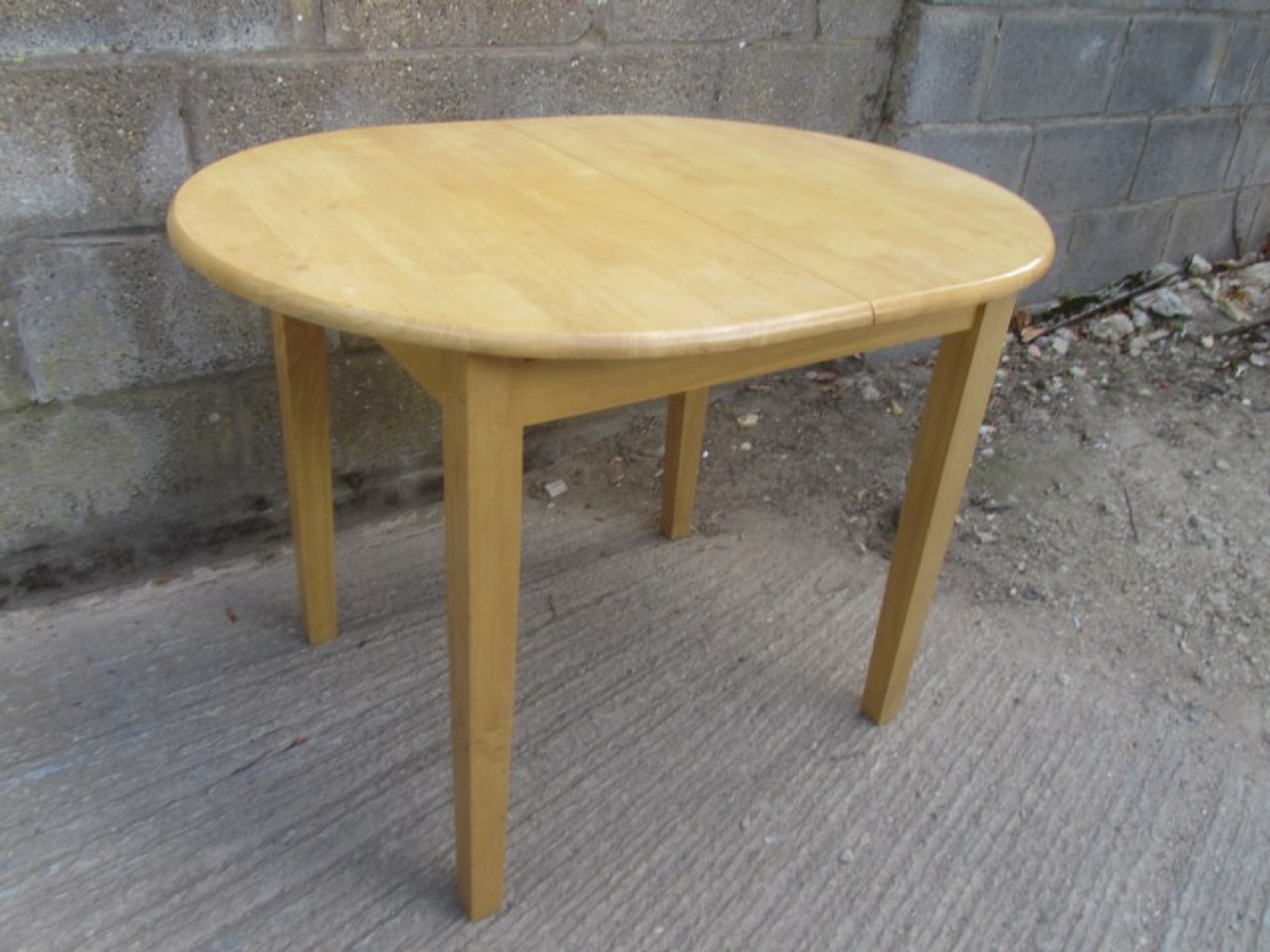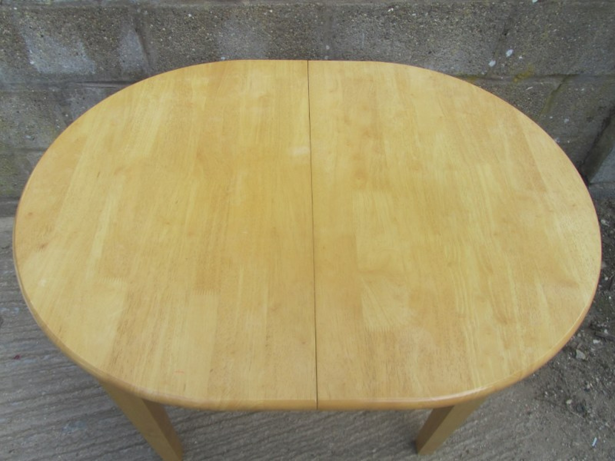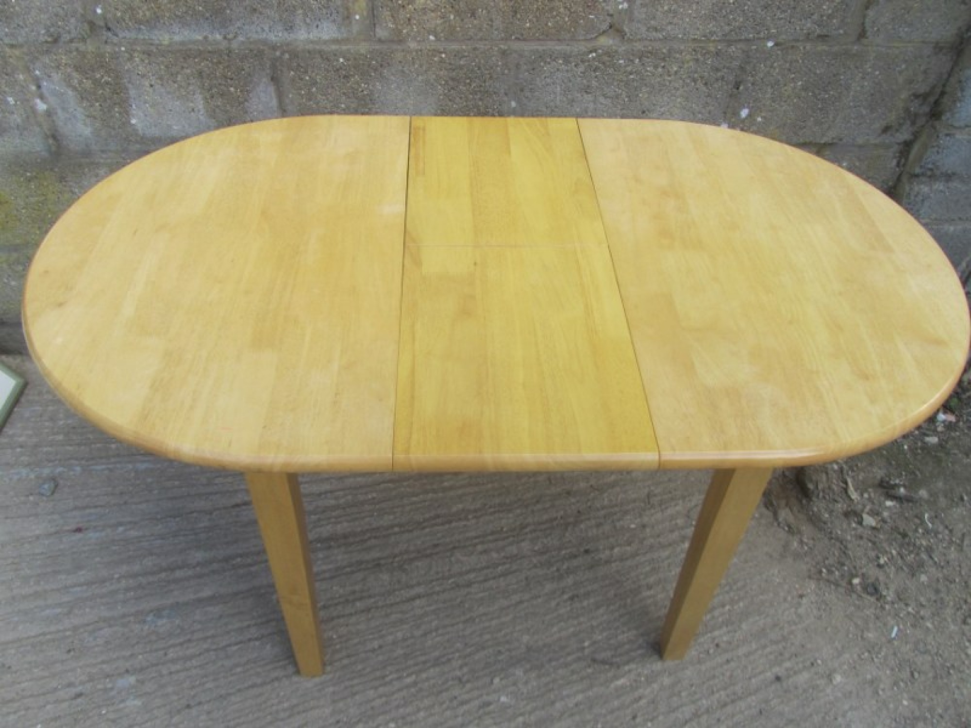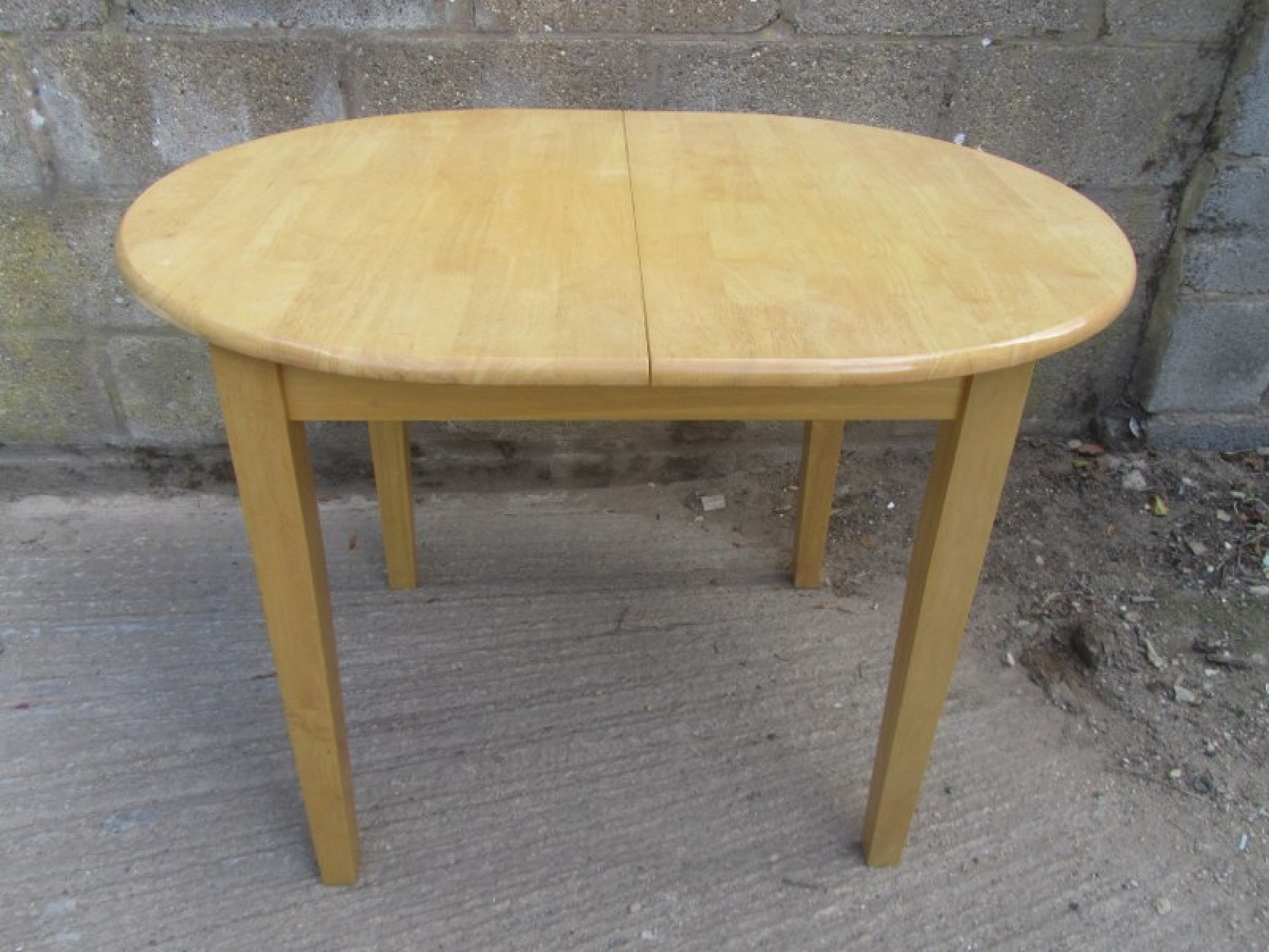 A MODERN DINING TABLE, THE FRAME AND TABLE TOP ARE SOLID BEECH, IT IS STRONG AND STURDY. SOME SLIGHT FADING TO THE TABLE TOP. IT EXTENDS IN THE CENTRE. WILL SEAT 2-4 DINERS. STRONG AND STURDY. GOOD CONDITION. THE LEGS WILL REMOVE FOR TRANSPORT.