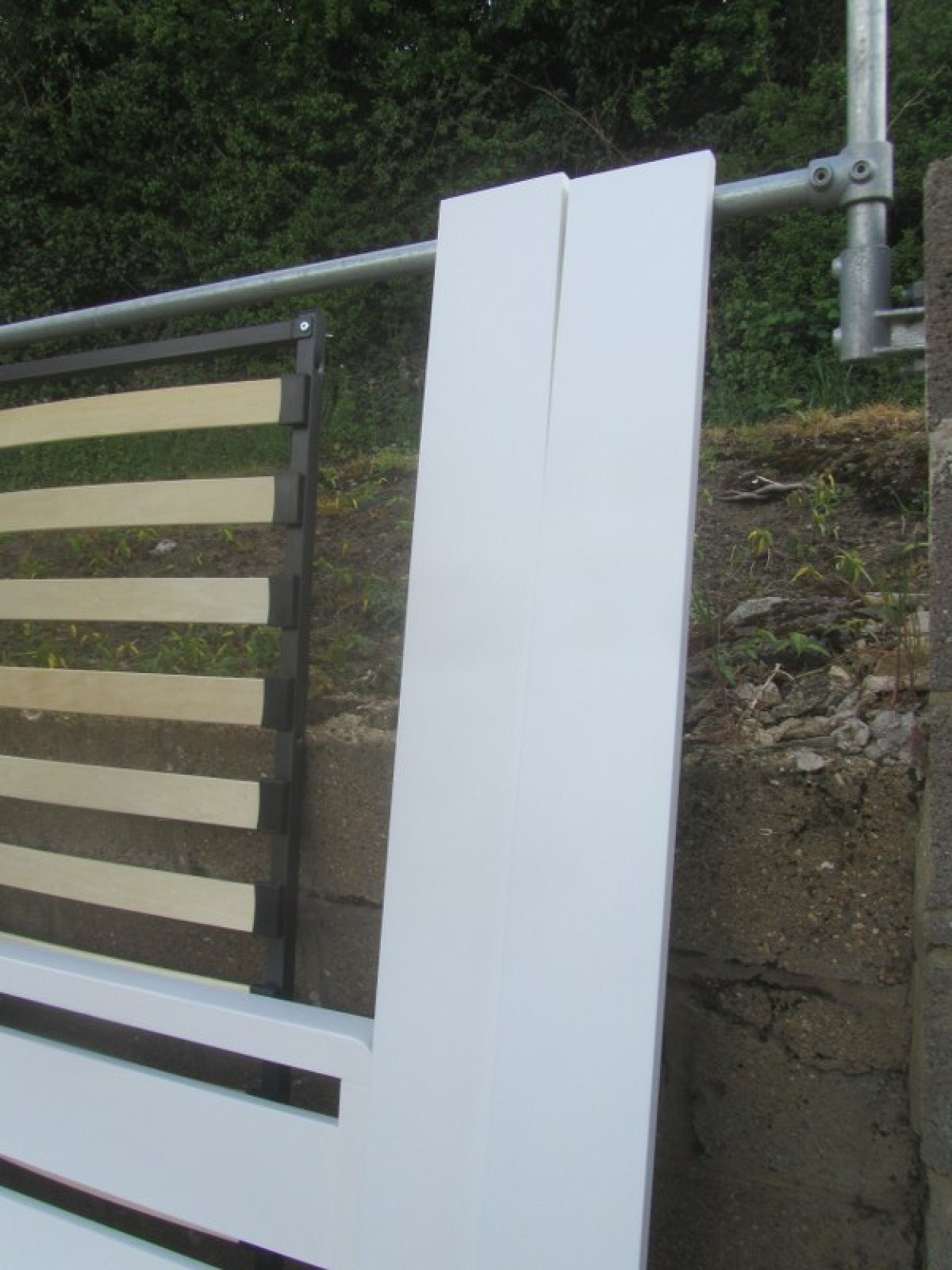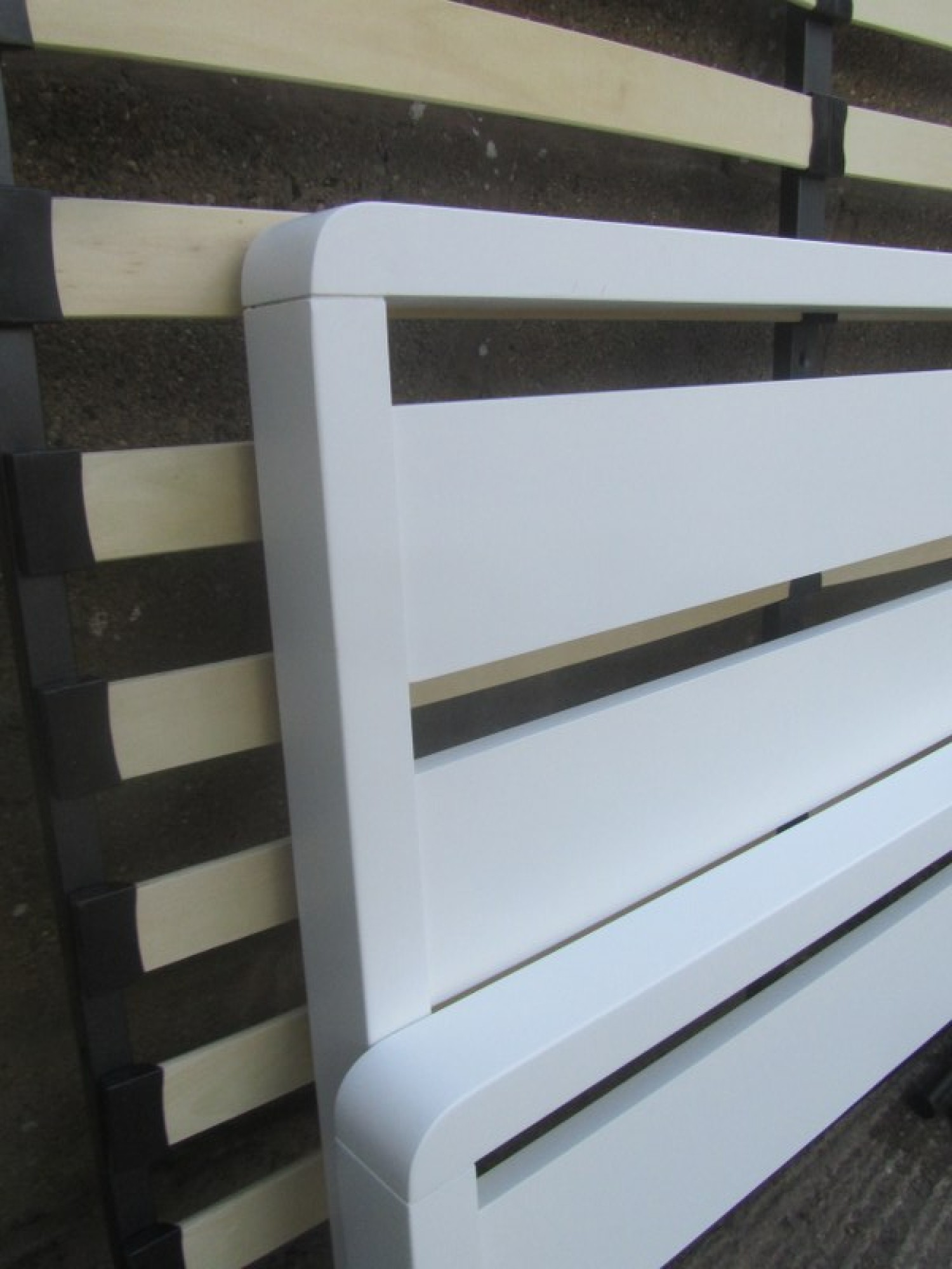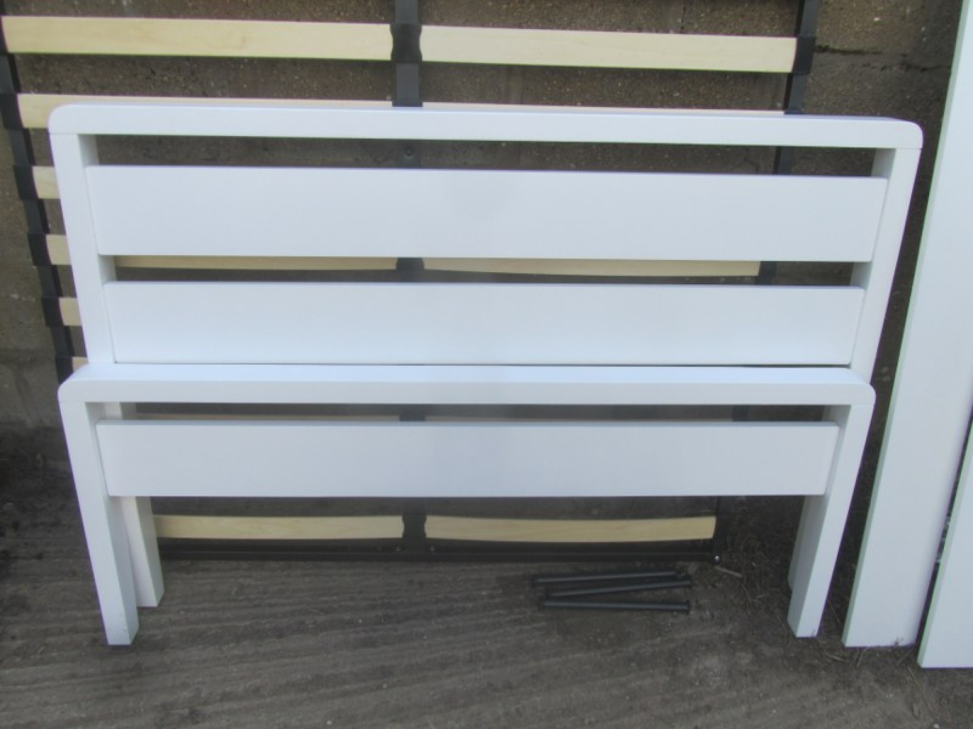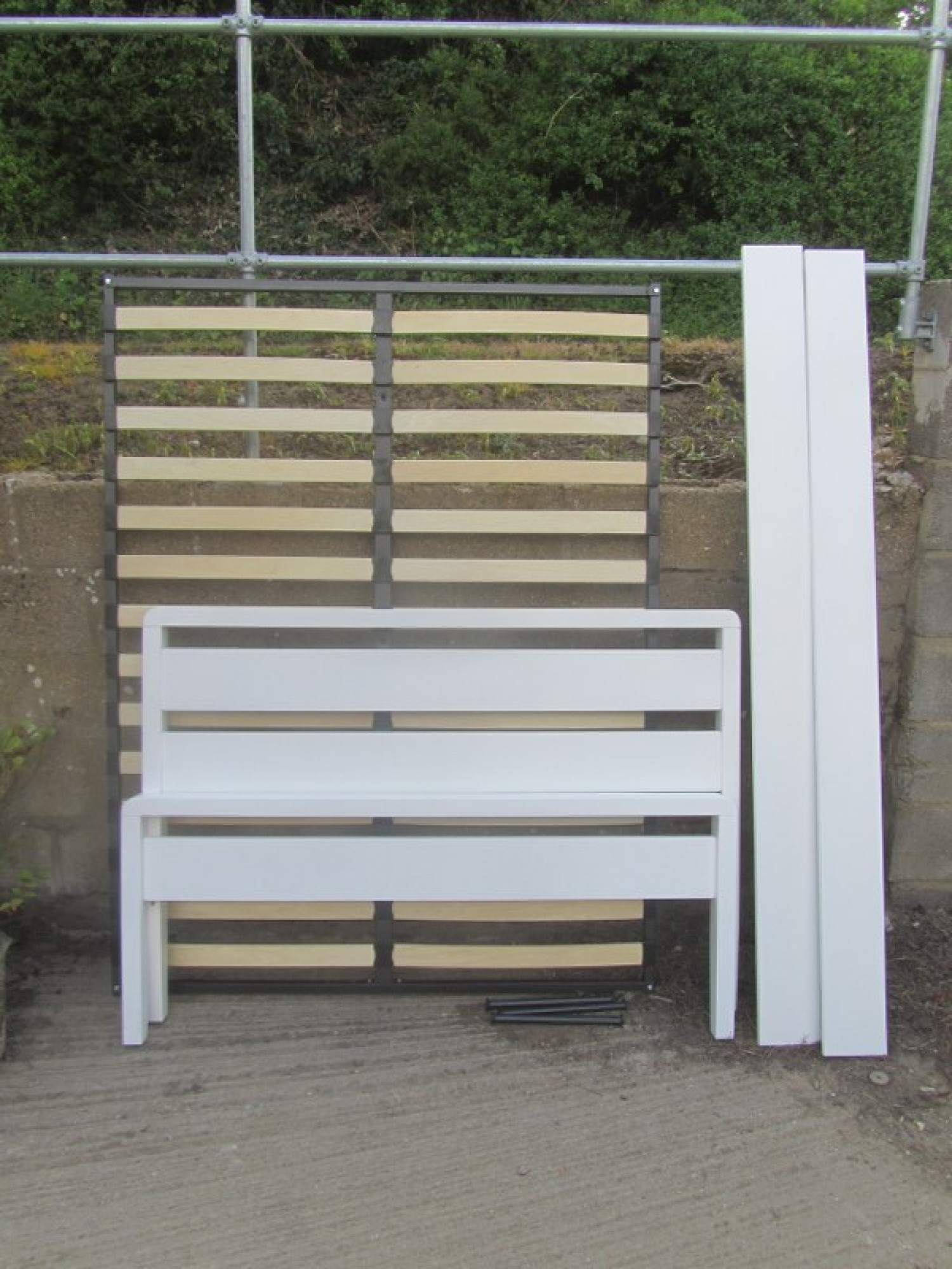 A MODERN WHITE BED FRAME. COMPLETE WITH SLATS AND FITTINGS. NO MATTRESS. TO FIT A STANDARD 4'6" DOUBLE MATTRESS. IT IS DISMANTLED READY FOR COLLECTION. THE SPACE FOR A MATTRESS IS 138cm WIDE. IN GOOD CONDITION. HARDLY USED.
