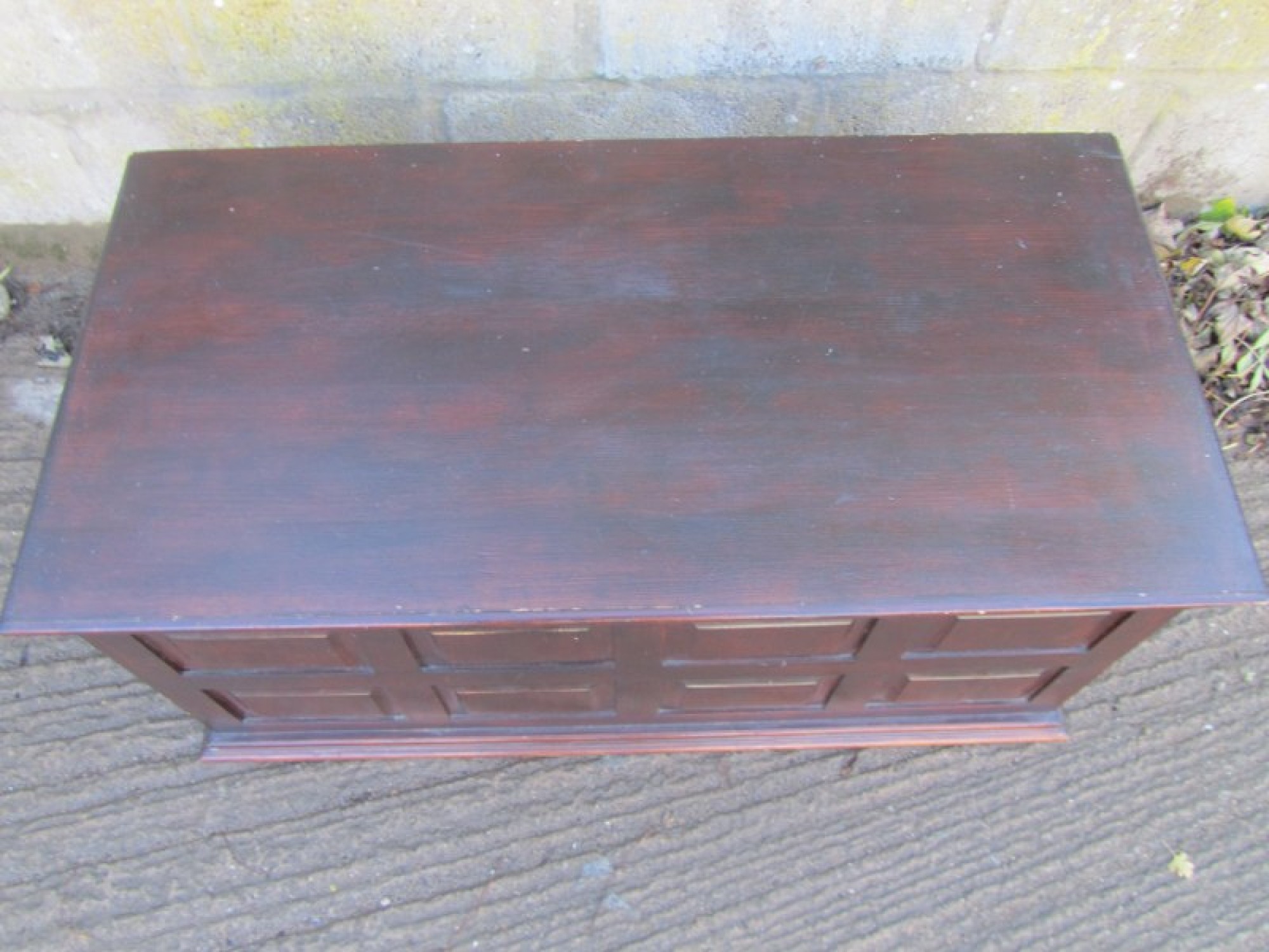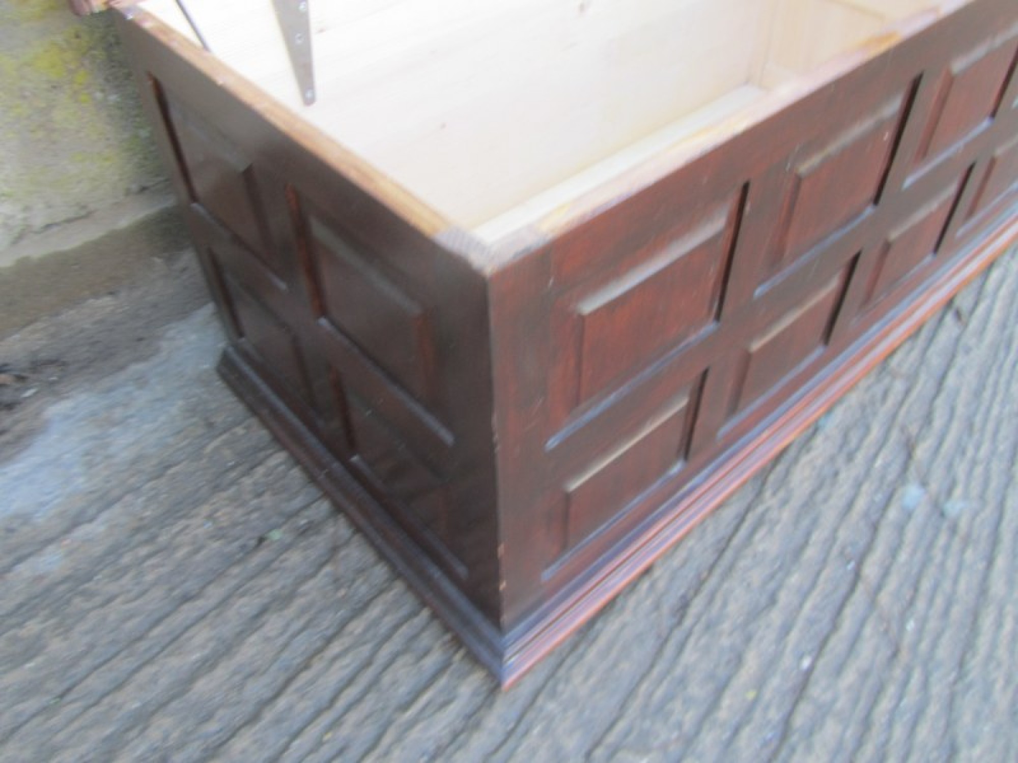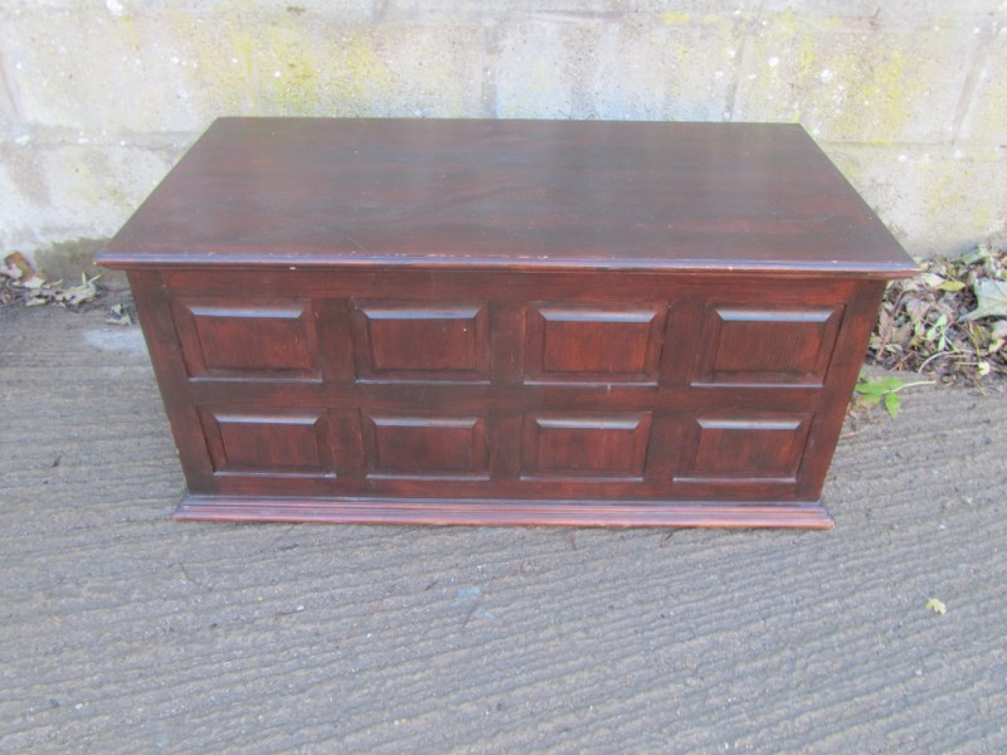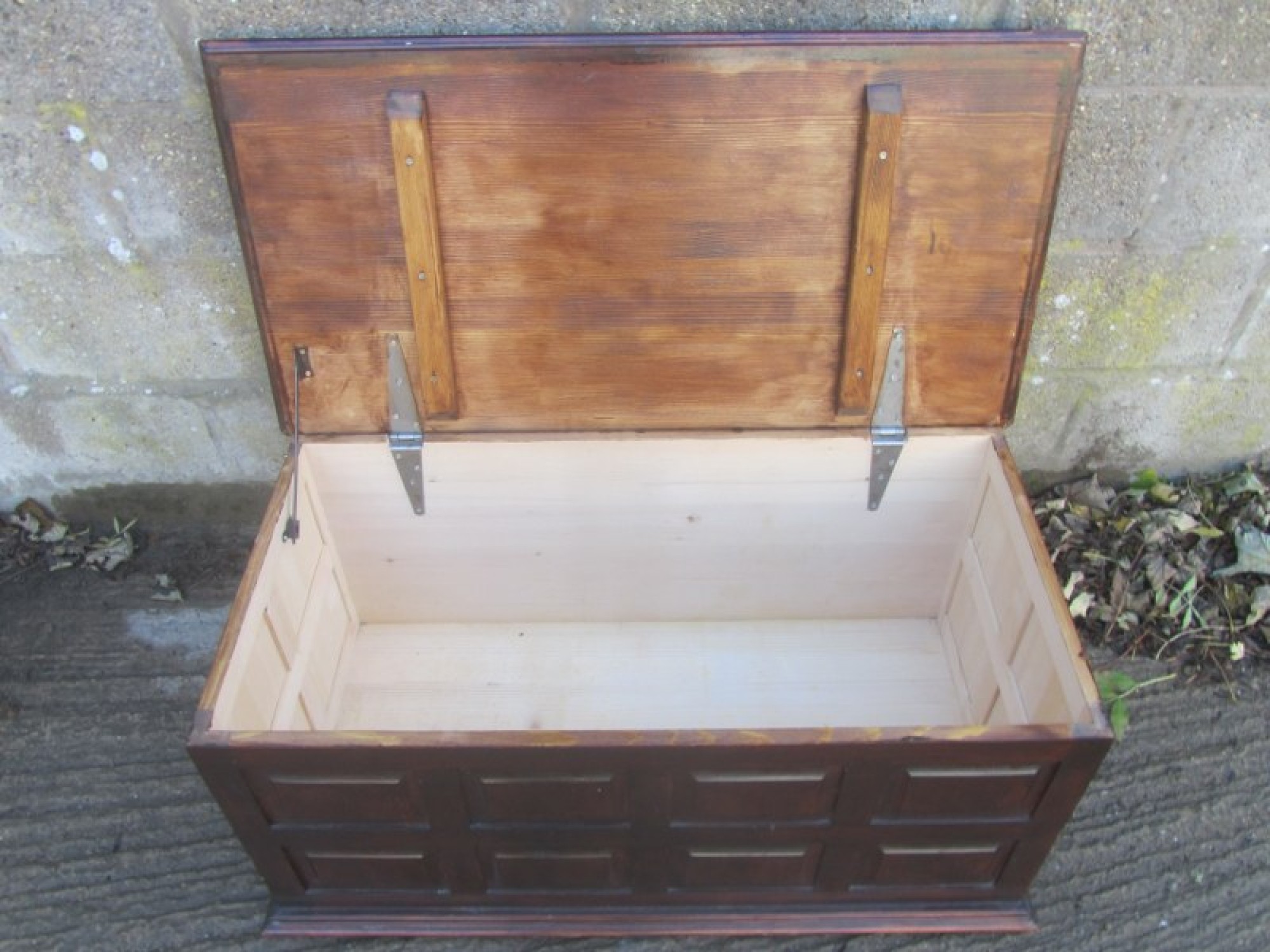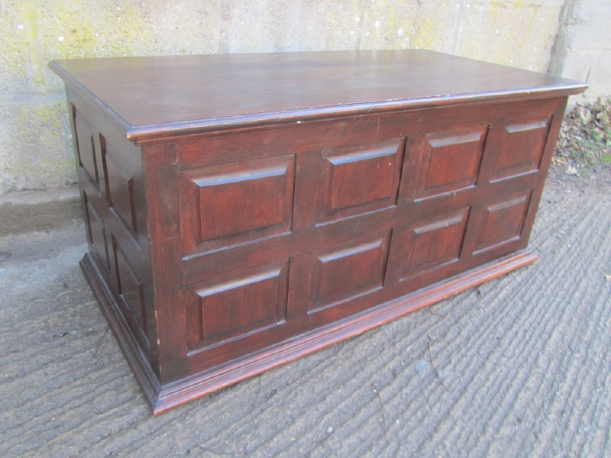 THIS IS A MODERN SOLID PINE BLANKET BOX IN A DARK FINISH. THESE ARE GREAT FOR STORING CLOTHES / BLANKETS, THEY ALSO MAKE GREAT TOY BOXES, COFFEE TABLES etc. STRONG AND STURDY. SOME SCUFFS AND WEAR.