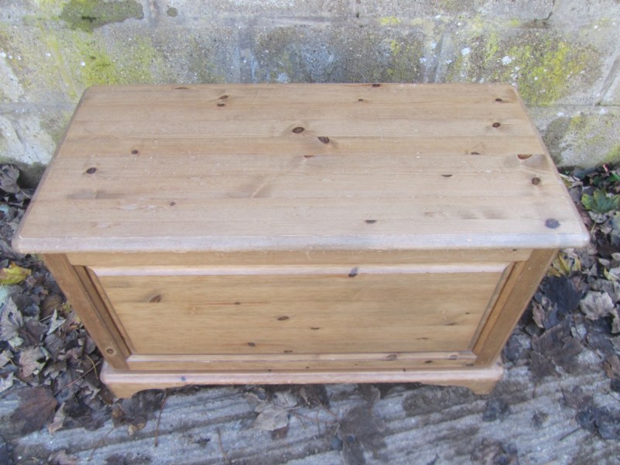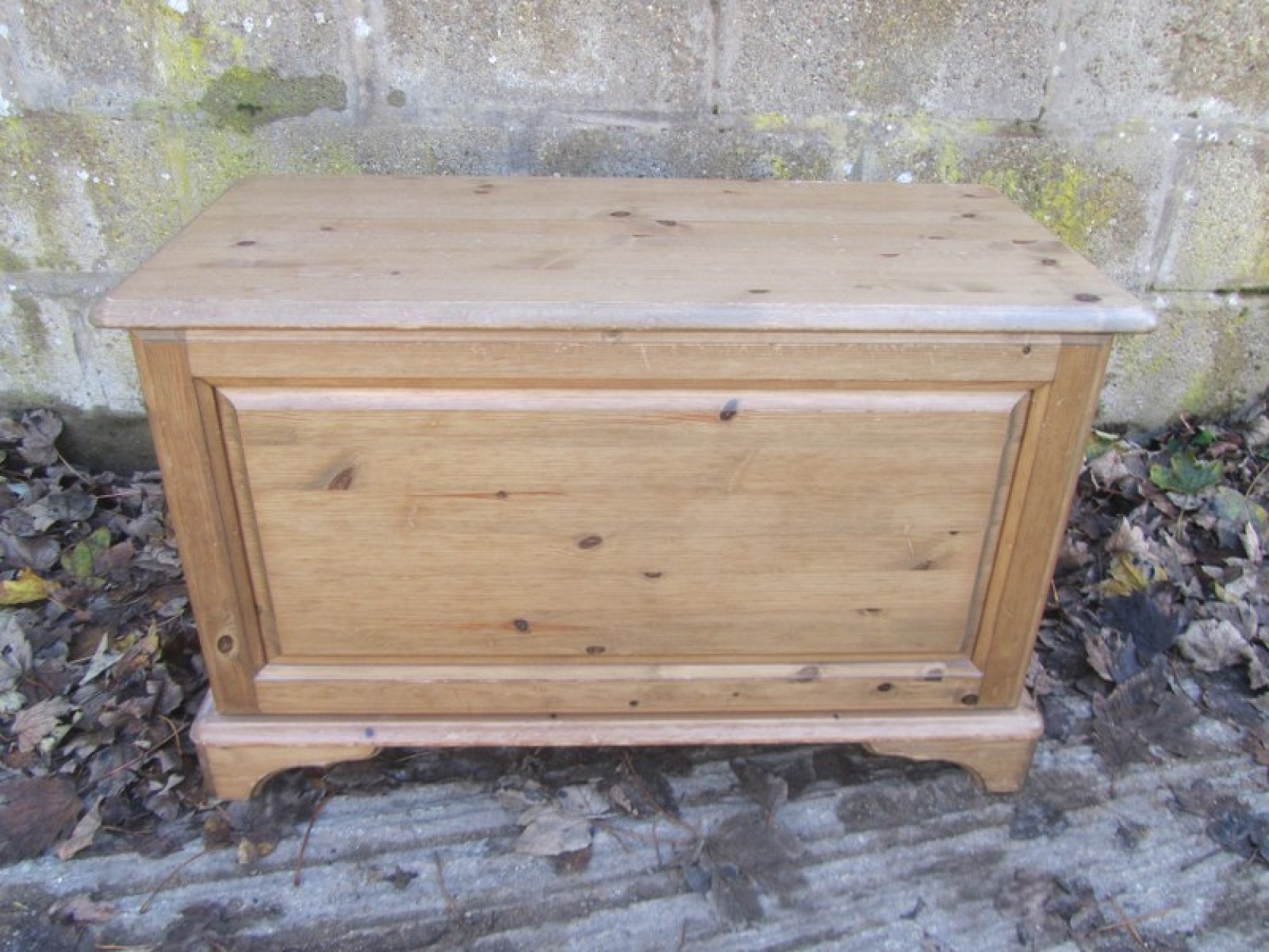 THIS IS A MODERN SOLID PINE BLANKET BOX. THESE ARE GREAT FOR STORING CLOTHES / BLANKETS, THEY ALSO MAKE GREAT TOY BOXES, COFFEE TABLES etc. STRONG AND STURDY. SOME SCUFFS AND WEAR, FADED WOOD.