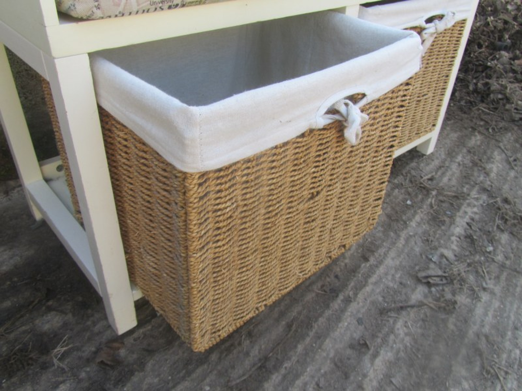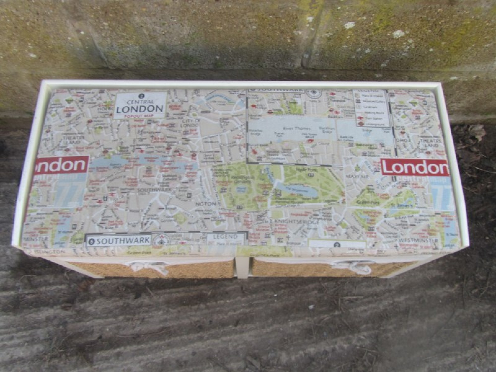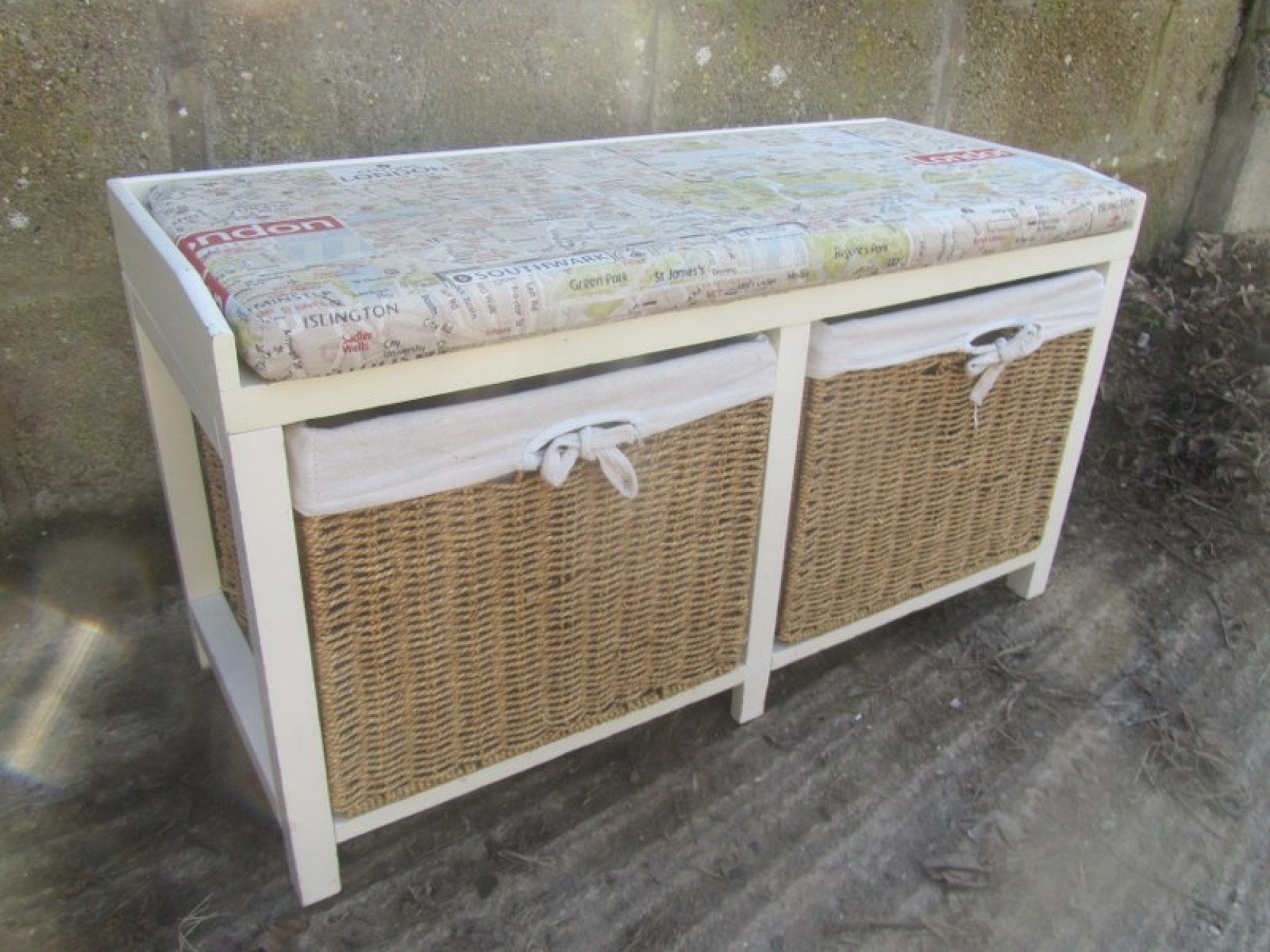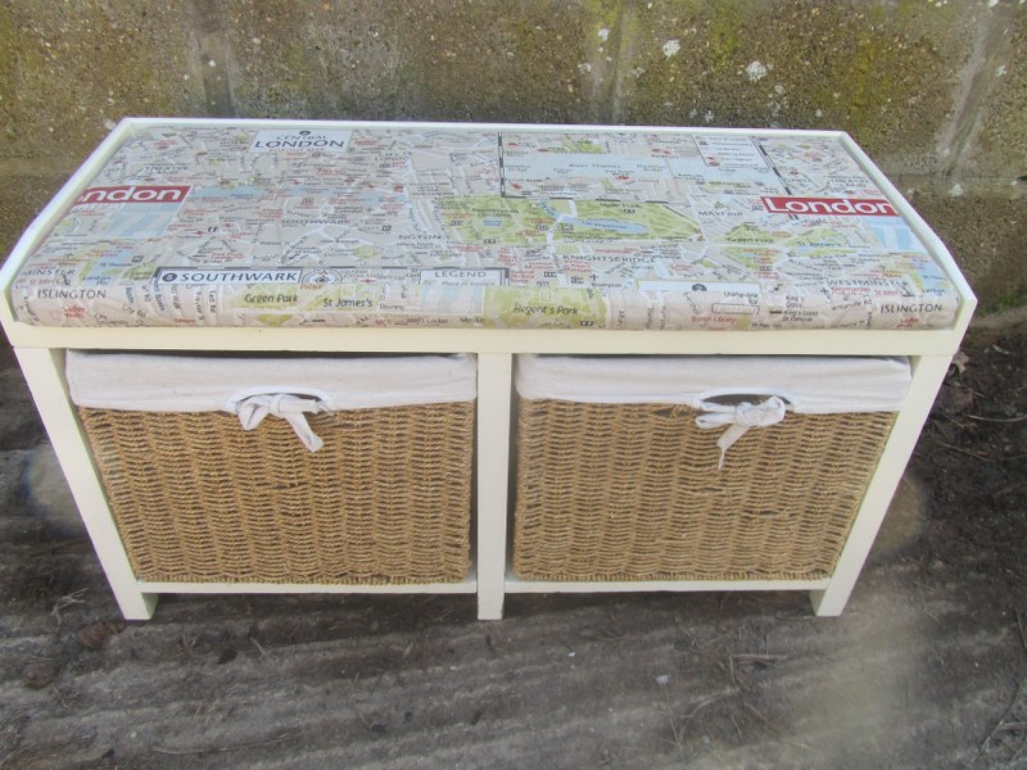 A SIMPLE SHOE CABINET IN A WHITE FINISH. PLENTY OF STORAGE SPACE FOR SHOES. IDEAL FOR A HALLWAY, WITH PADDED CUSHION ON TOP WITH STYLISH LONDON PRINTED FABRIC.