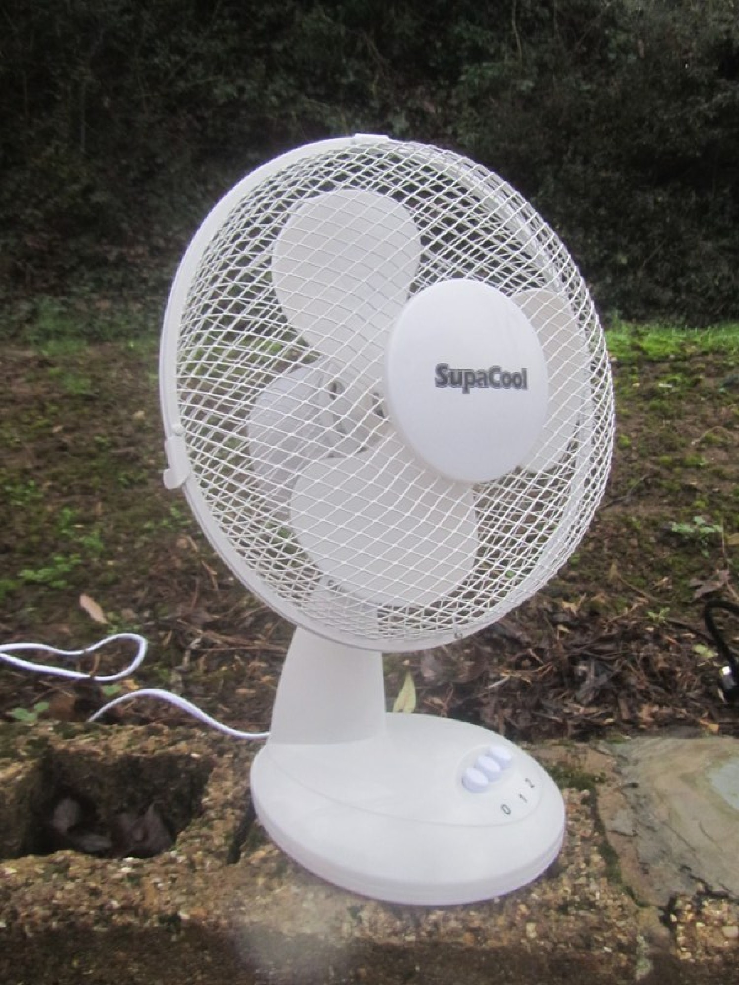 A DESK FAN, IN PLASTIC, IT OSCILLATES, IT HAS PLASTIC BLADES.