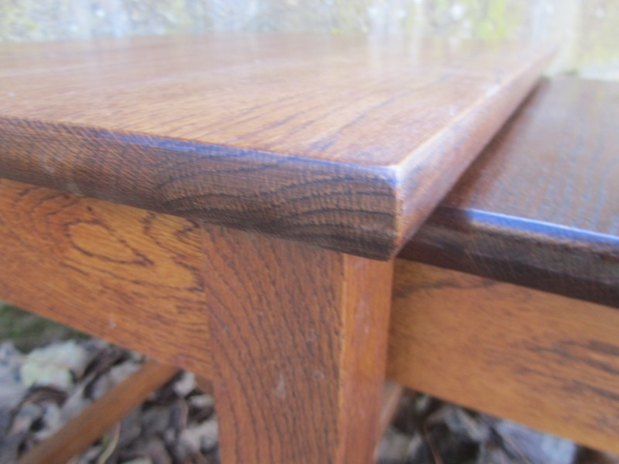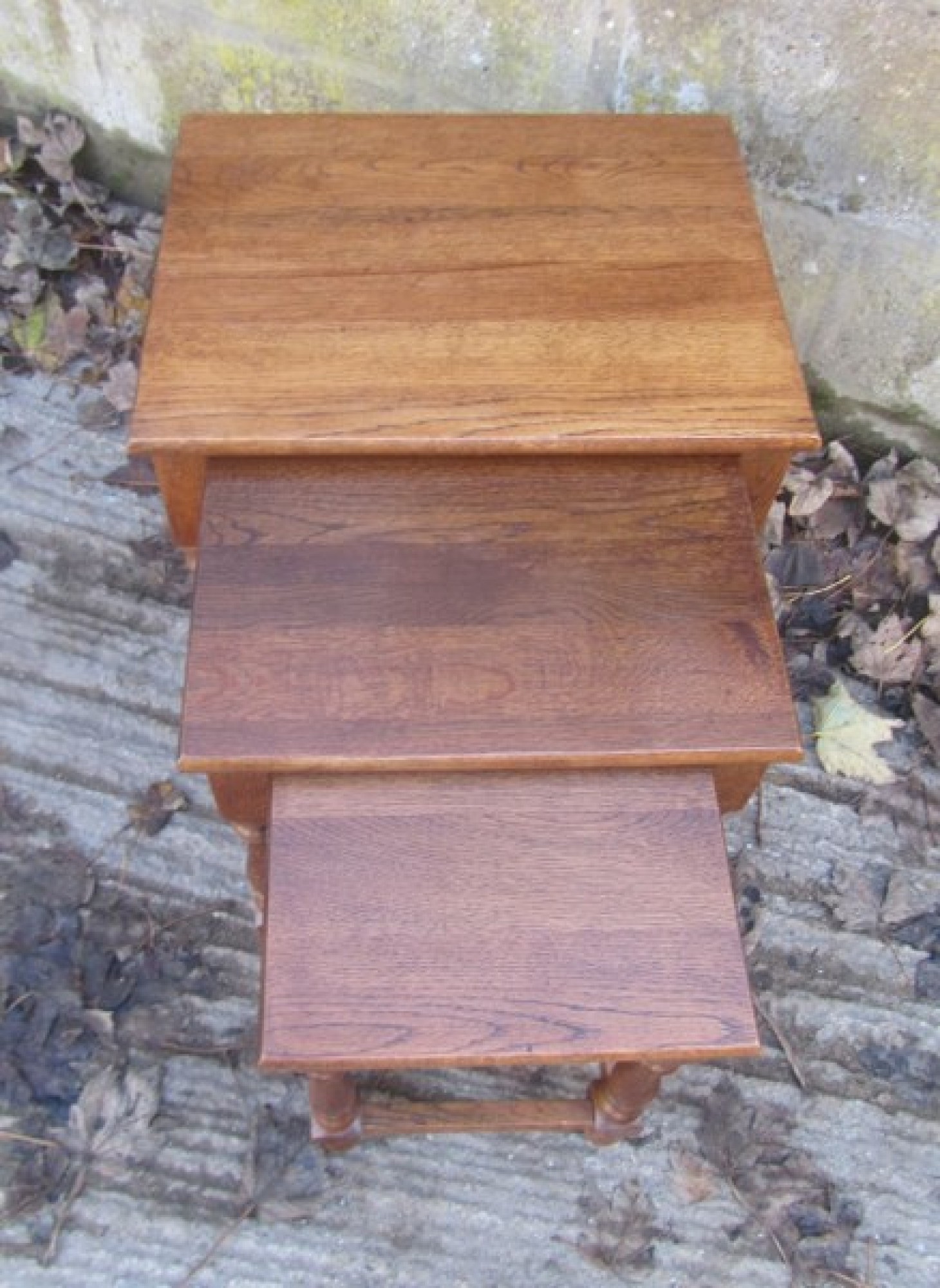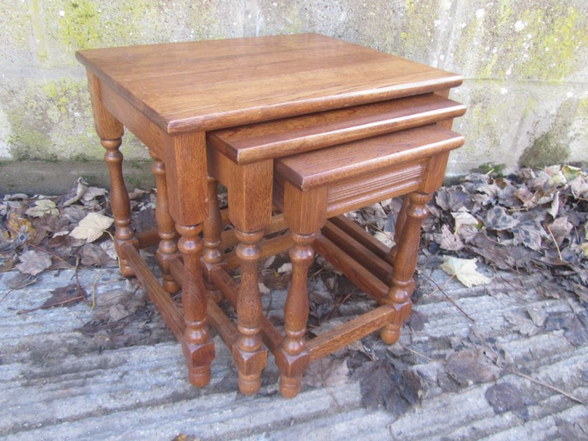 THIS IS A NEST OF 3 SOLID OAK TABLES. THEY ARE A GREAT SET, IDEAL AS COFFEE TABLES, OR OCCASIONAL TABLES. THEY ARE IN GOOD CONDITION, STRONG AND STURDY. THE 2 SMALL TABLES NEATLY SIT INSIDE THE LARGE TABLE, SO DON'T TAKE UP MUCH SPACE WHEN NOT IN USE. SOME LIGHT WEAR.