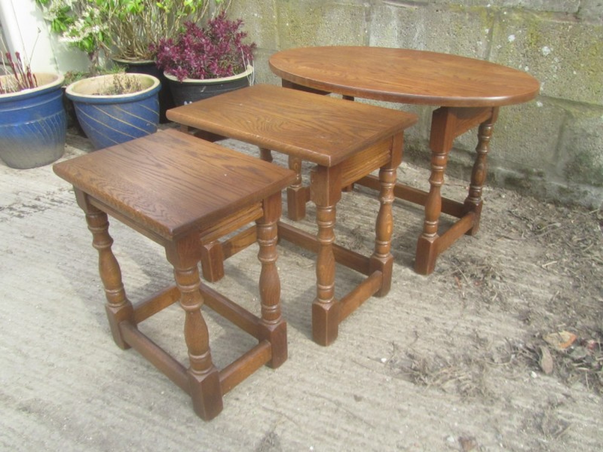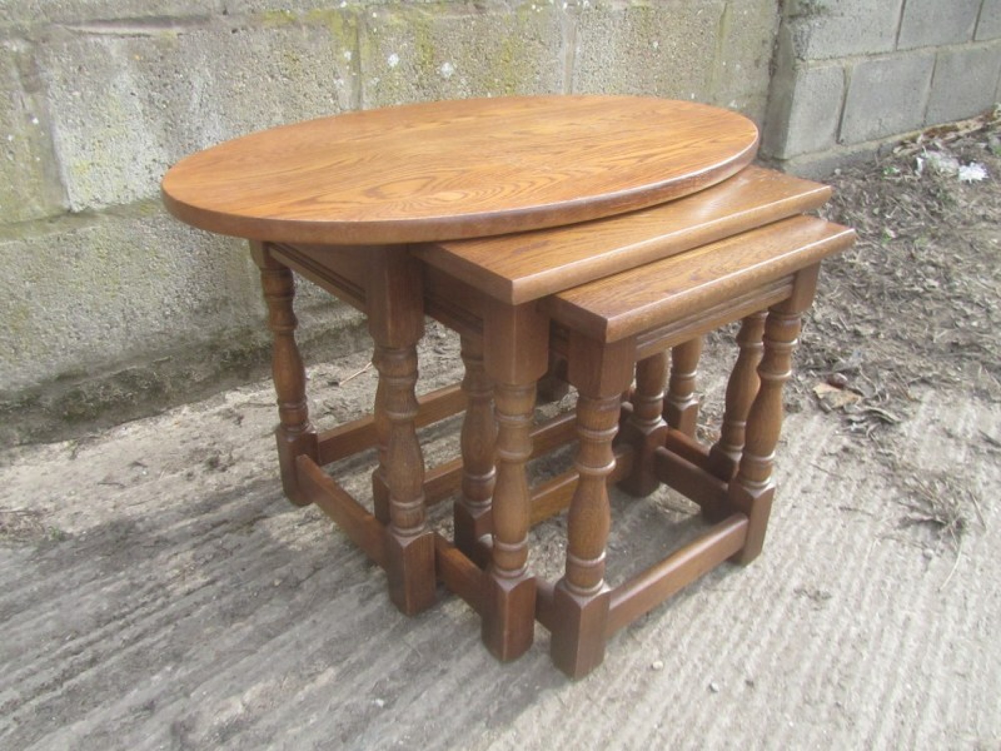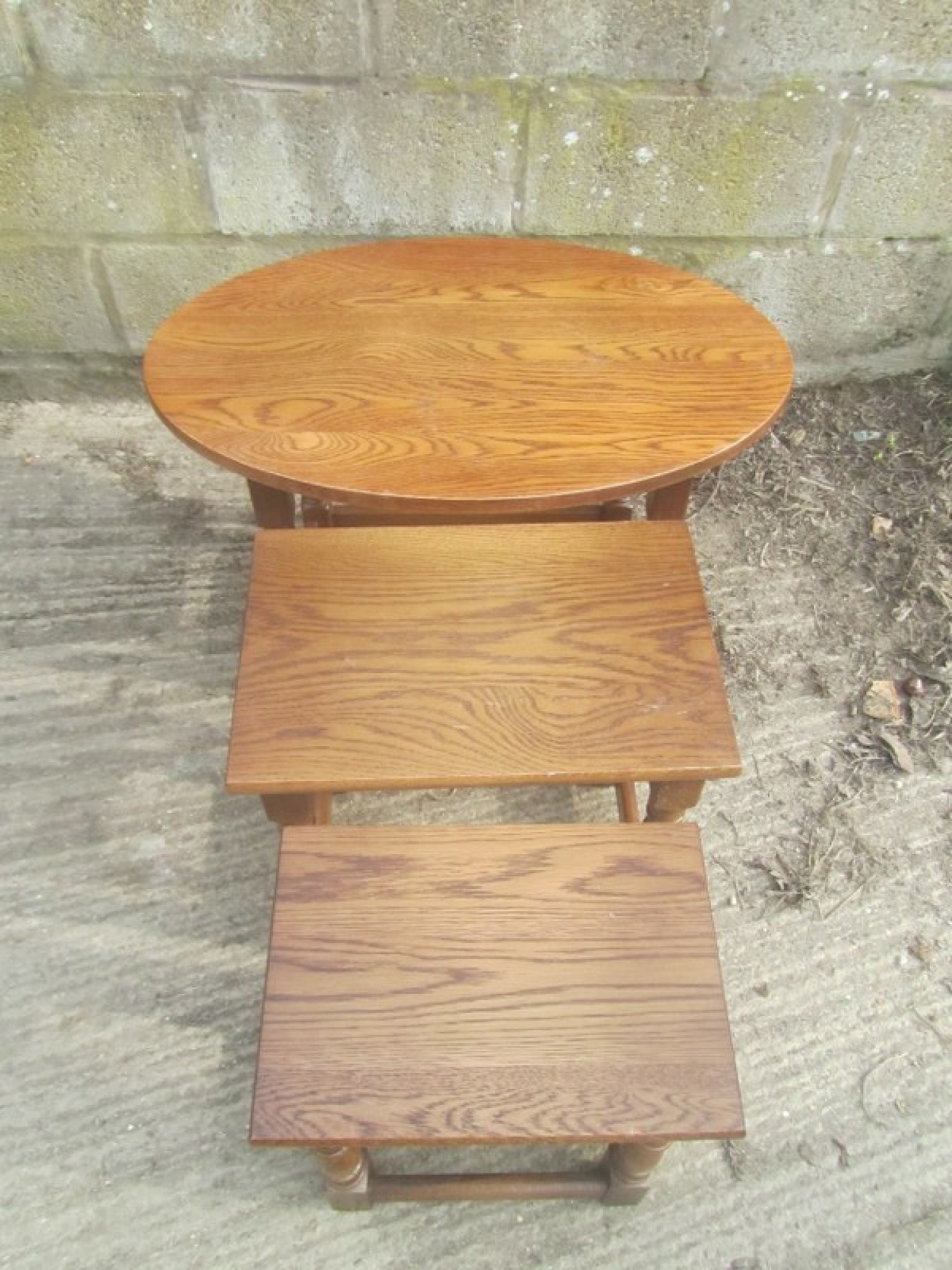 THIS IS A NEST OF 3 SOLID OAK TABLES. THEY ARE A GREAT SET, IDEAL AS COFFEE TABLES, OR OCCASIONAL TABLES. THEY ARE IN GOOD CONDITION, STRONG AND STURDY. THE 2 SMALL TABLES NEATLY SIT INSIDE THE LARGE TABLE, SO DON'T TAKE UP MUCH SPACE WHEN NOT IN USE.