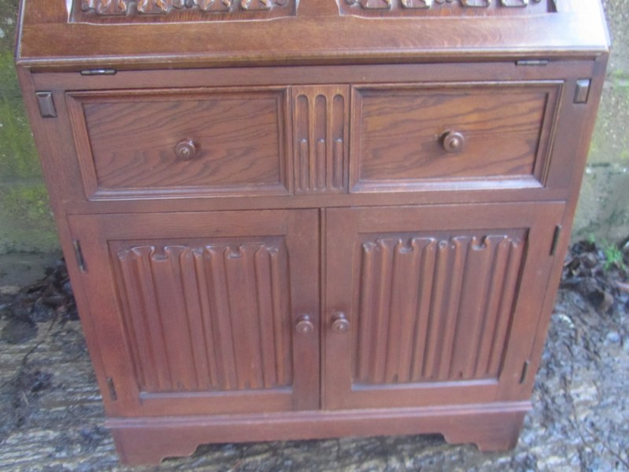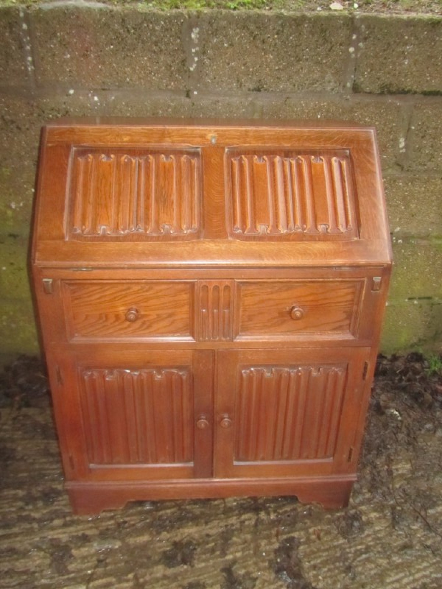 THIS IS A BUREAU FROM THE MID - LATE 20th CENTURY. IT IS OAK, SOLID & VENEERED, THE TOP SECTION HAS A DROP DOWN FRONT WHICH IS SELF SUPPORTING, INSIDE THE BUREAU IT IS FITTED WITH PIGEON HOLES.