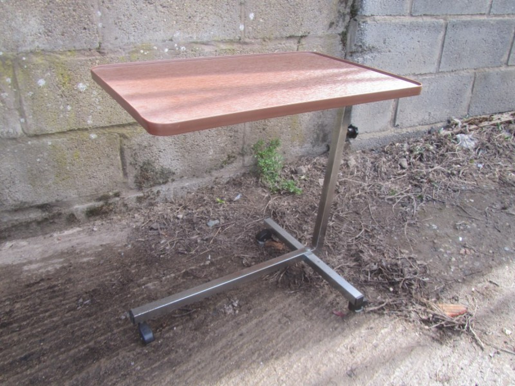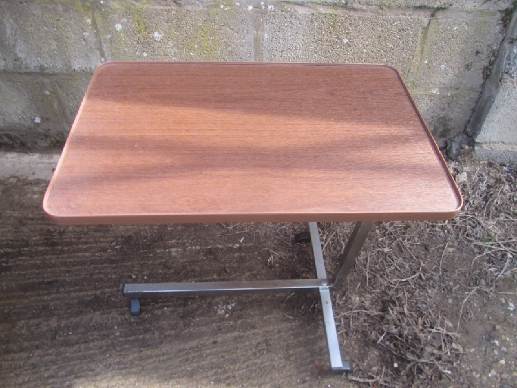 AN ADJUSTABLE TABLE THAT FITS OVER A BED/ CHAIR. THE HEIGHT AND TABLE TOP ANGLE ARE ADJUSTABLE. THE FRAME IS METAL AND THE TABLE TOP IS WOOD EFFECT FORMICA. IT STANDS ON CASTORS, EASILY MOVED. IDEAL FOR MEALS IN BED.