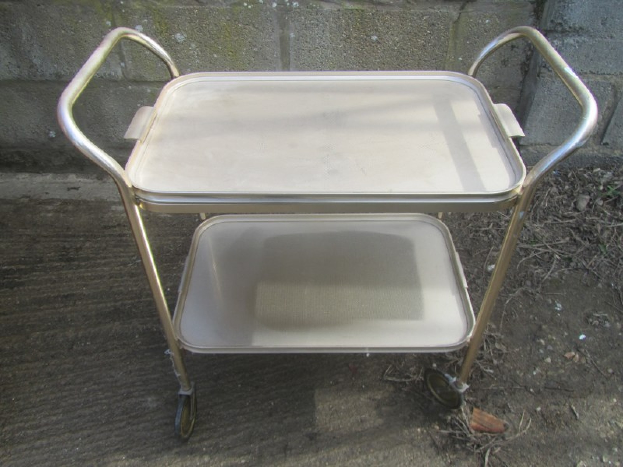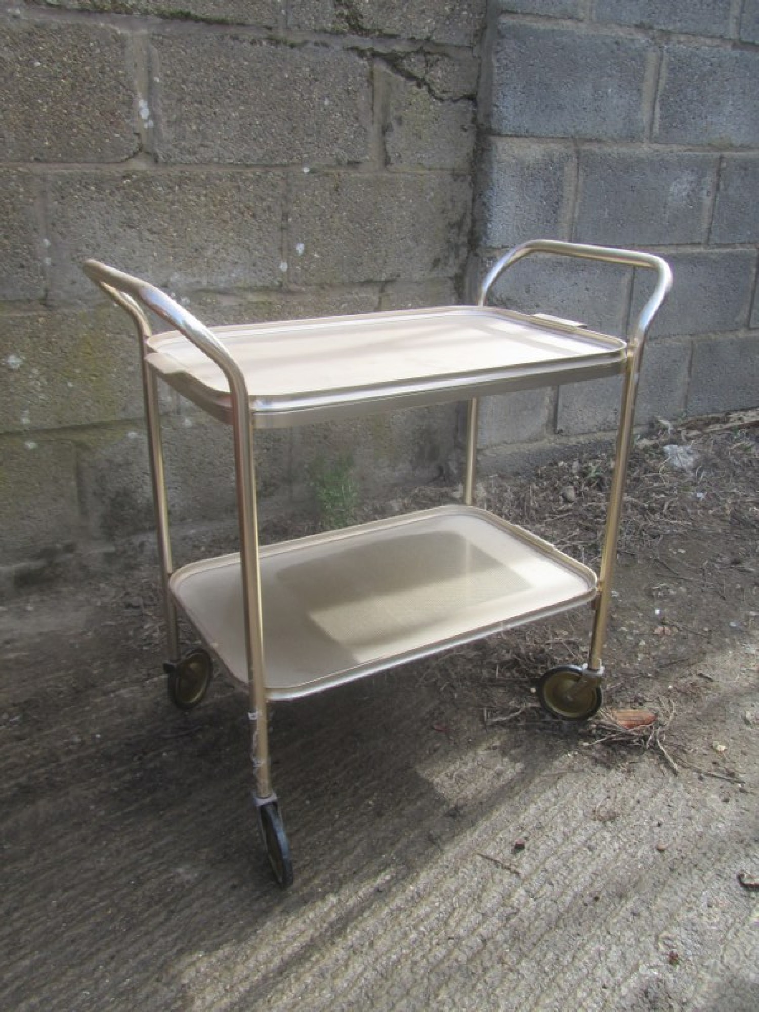 Items for Sale RETRO BRASS COLOURED DRINKS / TEA TROLLEY - VINTAGE Share: View Larger Image View Larger Image Select to enlarge £ 20 A BRASS COLOURED TEA / DRINKS TROLLEY. ADDITIONAL DETAILS RESERVE ITEM Condition:AVERAGE Manufacture Date:1970s Height:71 cms Length:71 cms Depth:38 cms Quantity:1 Item Number:41416 * Please complete all the fields below to send an enquiry about this product. Please reserve this item for me… Reset Send