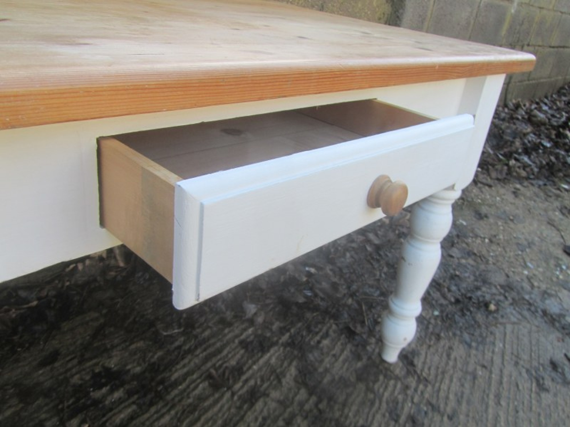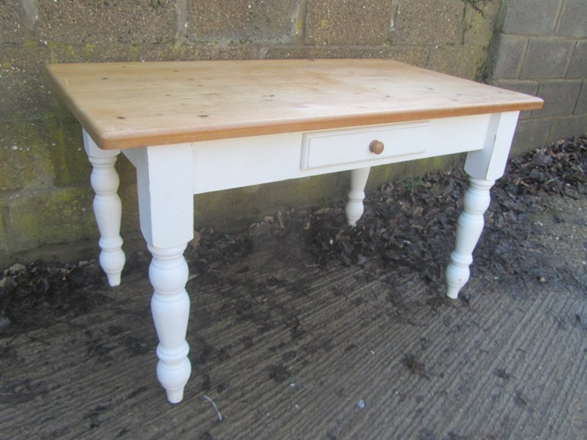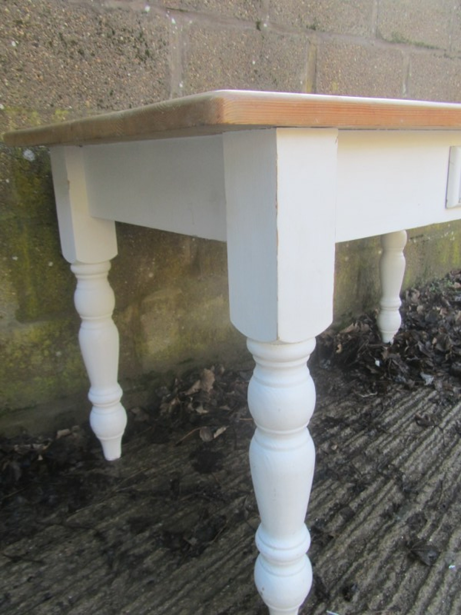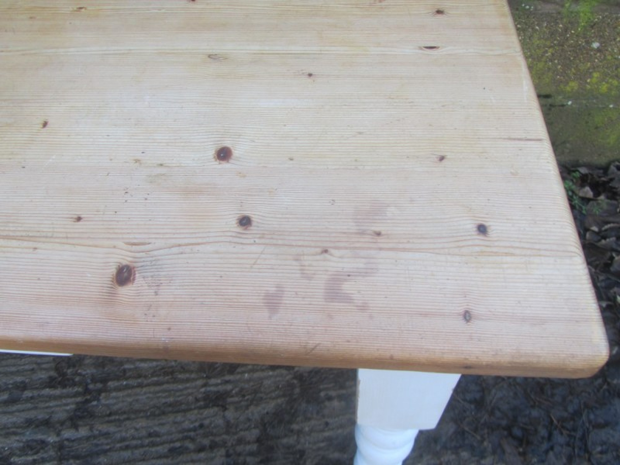 A LARGE SOLID PINE DINING TABLE TO SEAT 4 - 6 DINERS. THE BASE HAS BEEN PAINTED. THE LEGS SCREW IN TO THE TABLE TOP, THEY ARE ALL SLIGHTLY LOOSE. IT NEEDS REPAIRING BEFORE USE.