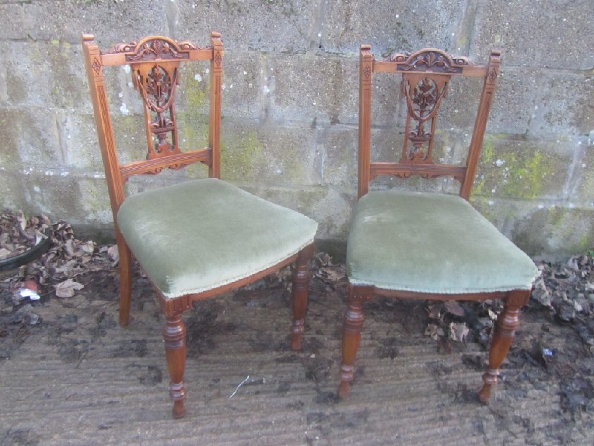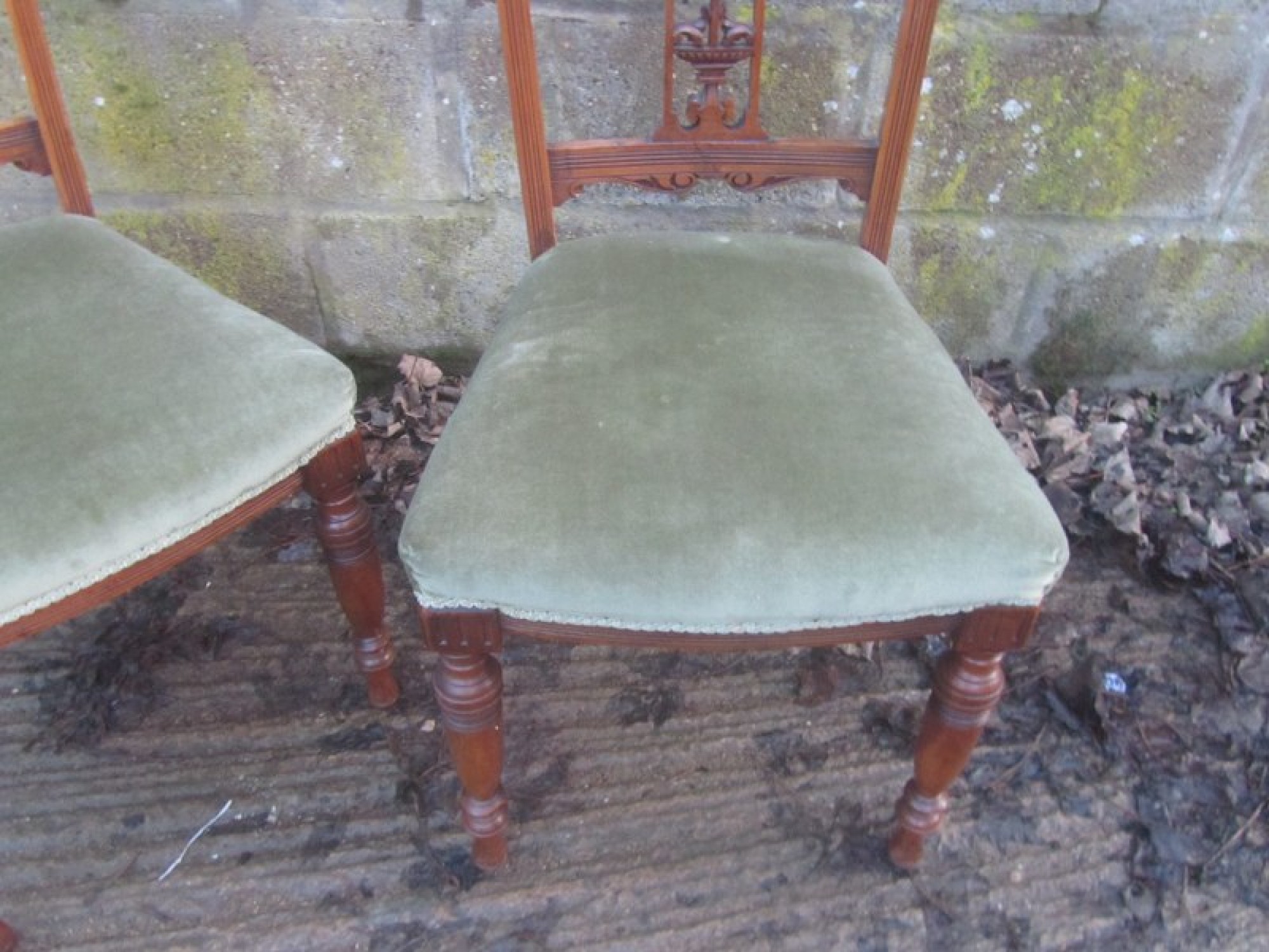 THERE IS DECORATIVE CARVING AT THE TOP OF THE BACK RESTS. THE FRAMES ARE STURDY, MADE FROM SOLID WALNUT. THE UPHOLSTERY IS CLEAN AND IN GOOD CONDITION. IDEAL FOR ANYWHERE IN THE HOME, COULD BE USED AS BEDROOM, HALL OR DINING CHAIRS. HEIGHT TO SEAT IS 46cm.
