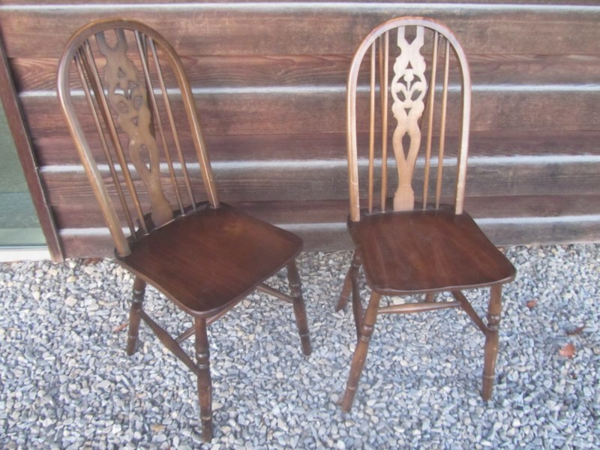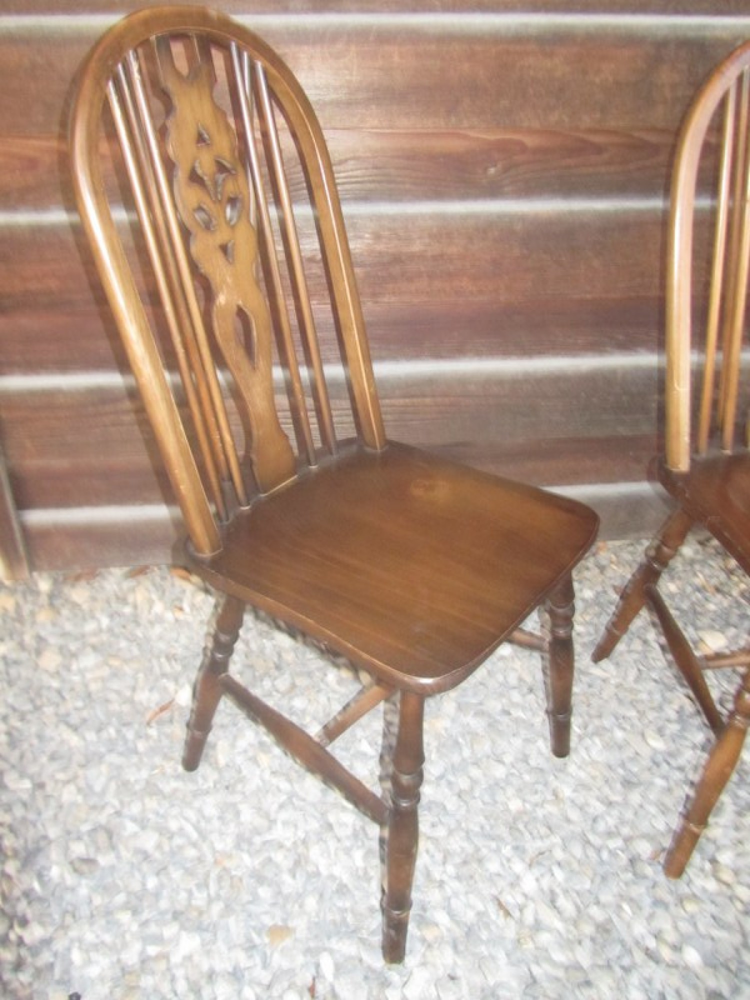 THIS IS A PAIR OF CHAIRS FOR THE KITCHEN OR DINING ROOM. IN A TRADITIONAL FARMHOUSE STYLE WITH A WHEEL BACK. SEAT HEIGHT IS 46cm. IN GOOD CONDITION, STURDY FRAME.