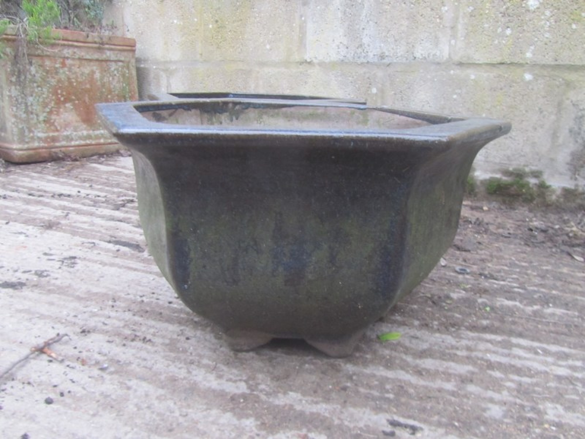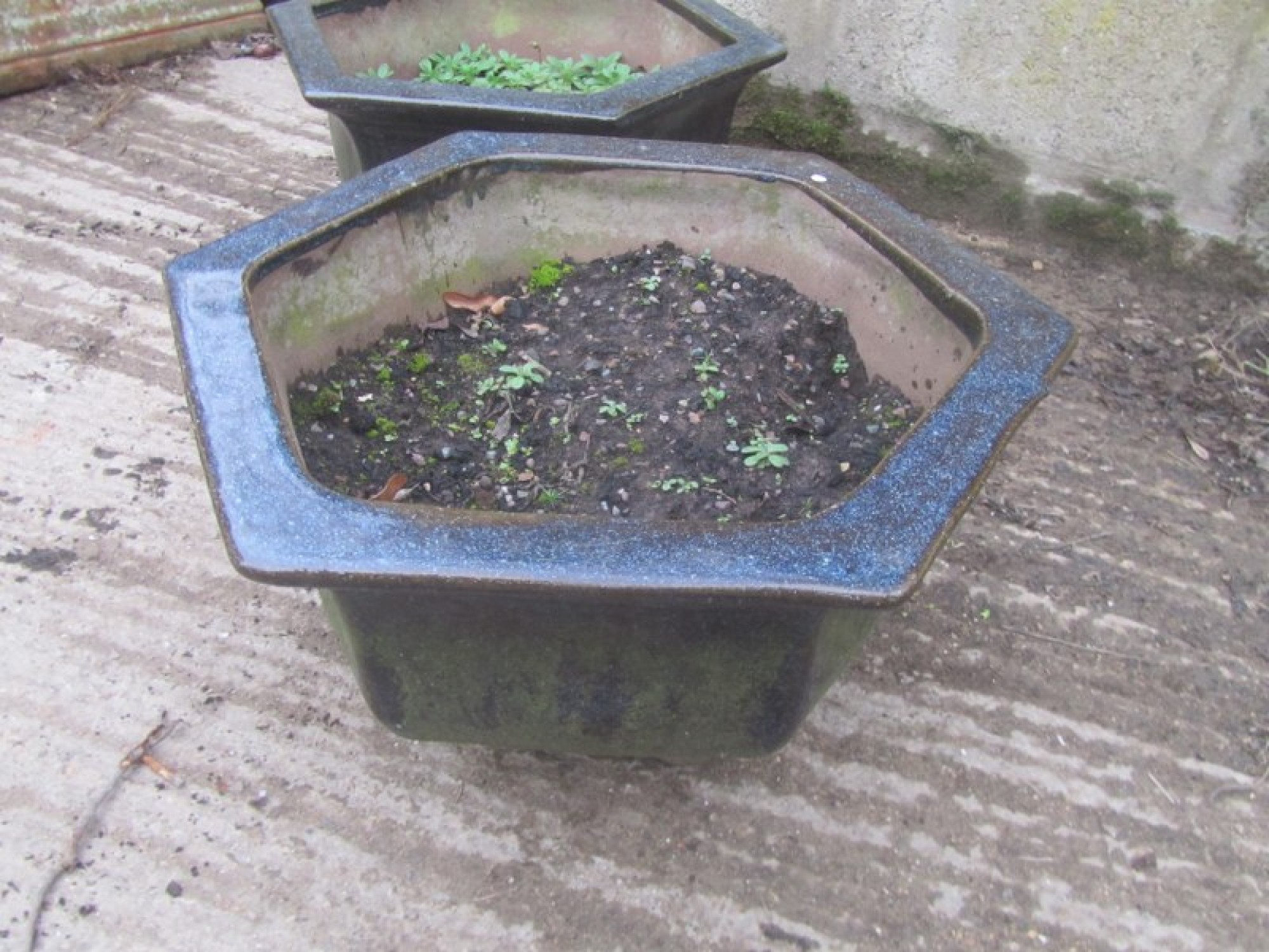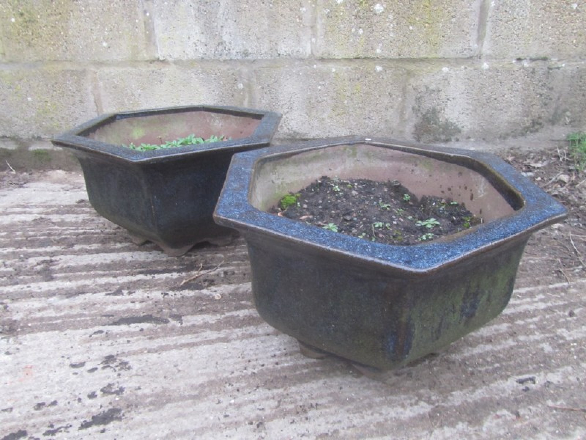 A PAIR OF CERAMIC PLANTERS FOR THE GARDEN, COULD BE USED INSIDE OR OUTSIDE. A MATCHING PAIR.