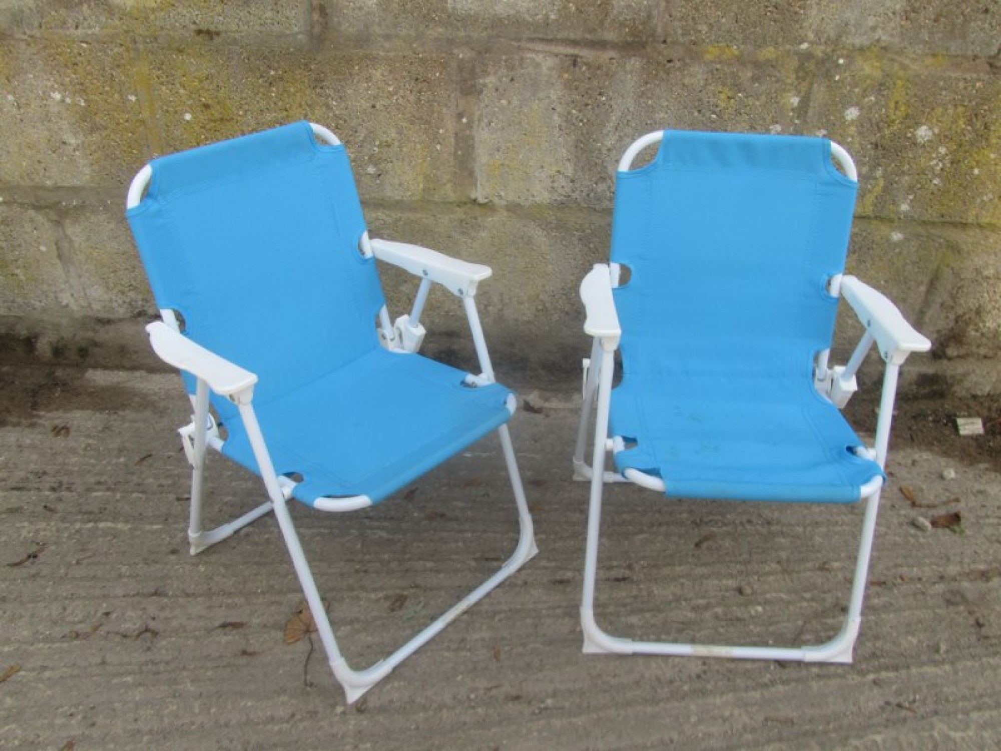 THIS IS A PAIR OF FOLD UP OUTDOOR CHILDRENS CHAIRS. THE FRAMES ARE METAL. THE SEATS ARE MATERIAL. THERE ARE NO TEARS OR DAMAGE, SOME MARKS TO THE MATERIAL. FOR SALE AS A PAIR OF CHAIRS. SEAT HEIGHT IS 27cm.