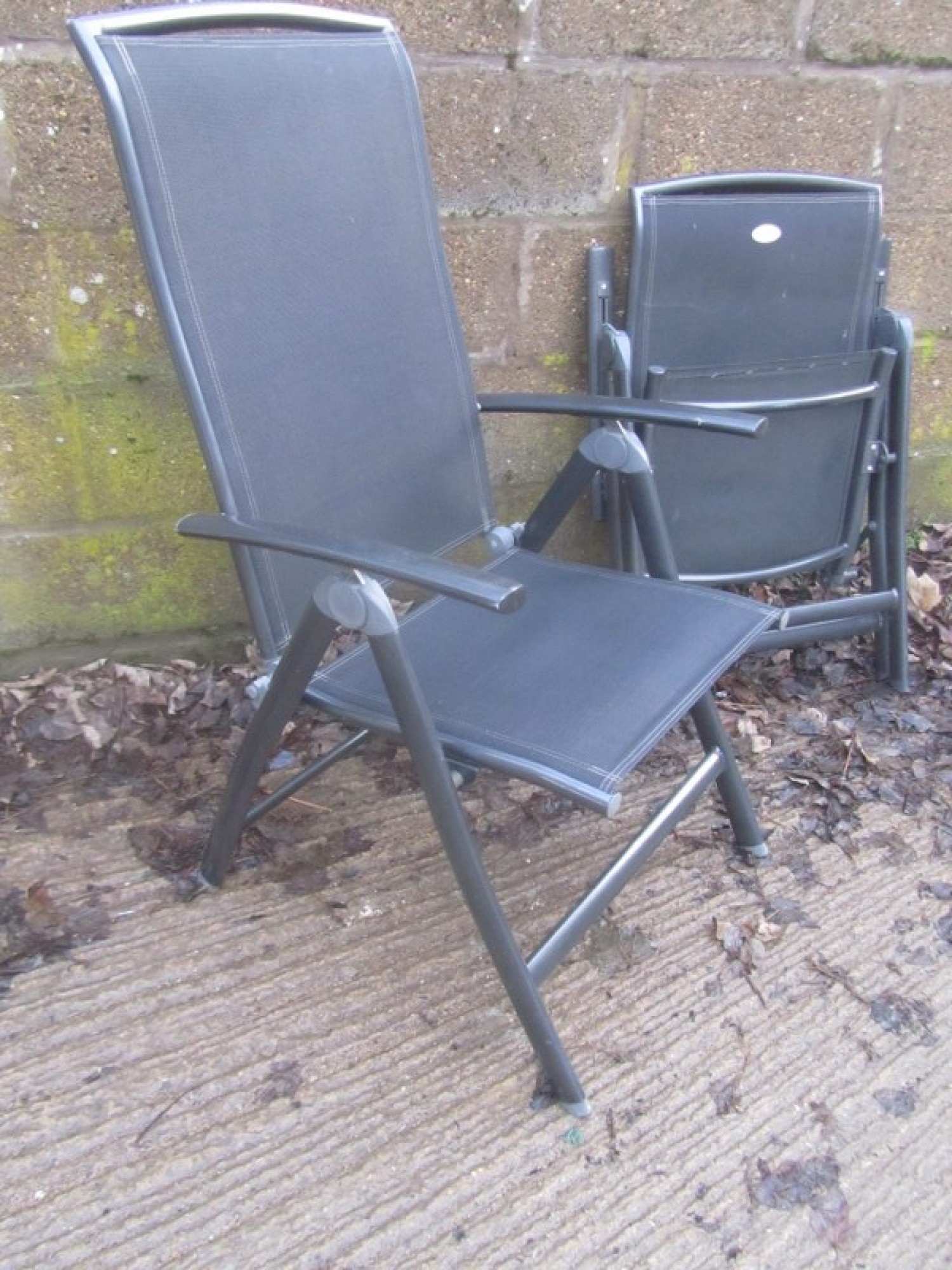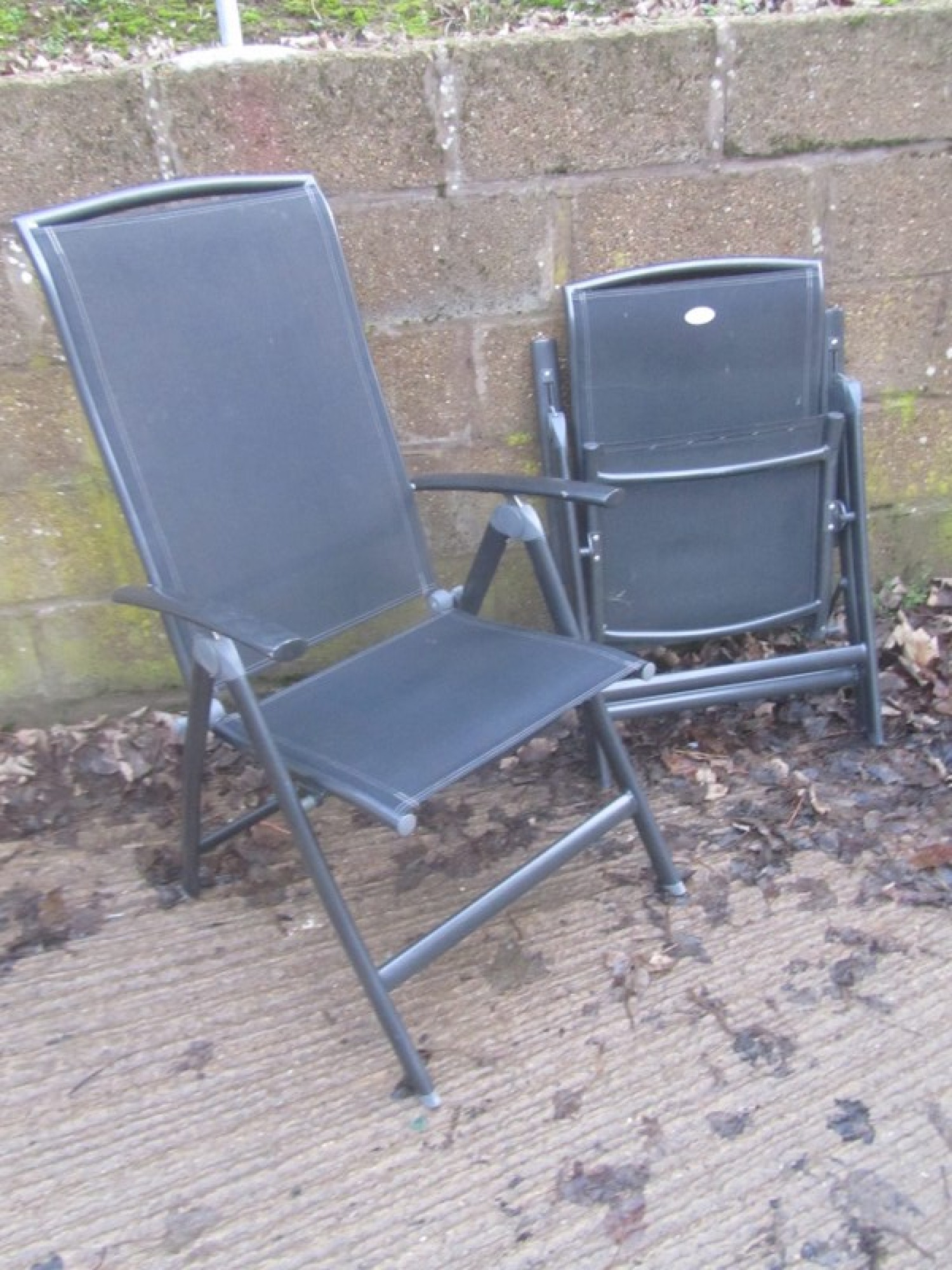 THIS IS A MATCHING PAIR OF FOLD UP OUTDOOR CHAIRS. THE FRAMES ARE METAL. THE SEATS ARE MATERIAL. THERE ARE NO TEARS OR DAMAGE, GOOD CONDITION. FOR SALE AS A PAIR OF CHAIRS. SEAT HEIGHT IS 47cm.