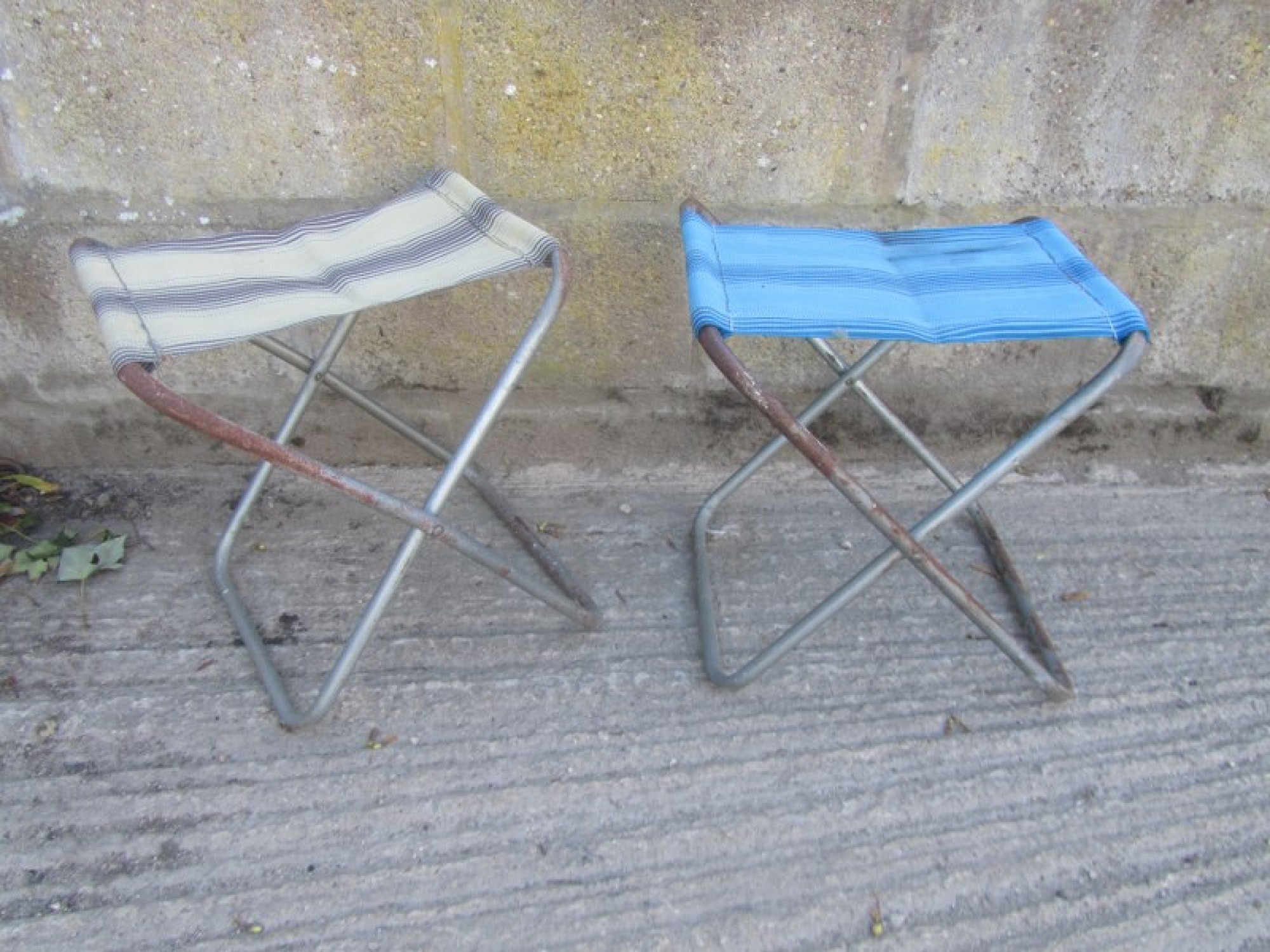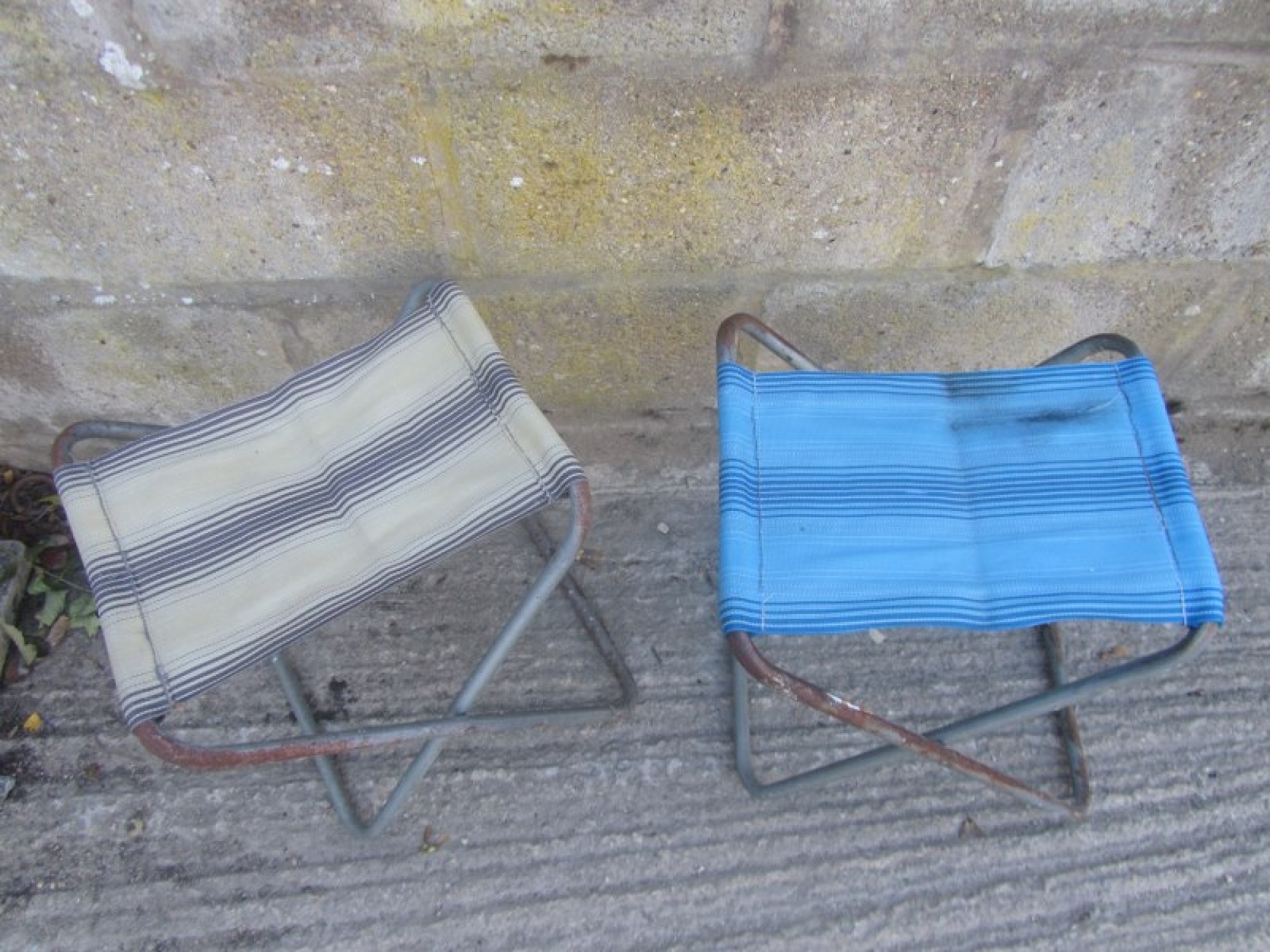 THIS IS A PAIR OF RETRO STOOLS. RUSTY METAL FRAMES. THE TOPS ARE MATERIAL. EASY TO RECOVER. THE FRAMES ARE STURDY.