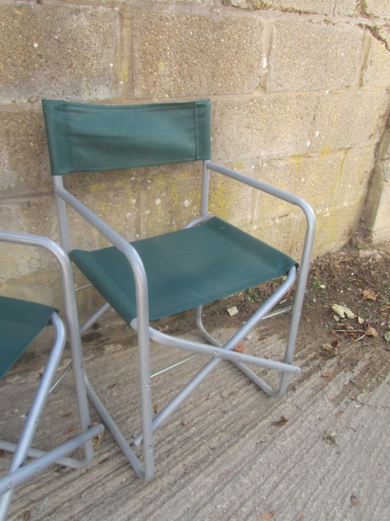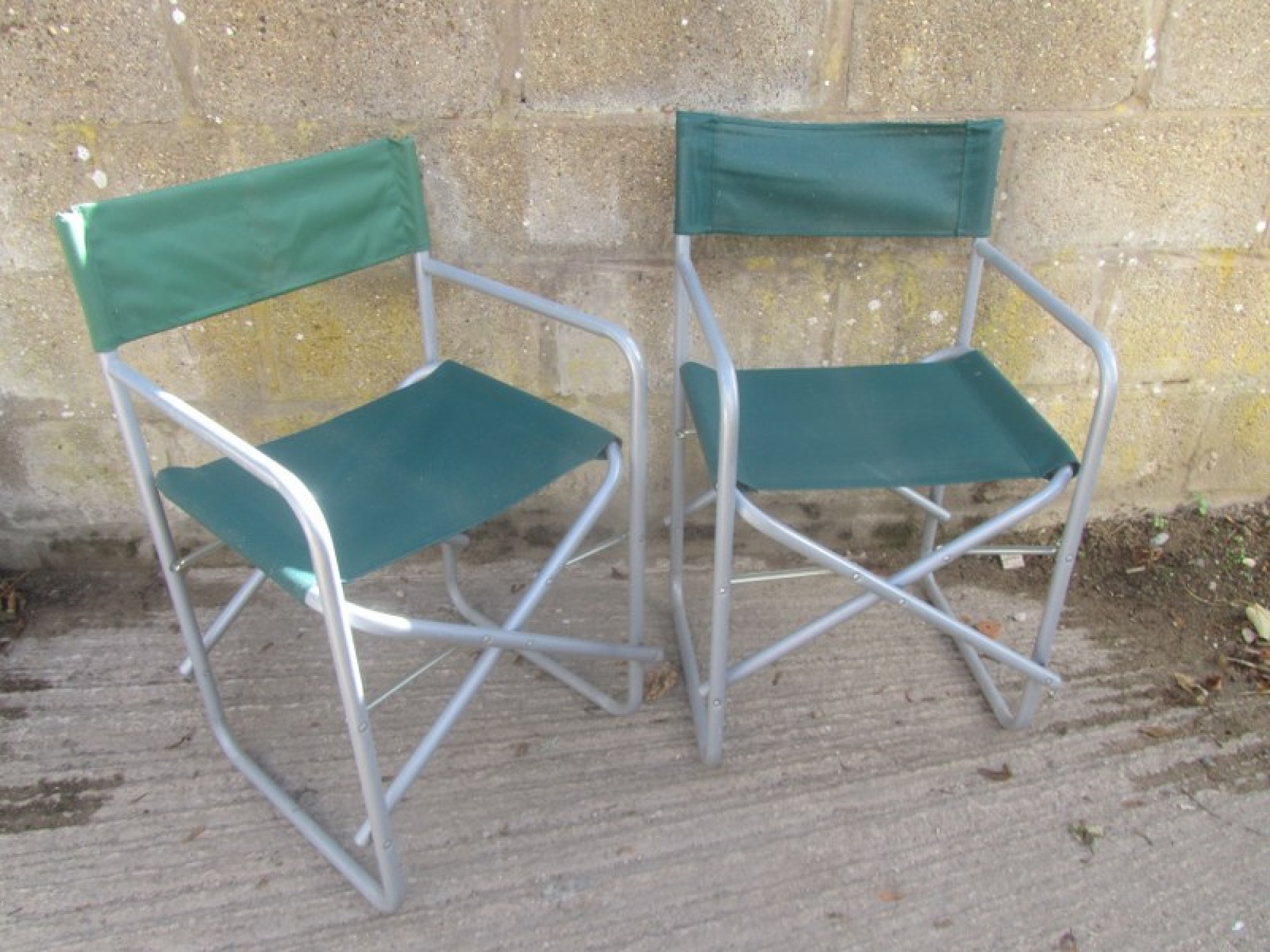 A PAIR OF DIRECTORS CHAIRS WITH FOLD UP METAL FRAME AND CANVAS MATERIAL. THE BACK RESTS ARE DIFFERENT. THEY HAVE BEEN IN STORAGE FOR YEARS AND NEED A CLEAN. SEAT HEIGHT - 47cm.