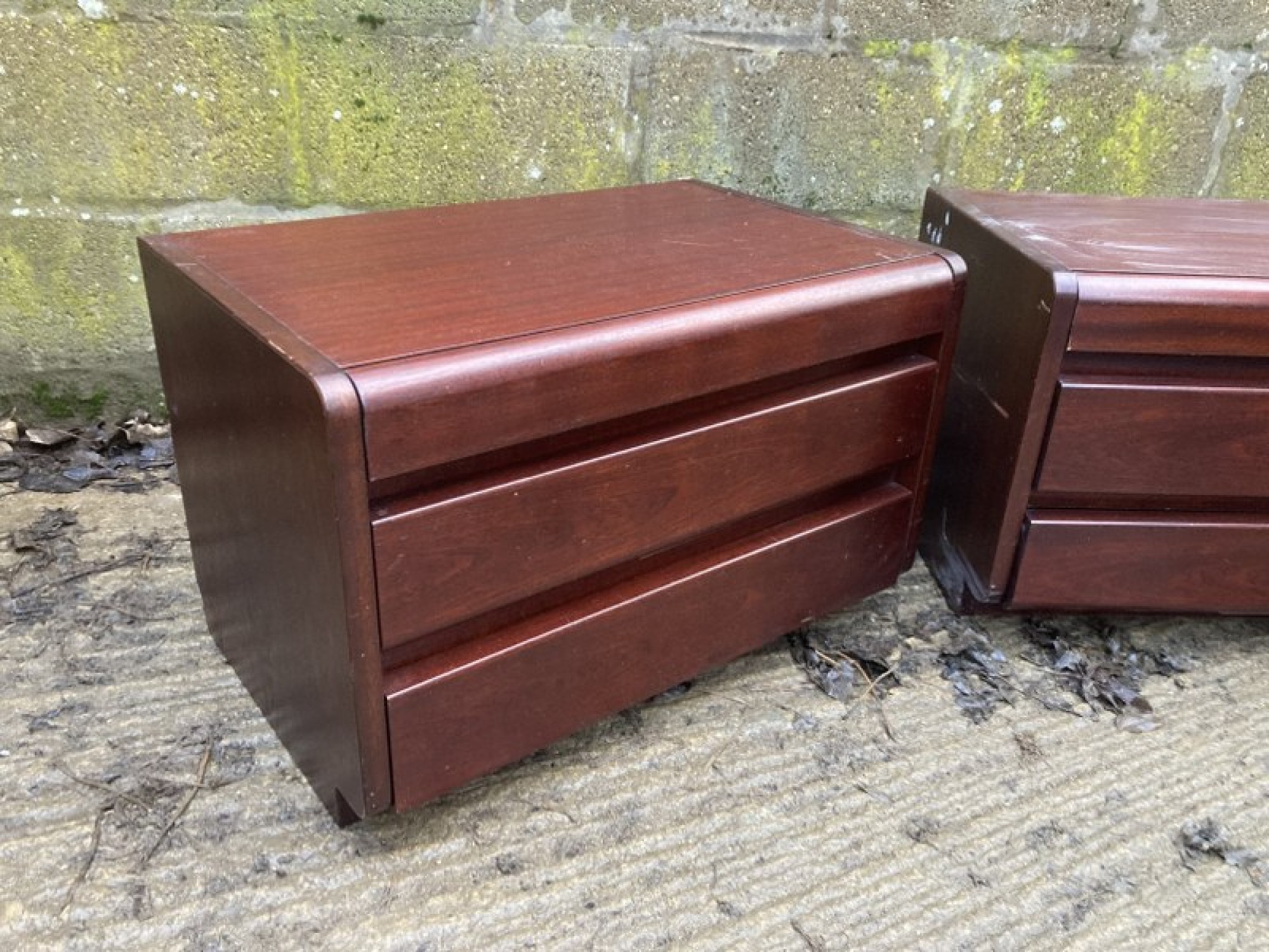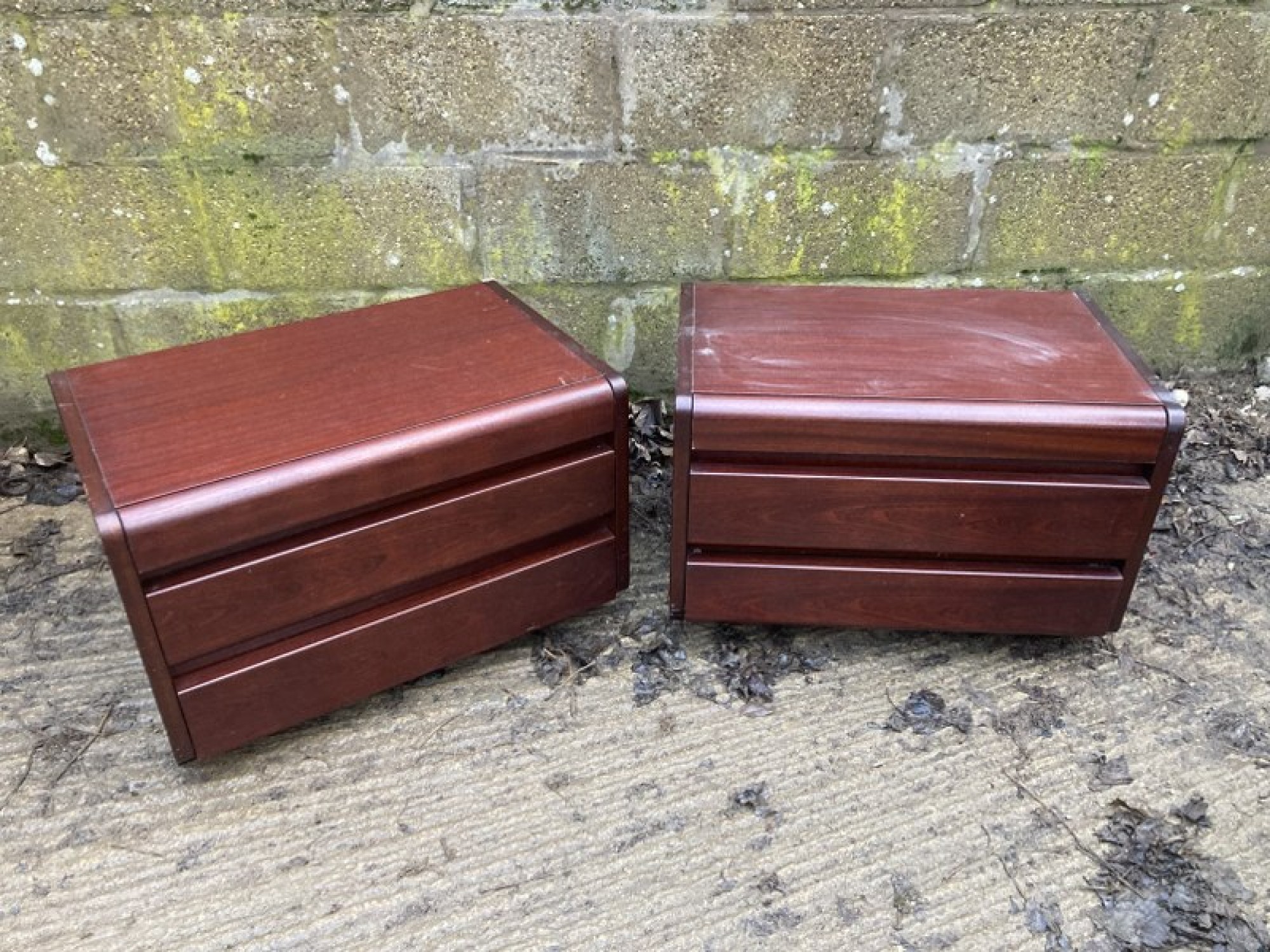 A PAIR OF BEDSIDE CABINETS. THE DRAWERS RUN SMOOTHLY. IN A MAHOGANY VENEER. SOME WEAR, AVERAGE CONDITION.