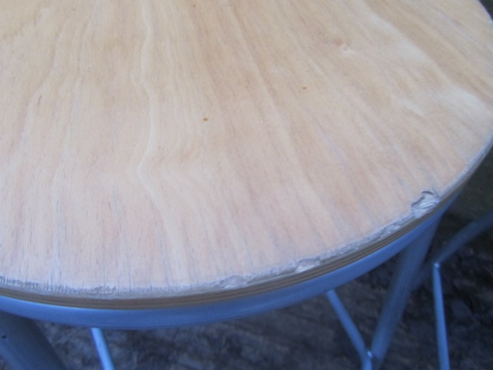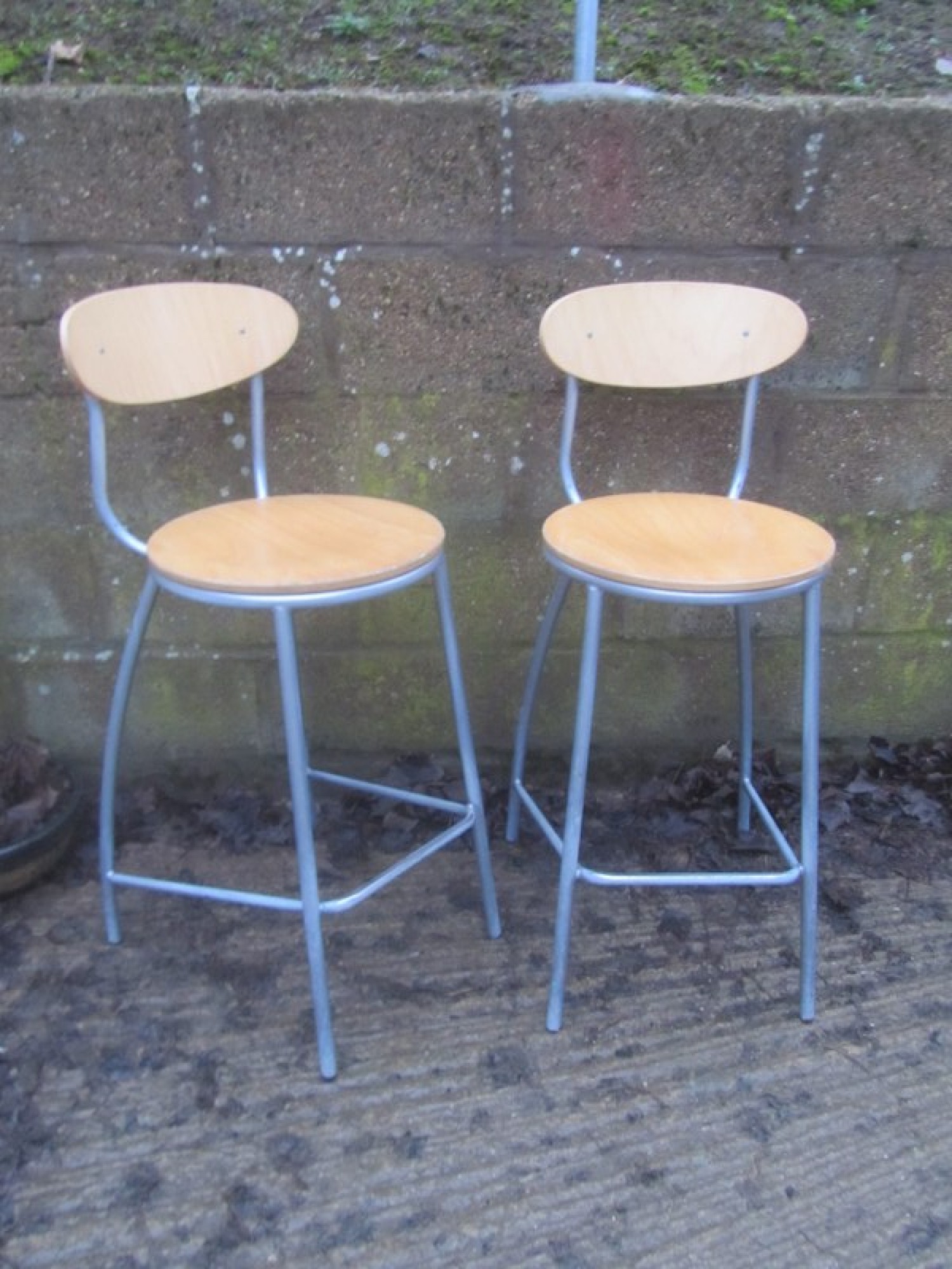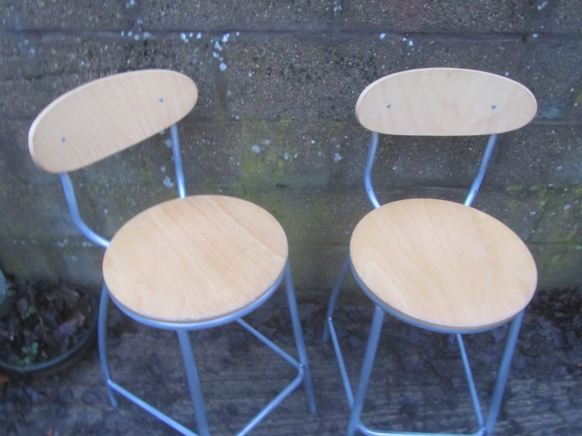 THIS IS A PAIR OF TALL STOOLS. METAL FRAMES, BEECH VENEERED SEATS. STURDY. SOME VENEER CHIPS. SEAT HEIGHT IS 71cm.