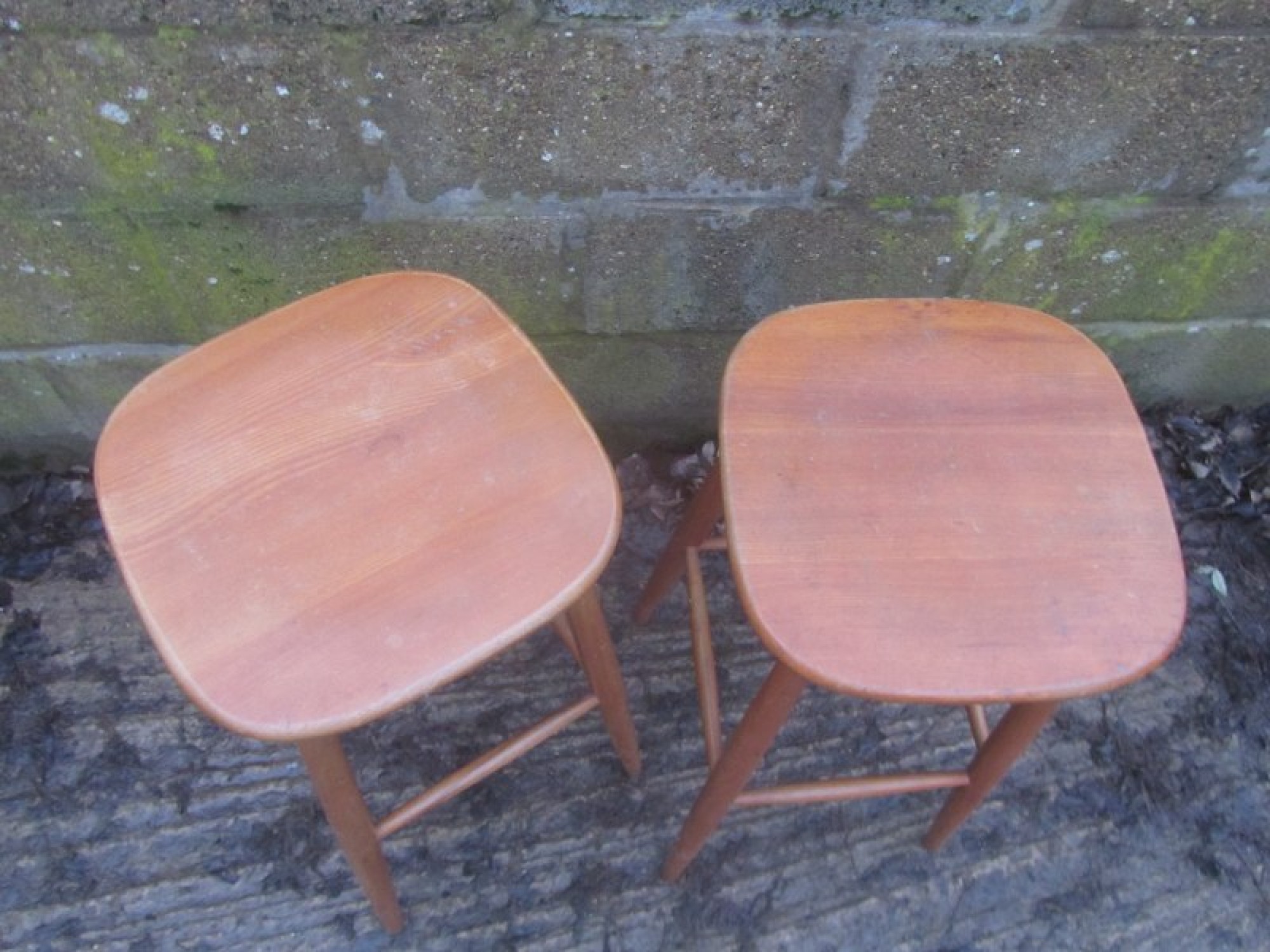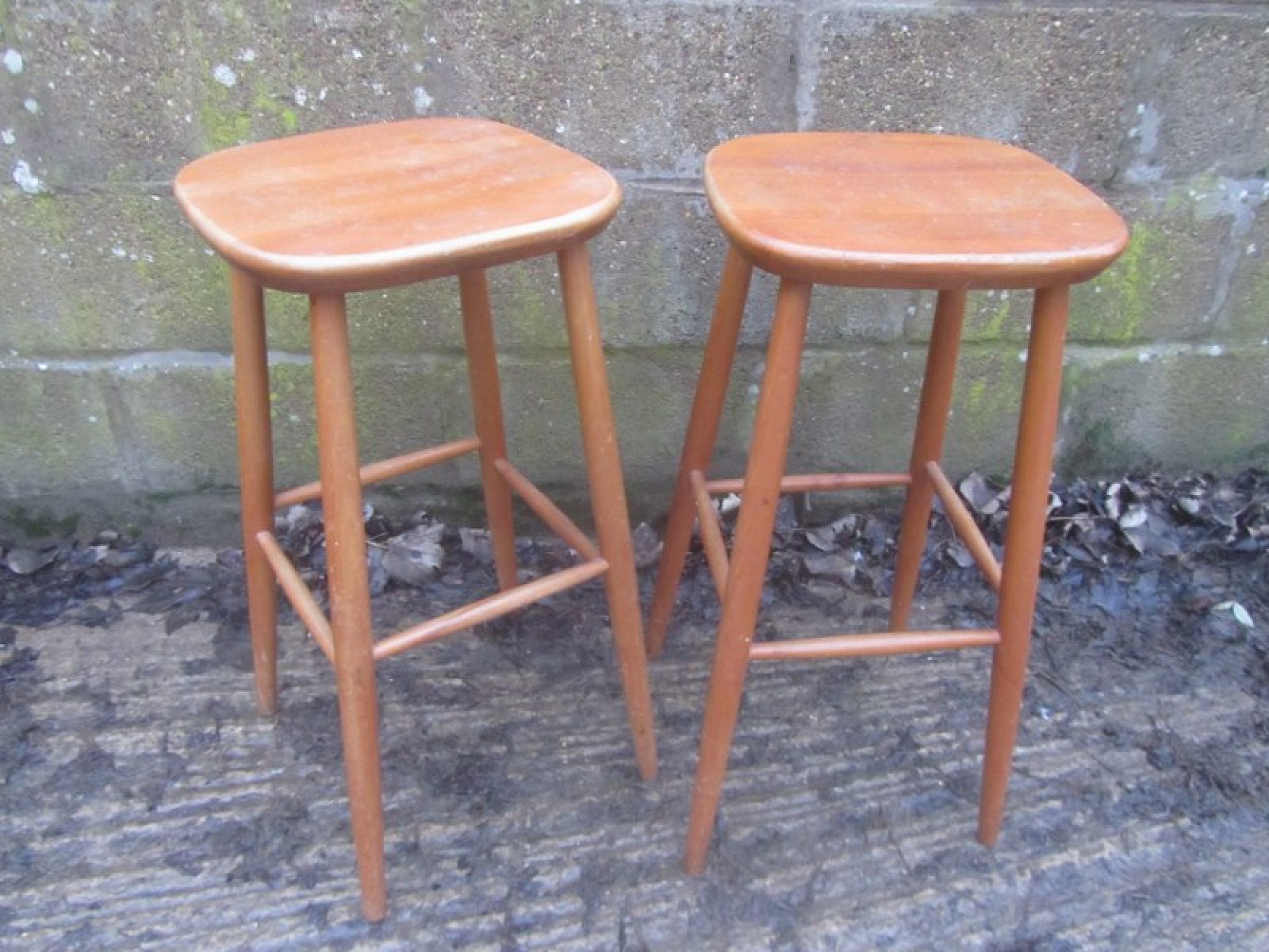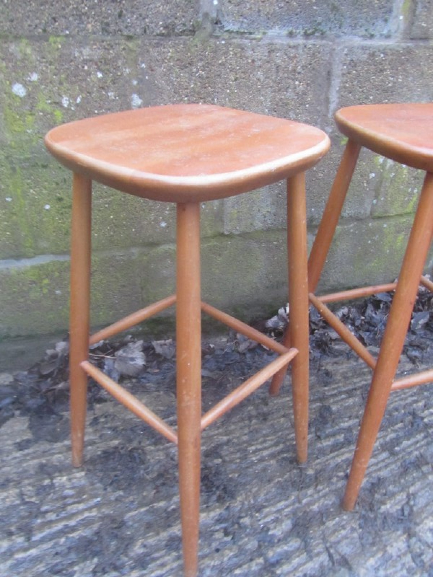 THIS IS A PAIR OF TALL STOOLS. SOLID BEECH WOOD FRAMES AND AN OAK SEAT, STURDY.