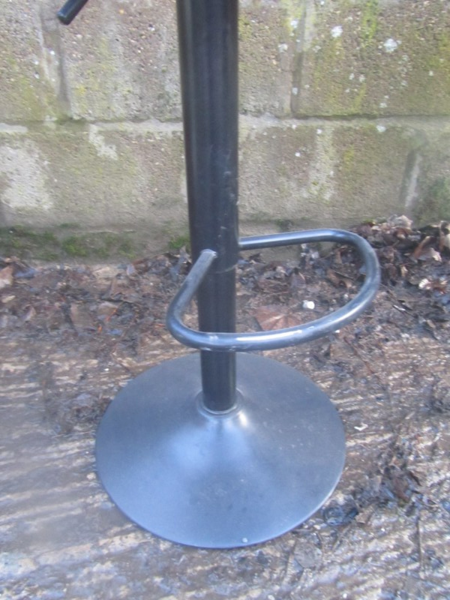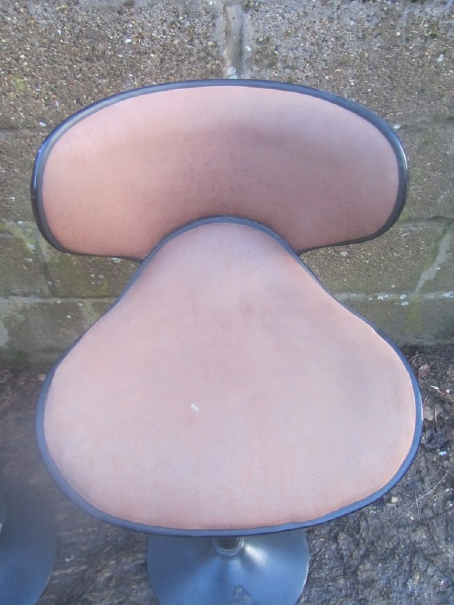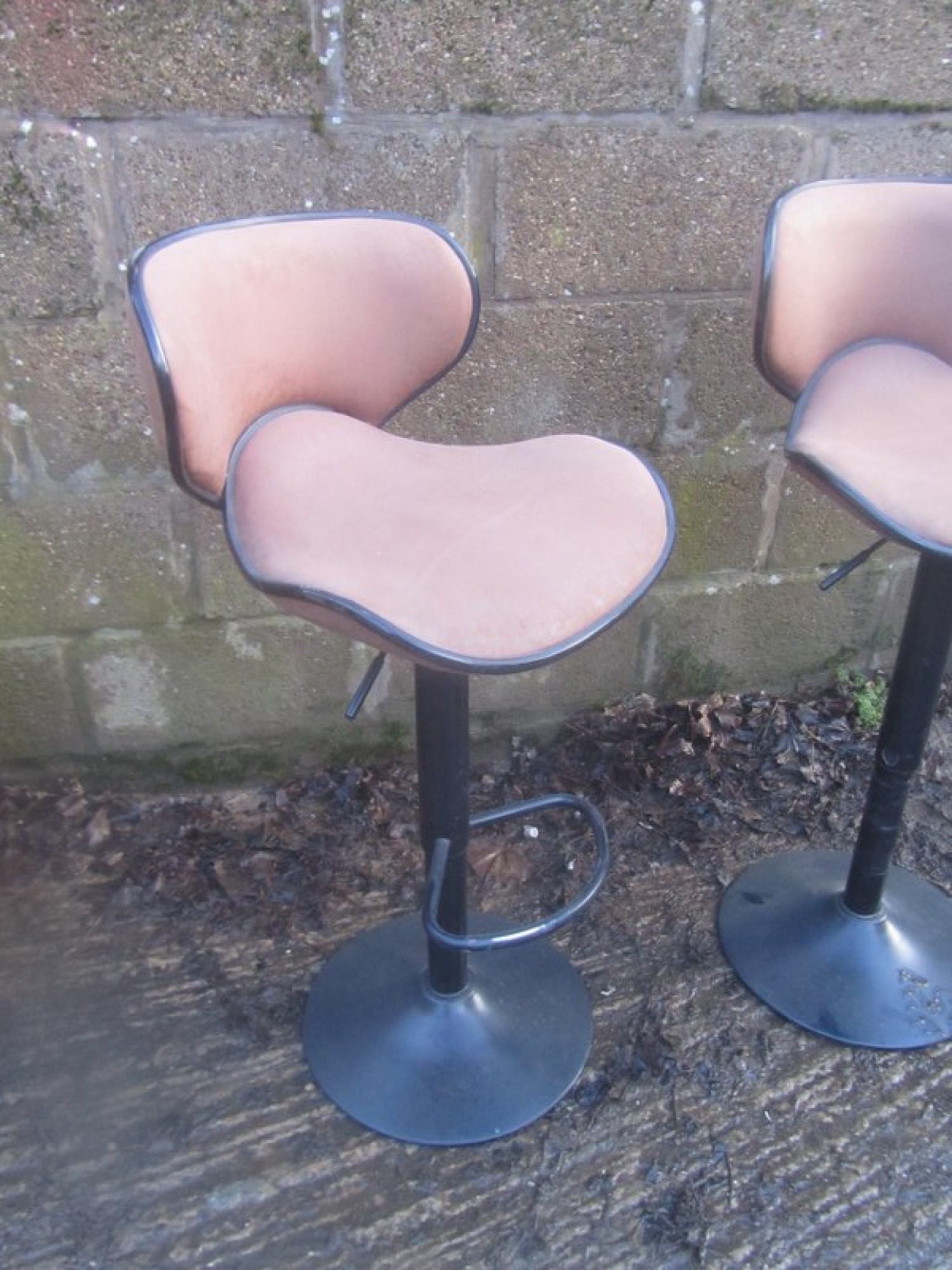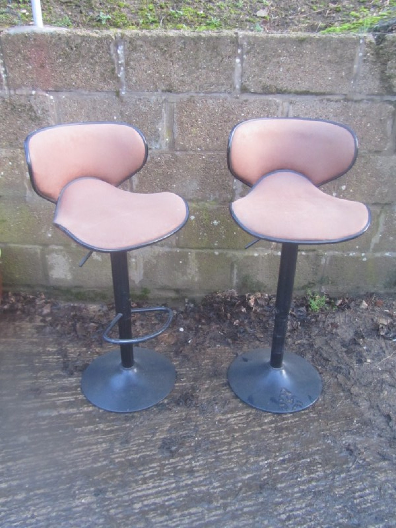 THIS IS A PAIR OF TALL STOOLS. METAL FRAMES, BROWN SUEDE PADDED SEATS. STURDY. GAS LIFT FOR ADJUSTABLE HEIGHT. SEAT HEIGHT IS 60cm - 73cm.