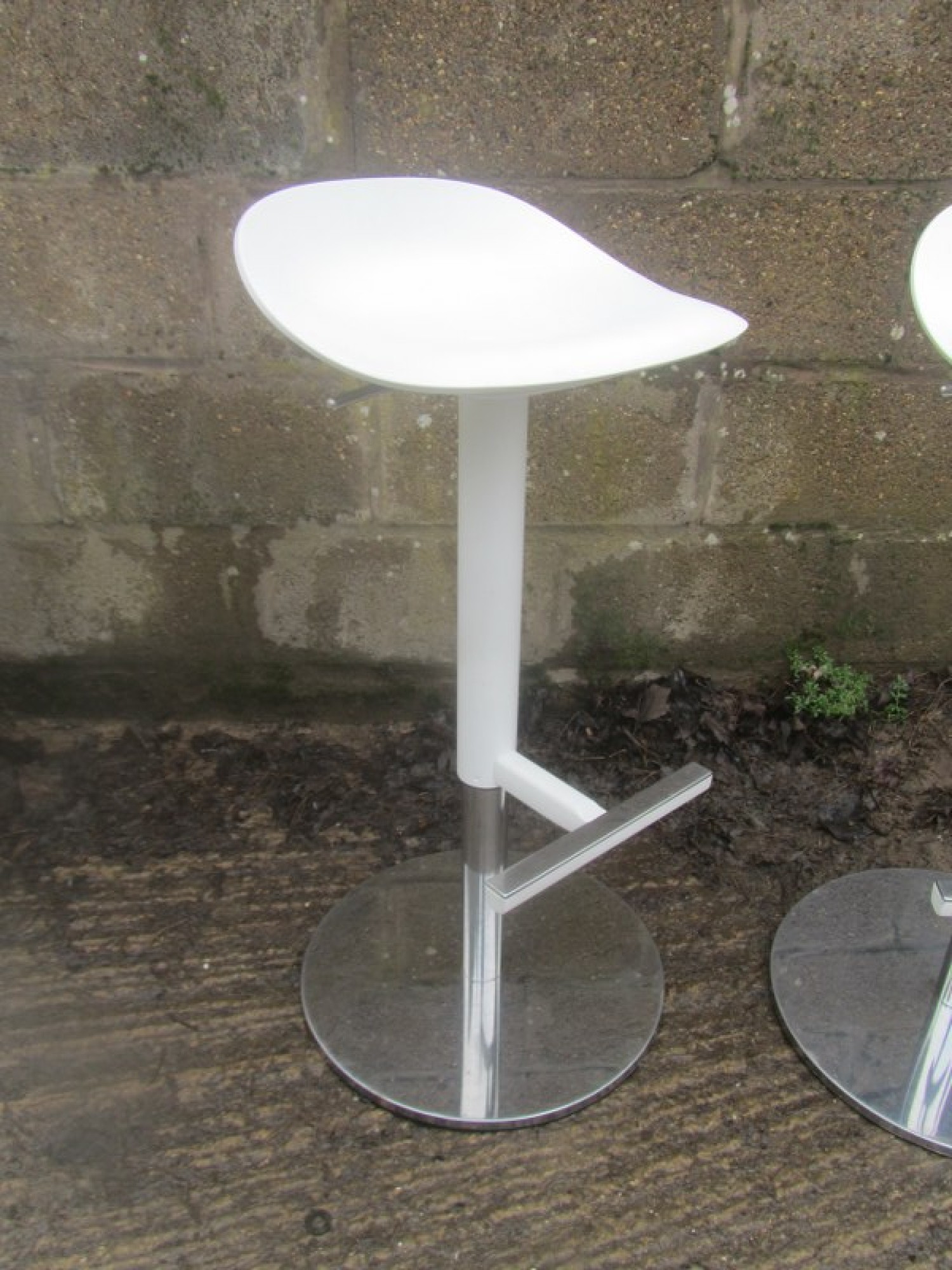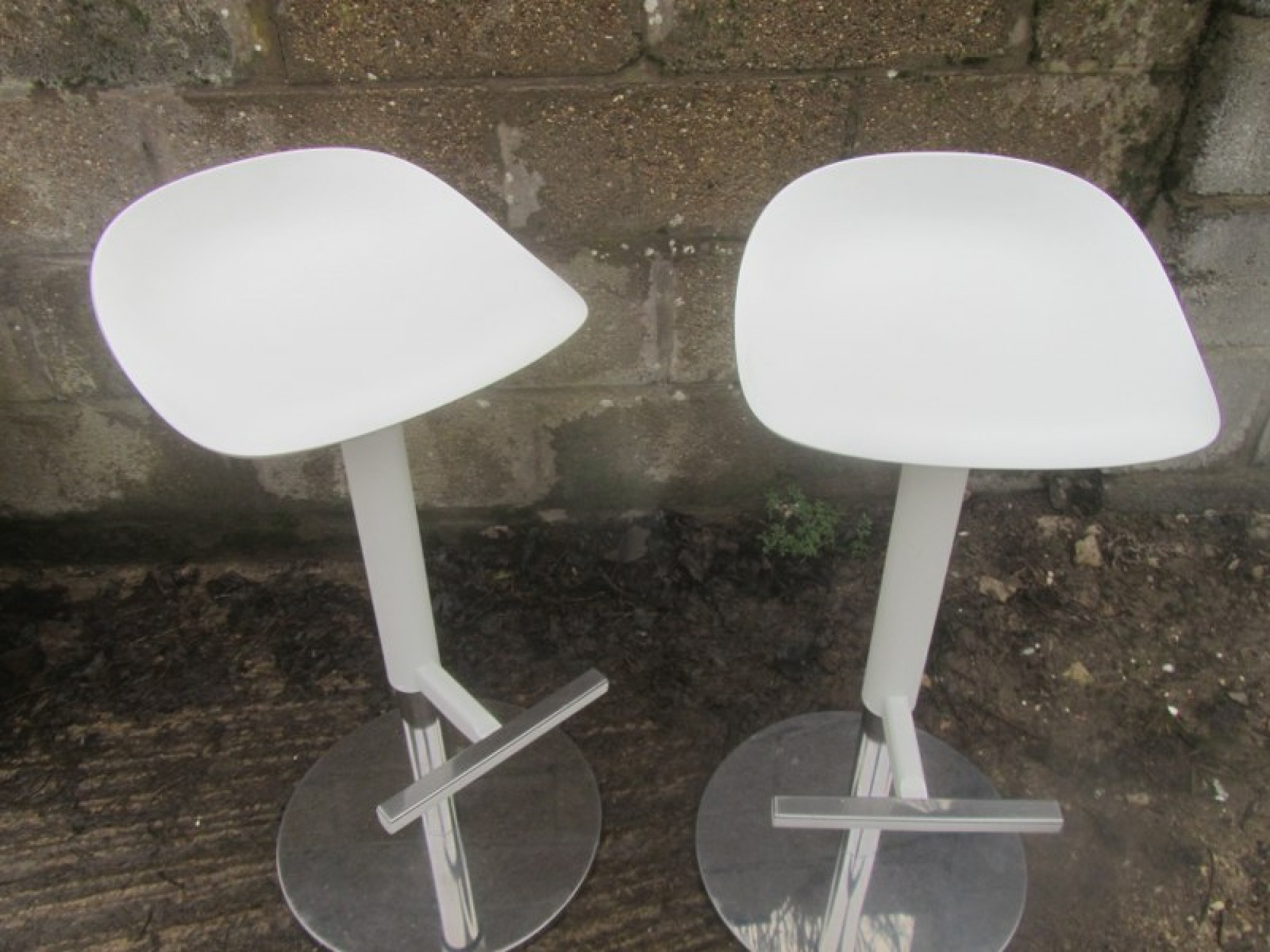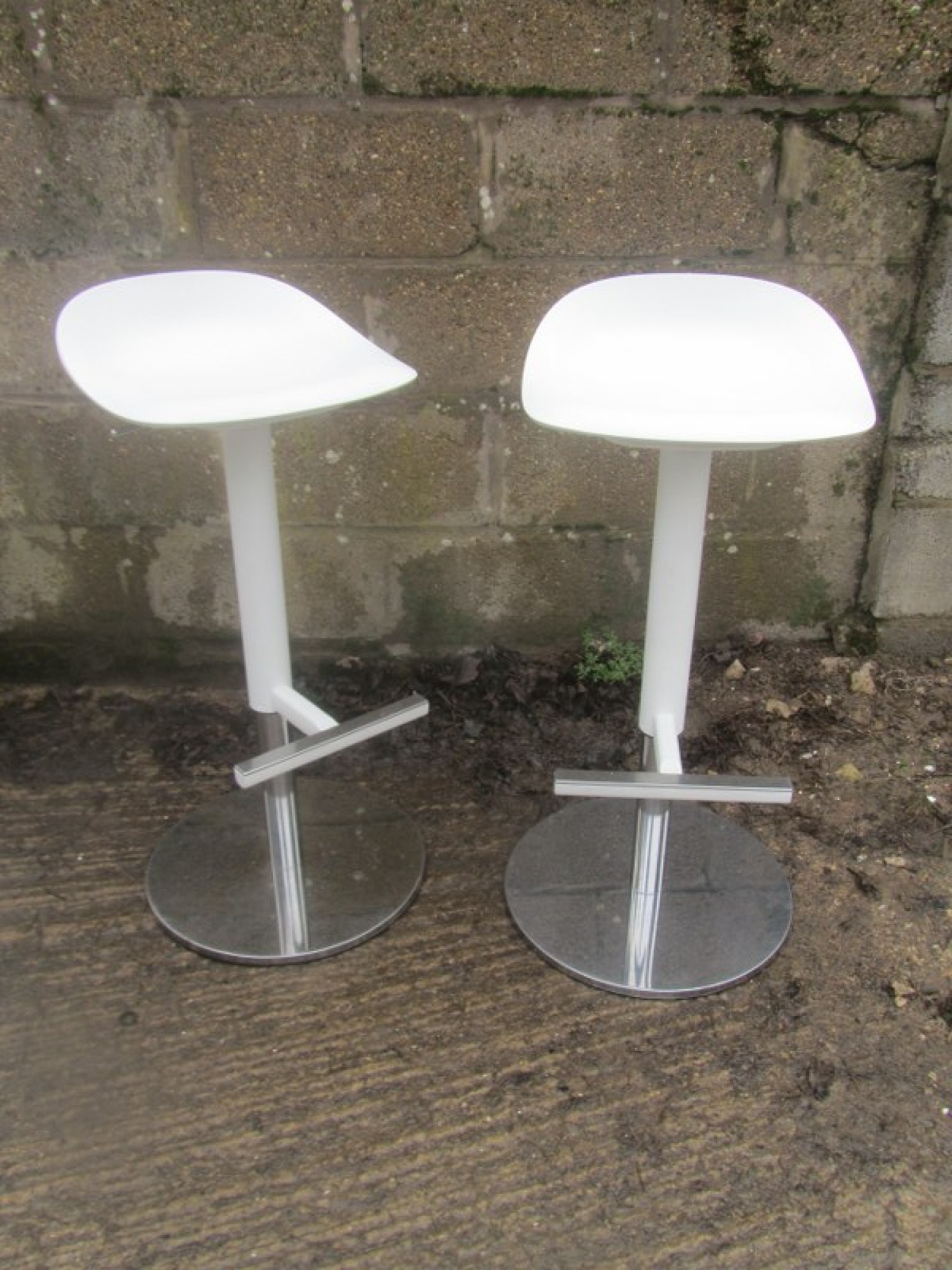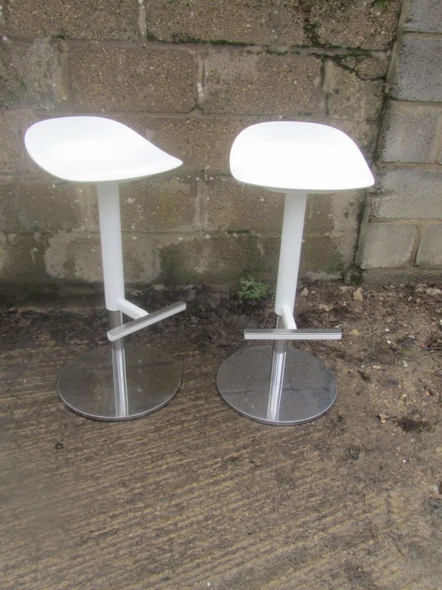 THIS IS A PAIR OF TALL STOOLS. METAL CHROME FRAMES, HARD WHITE PLASTIC SEATS. STURDY. GAS LIFT FOR ADJUSTABLE HEIGHT. SEAT HEIGHT IS 57cm - 76cm.