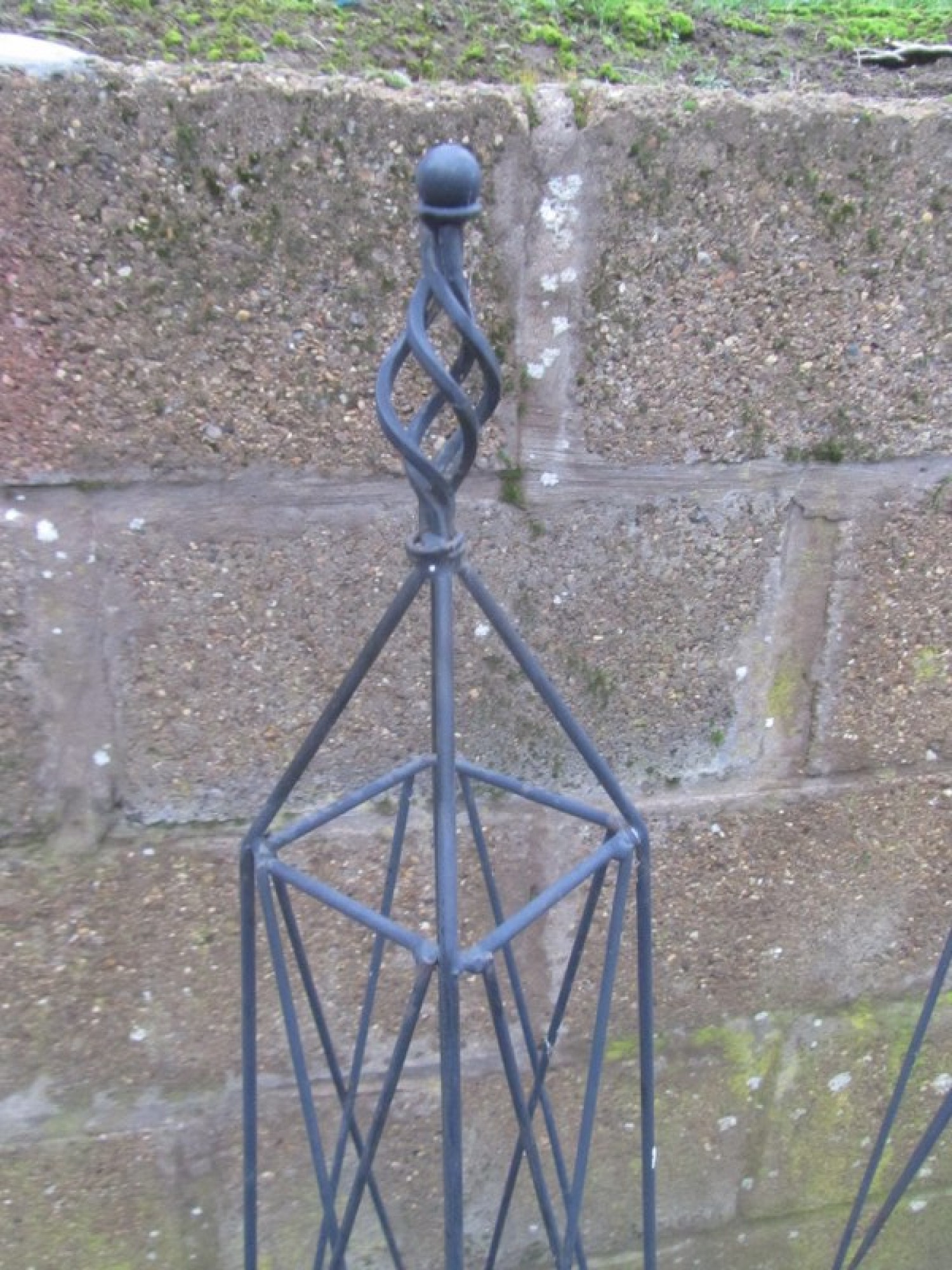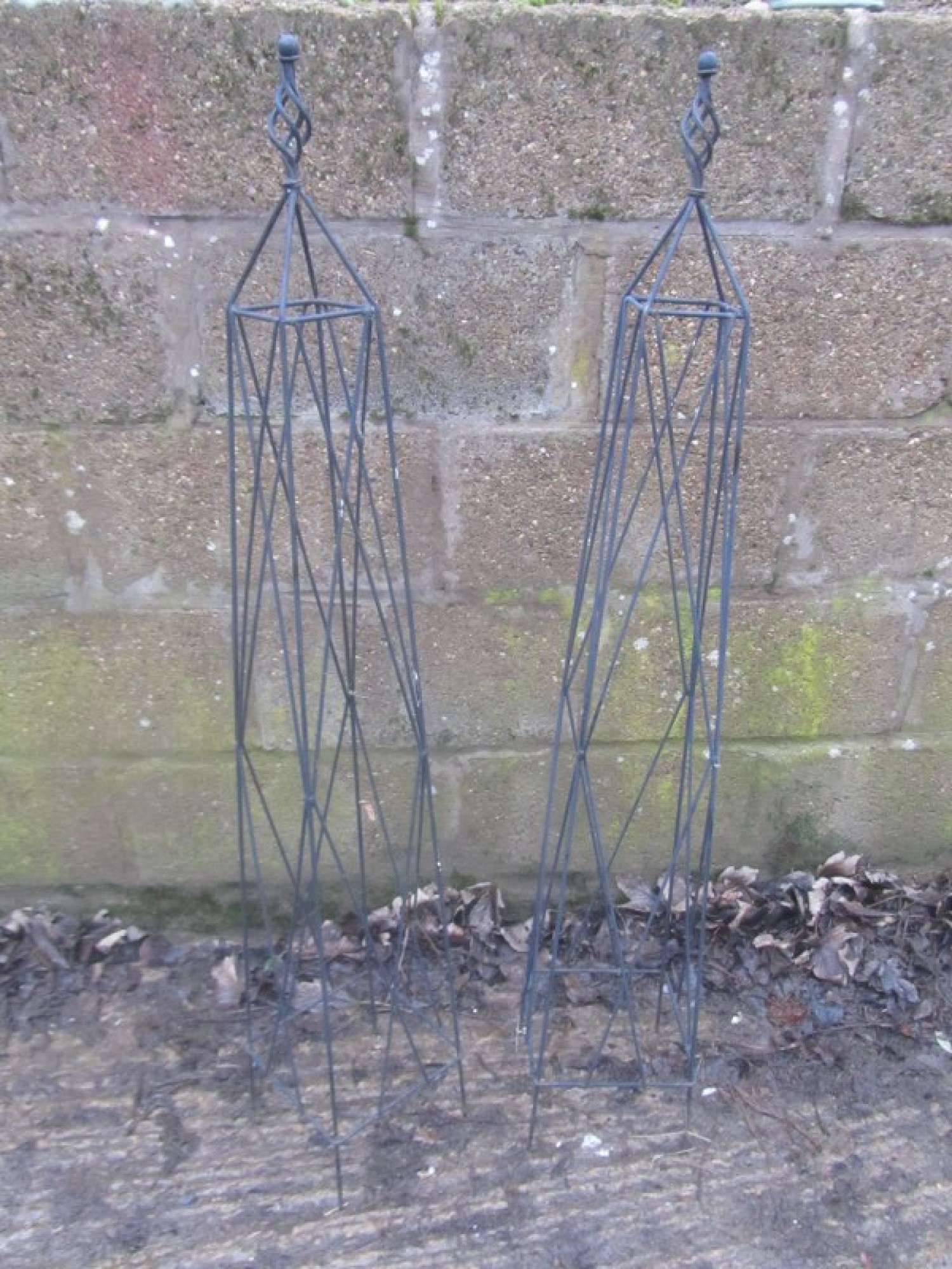 A PAIR OF TALL METAL GARDEN OBELISKS. SOME RUST AND WEAR.