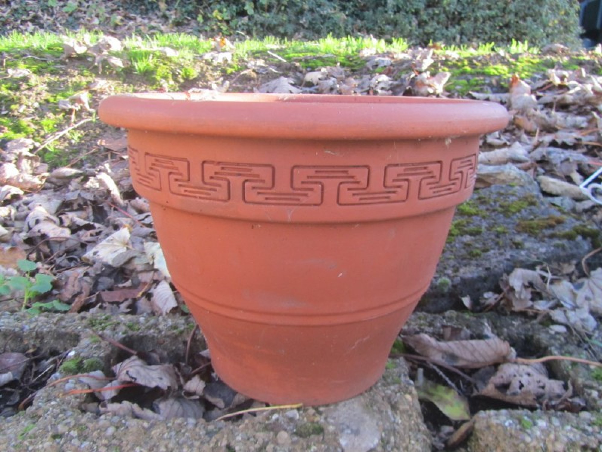 A ROUND TERRACOTTA PLANTER FOR THE GARDEN. COULD BE USED INSIDE OR OUTSIDE. WEATHERED.