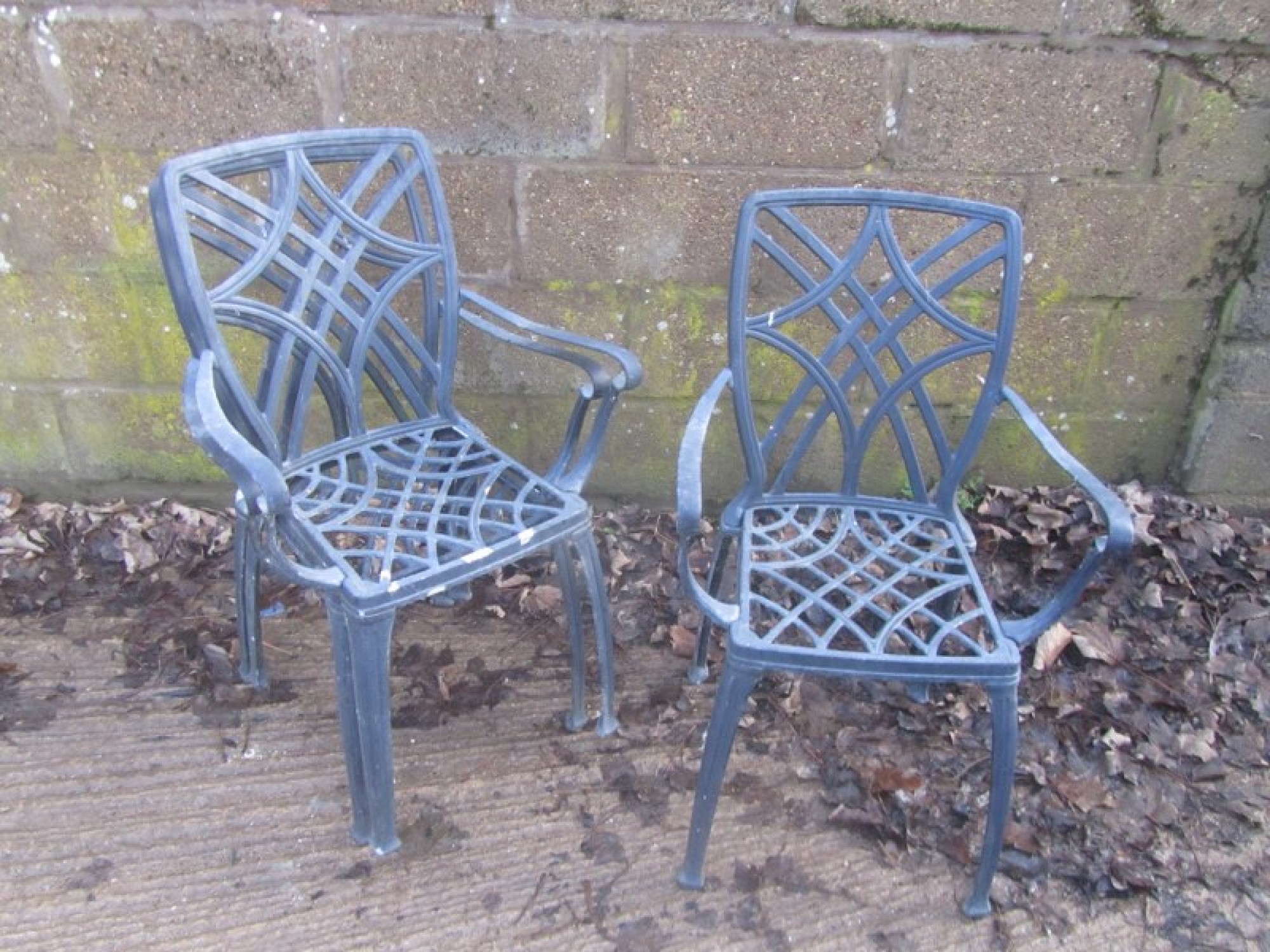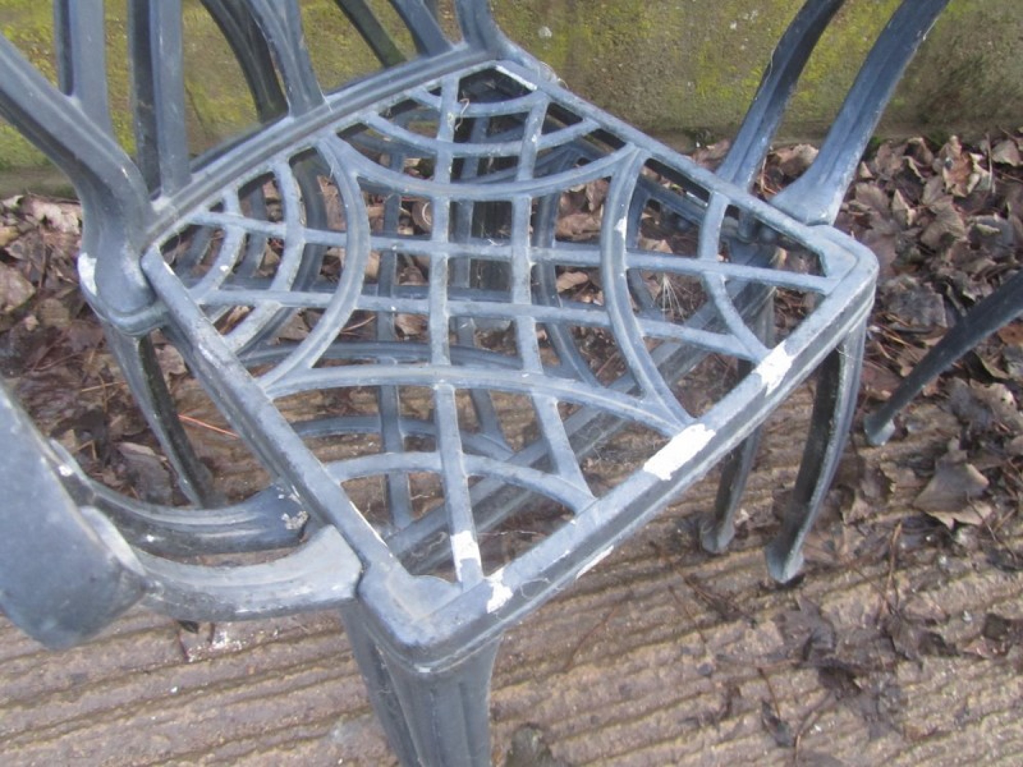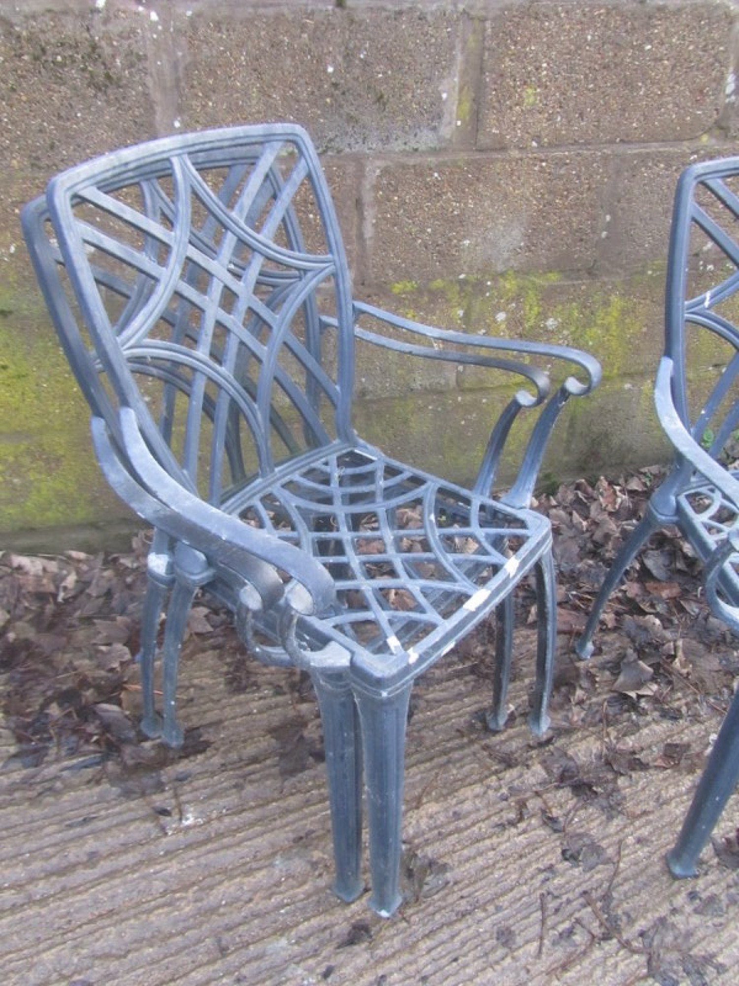 A SET OF 3 METAL OUTDOOR / GARDEN CHAIRS IN A FADED GREY FINISH. SOME WEAR, GREAT SHAPE.