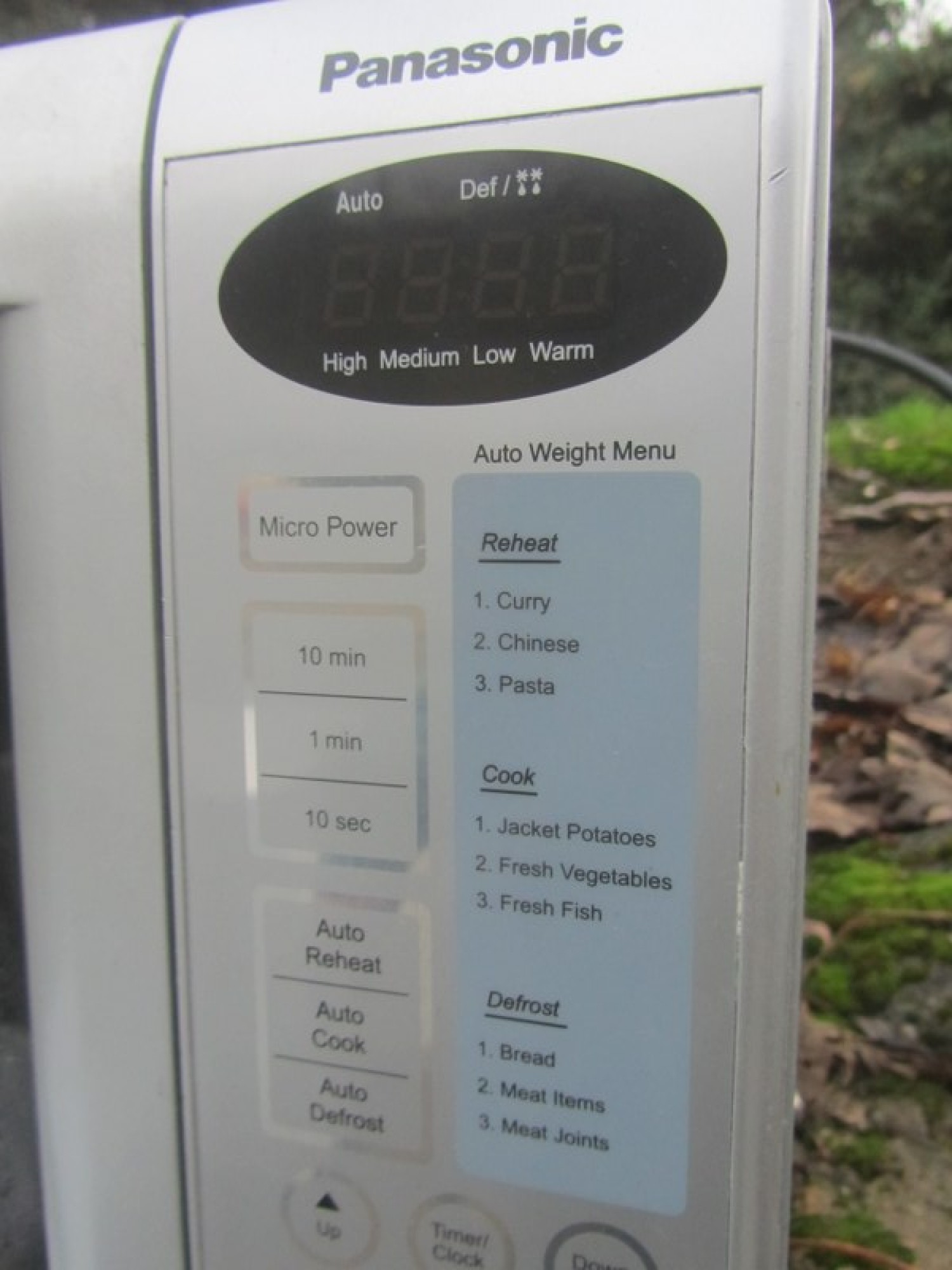A SILVER MICROWAVE WITH SIMPLE CONTROLS. NO INSTRUCTIONS. IT NEEDS A CLEAN.