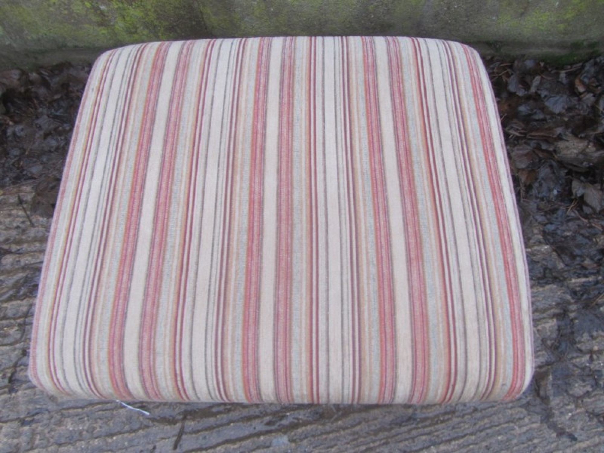 A LARGE FOOTSTOOL WITH A PADDED TOP, WOODEN LEGS AND BRASS CASTORS. THE STOOL IS IN A MODERN STYLE. GOOD CLEAN CONDITION.