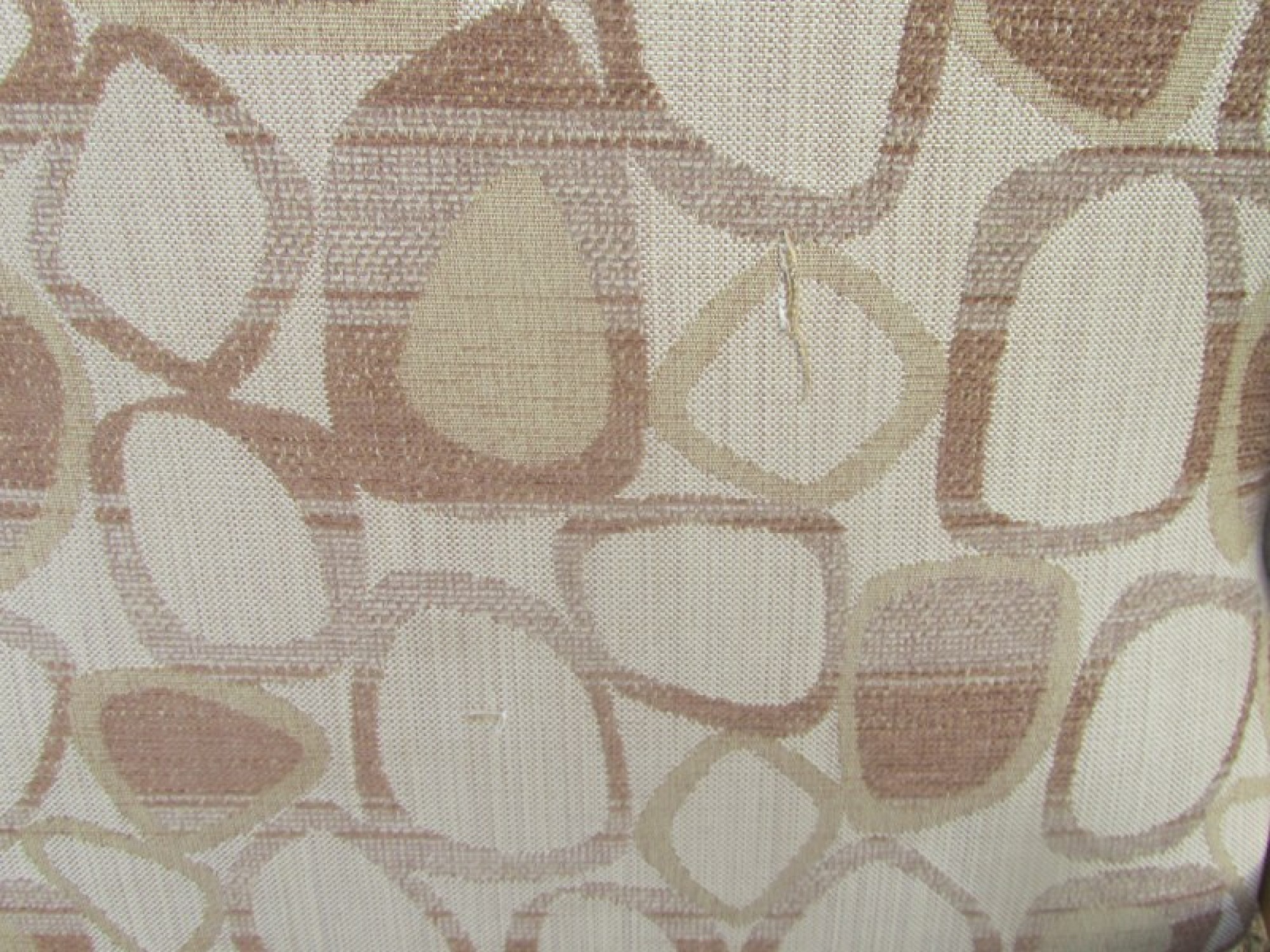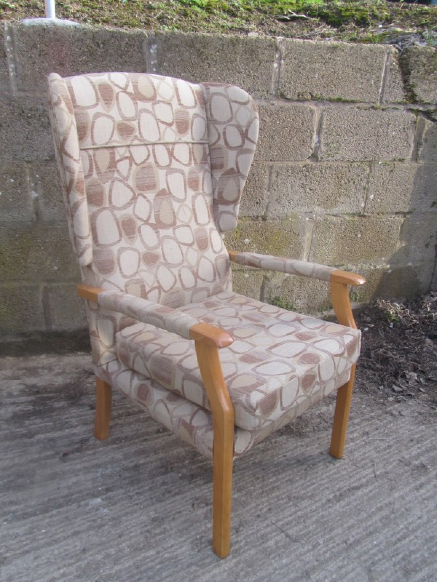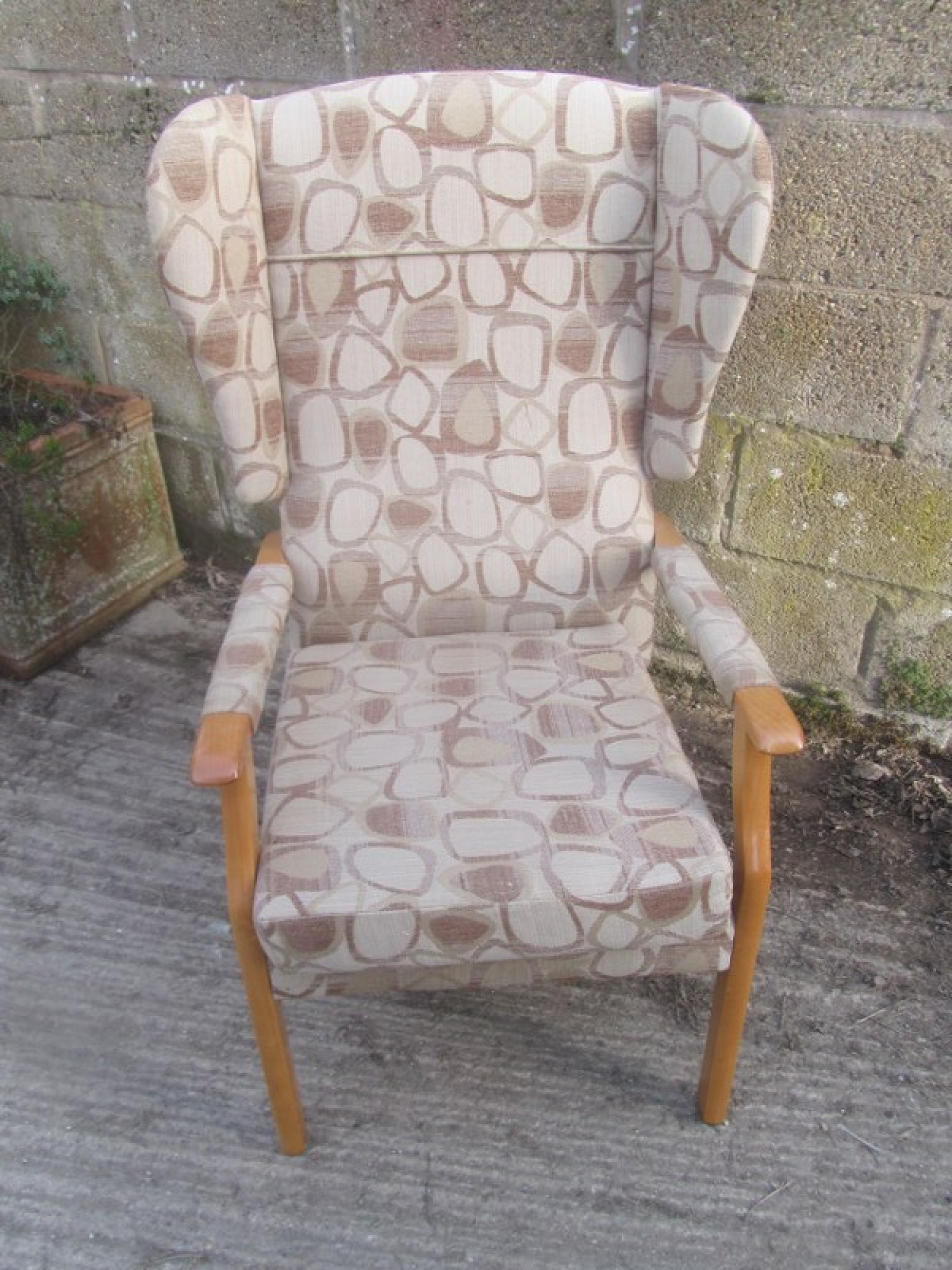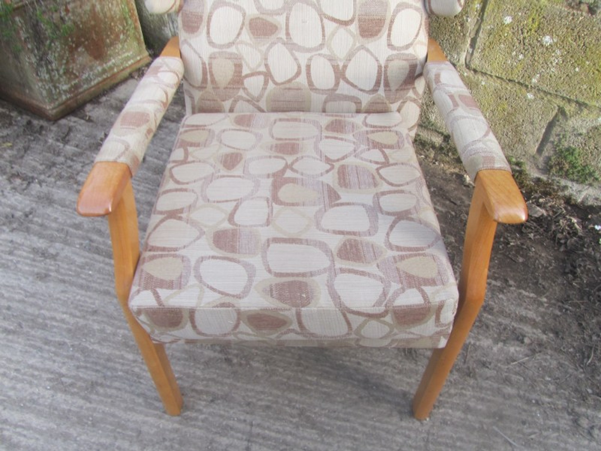 AN UPRIGHT CHAIR. FIRM AND COMFORTABLE. THE CHAIR STANDS ON 4 WOODEN LEGS. THE FRAME IS STRONG AND STURDY. THE CHAIR IS UPHOLSTERED IN MATERIAL, THERE ARE A COUPLE OF SMALL CUTS IN THE MATERIAL. SEAT HEIGHT IS 46cm.