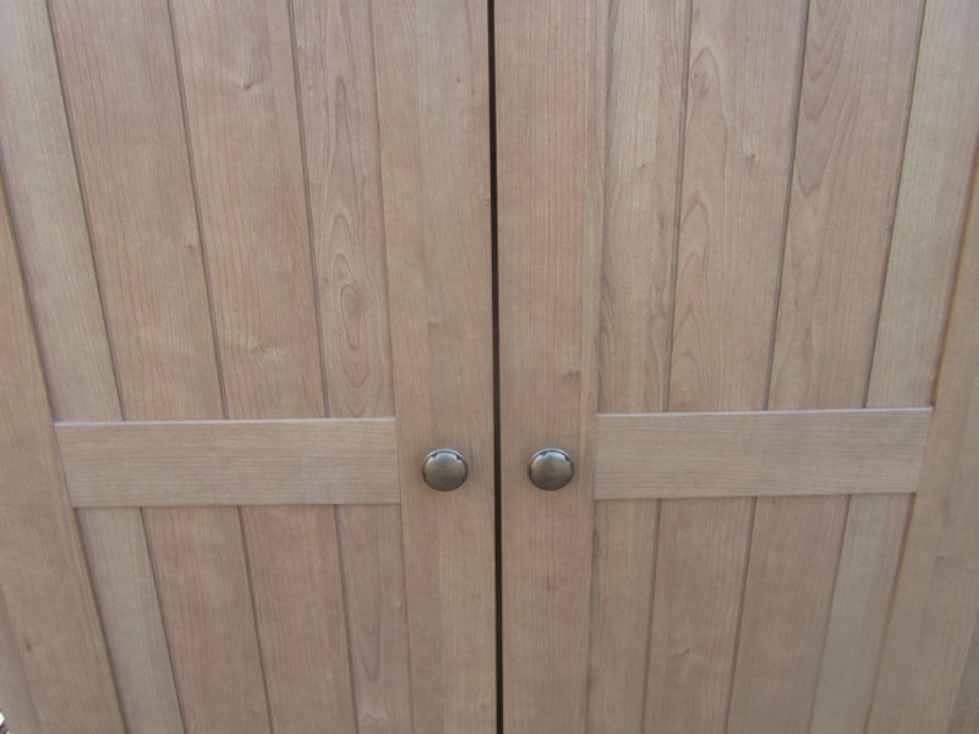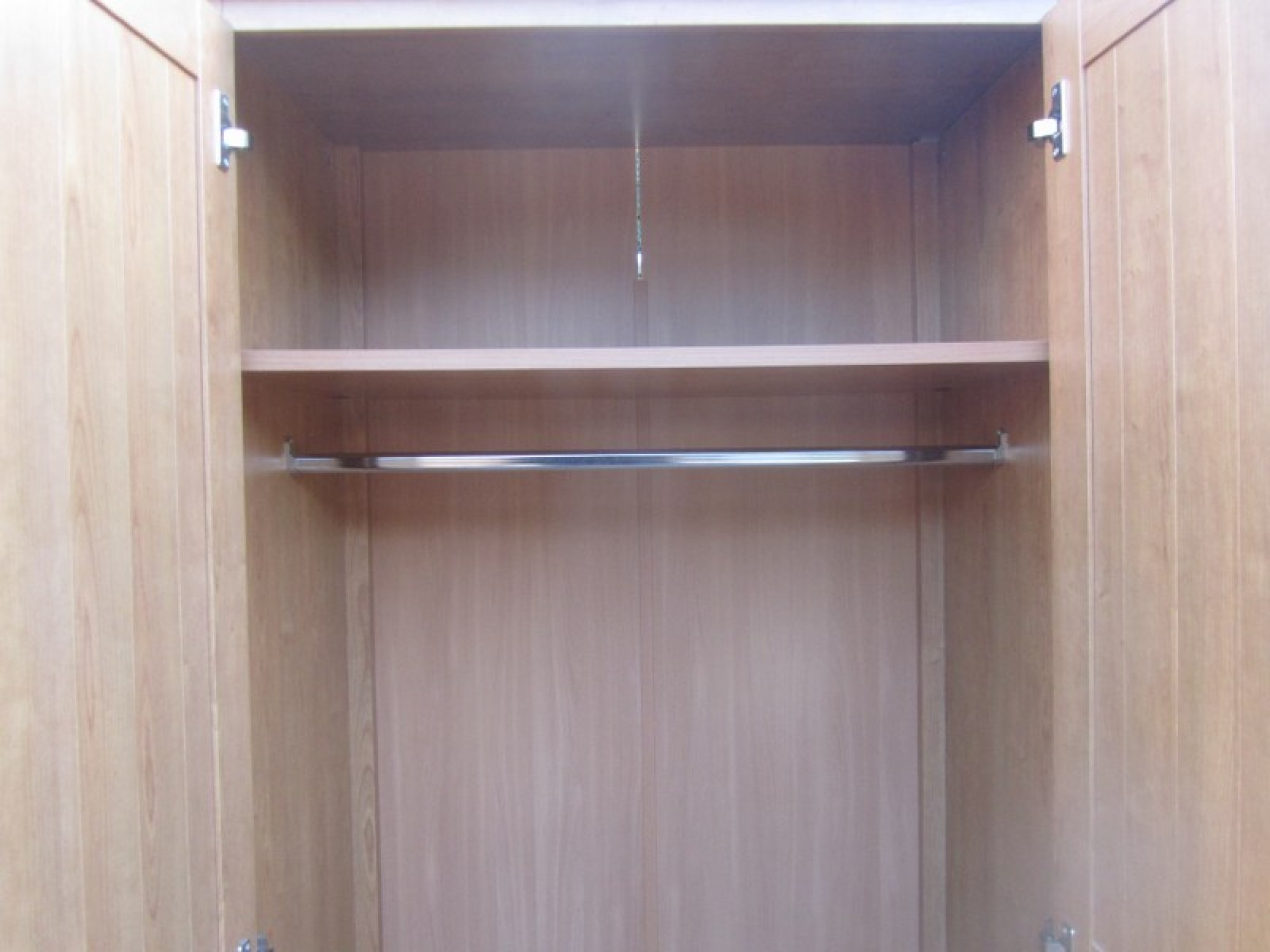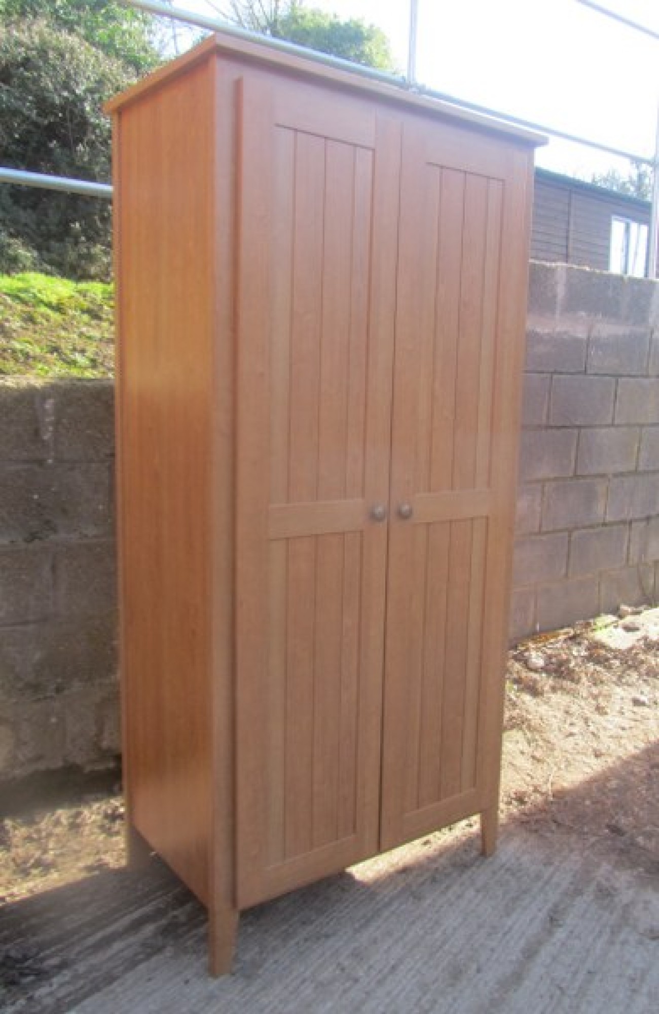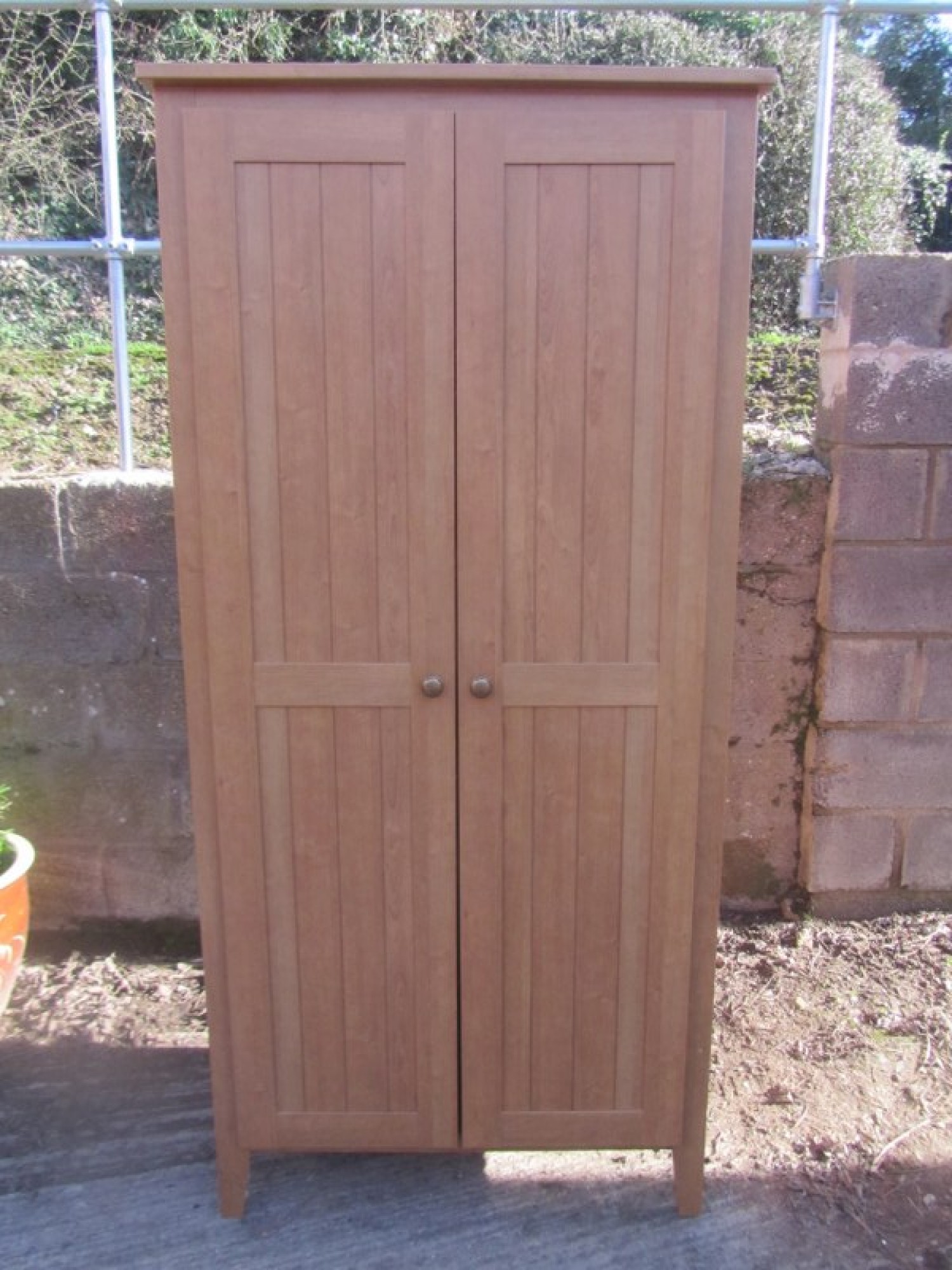 A MODERN WARDROBE IN A PINE EFFECT FINISH. 2 DOORS, HANGING RAIL INSIDE. SOME WEAR TO THE VENEER ON THE LEG.