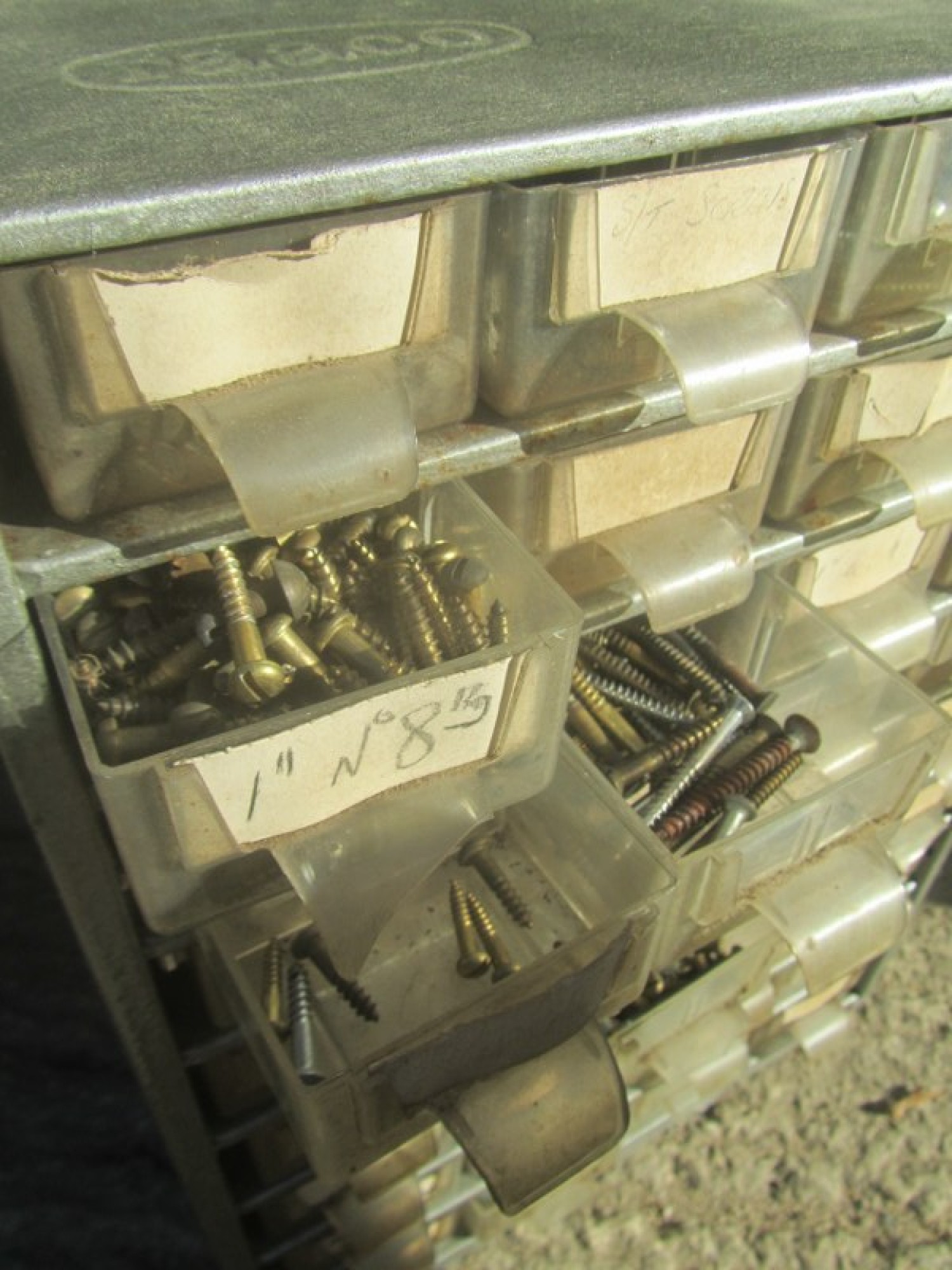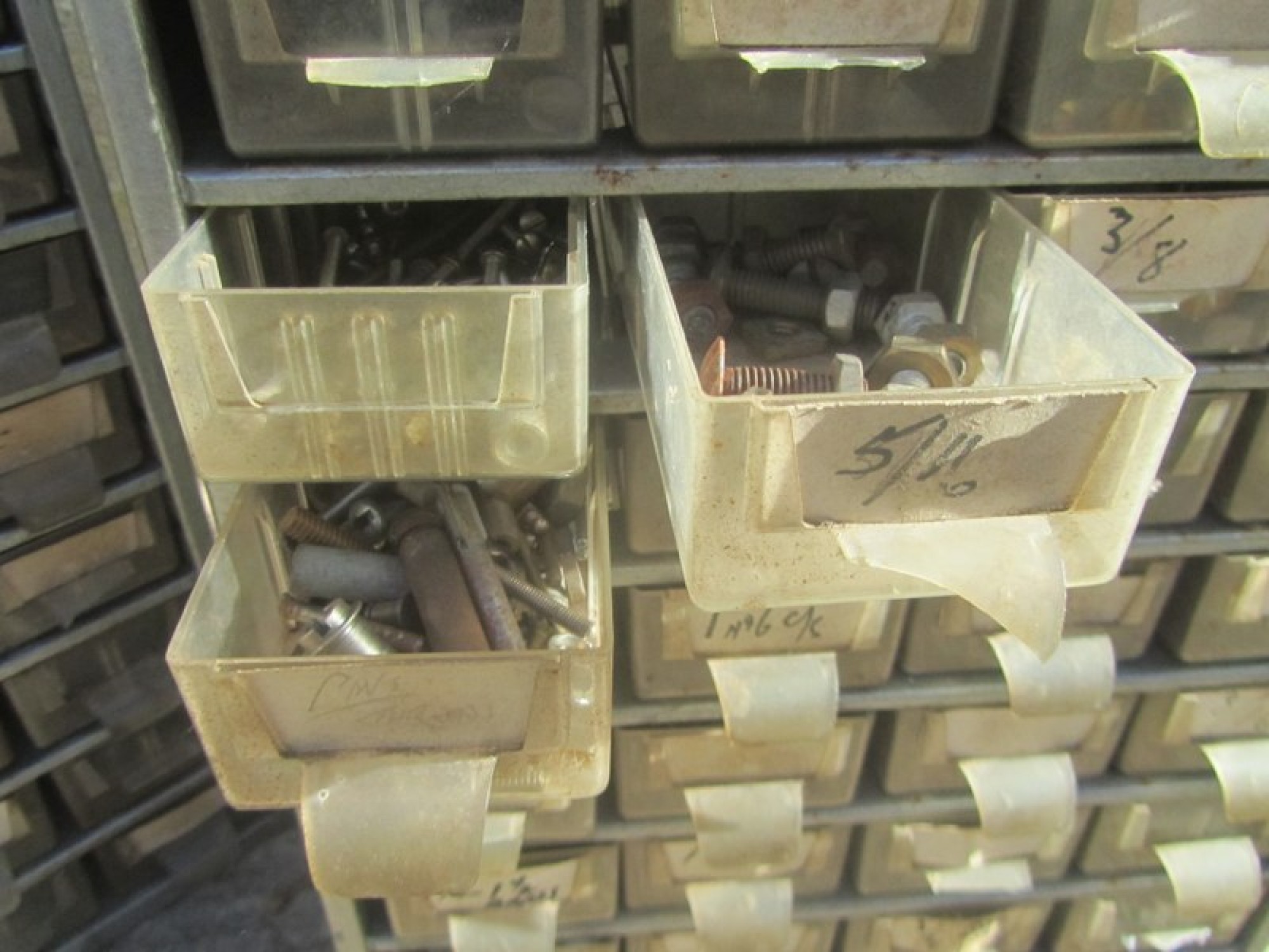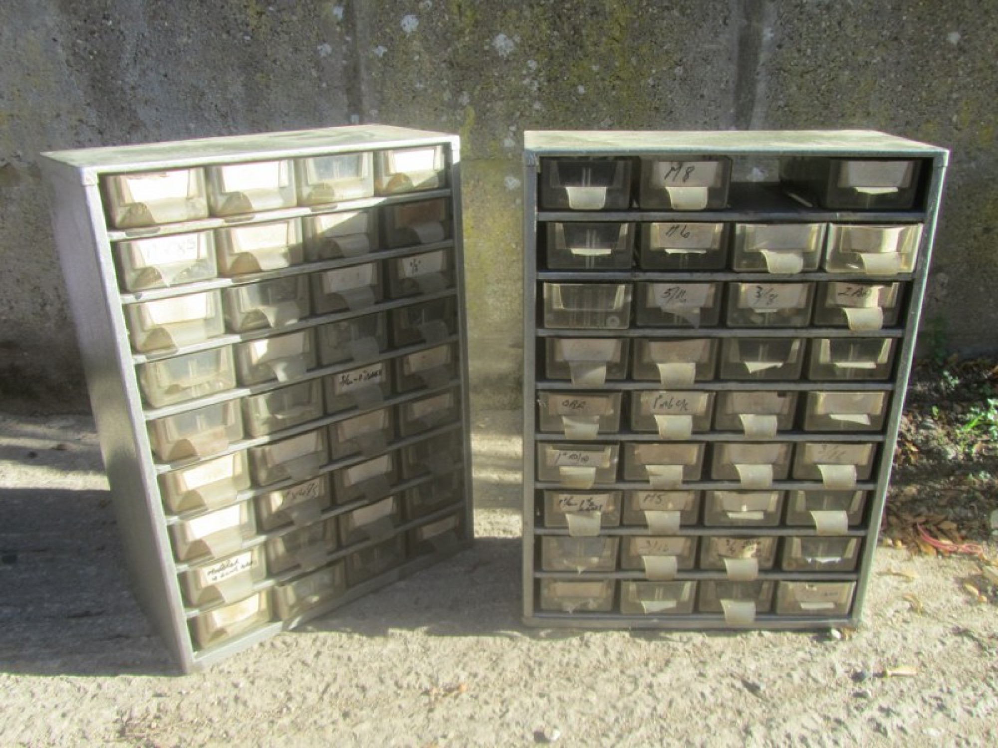 PAIR OF STORAGE BOXES / DRAWERS. LOTS OF SMALL PLASTIC DRAWERS, INCLUDES LOTS OF NUTS, BOLTS, SCREWS etc
