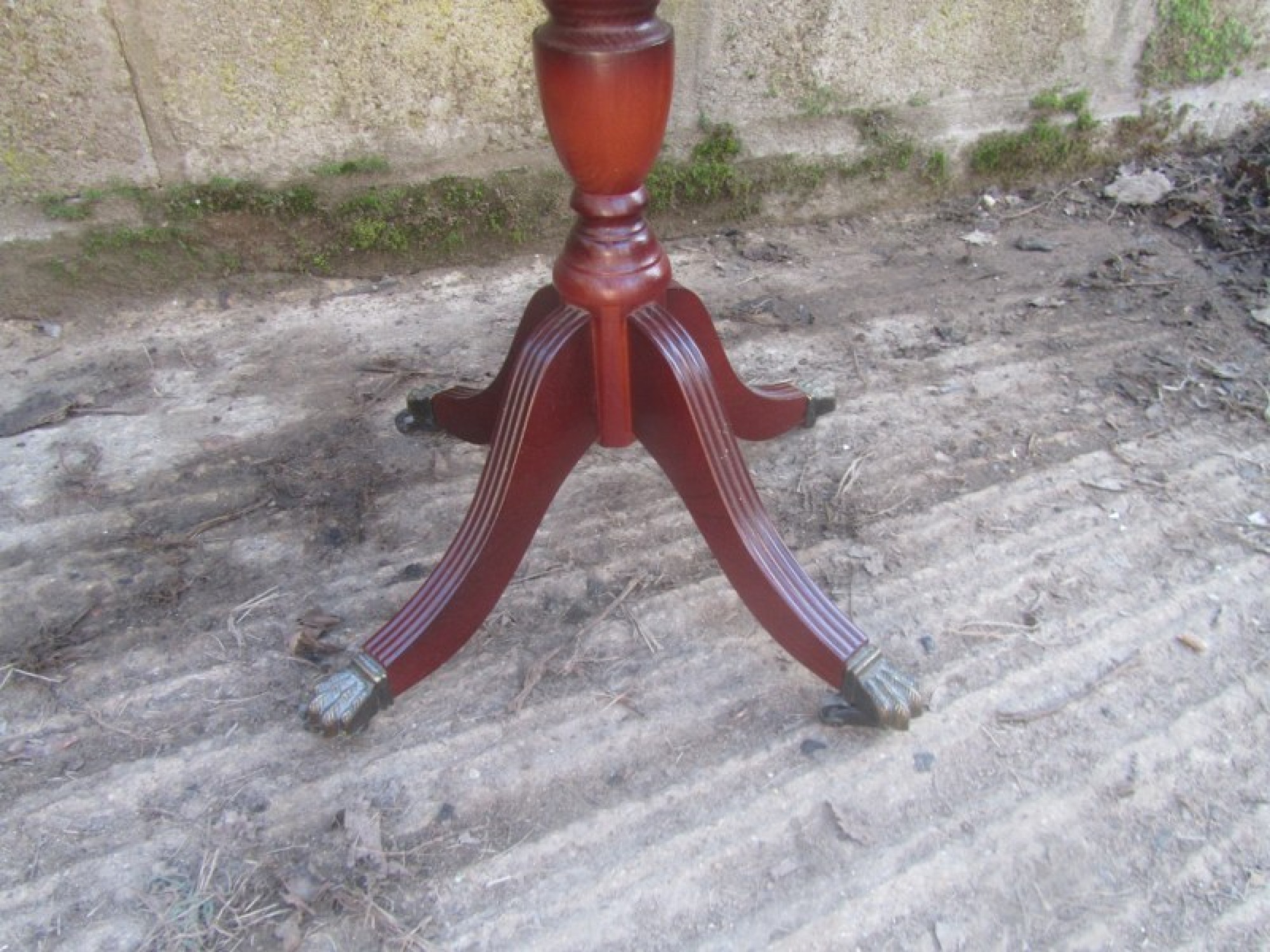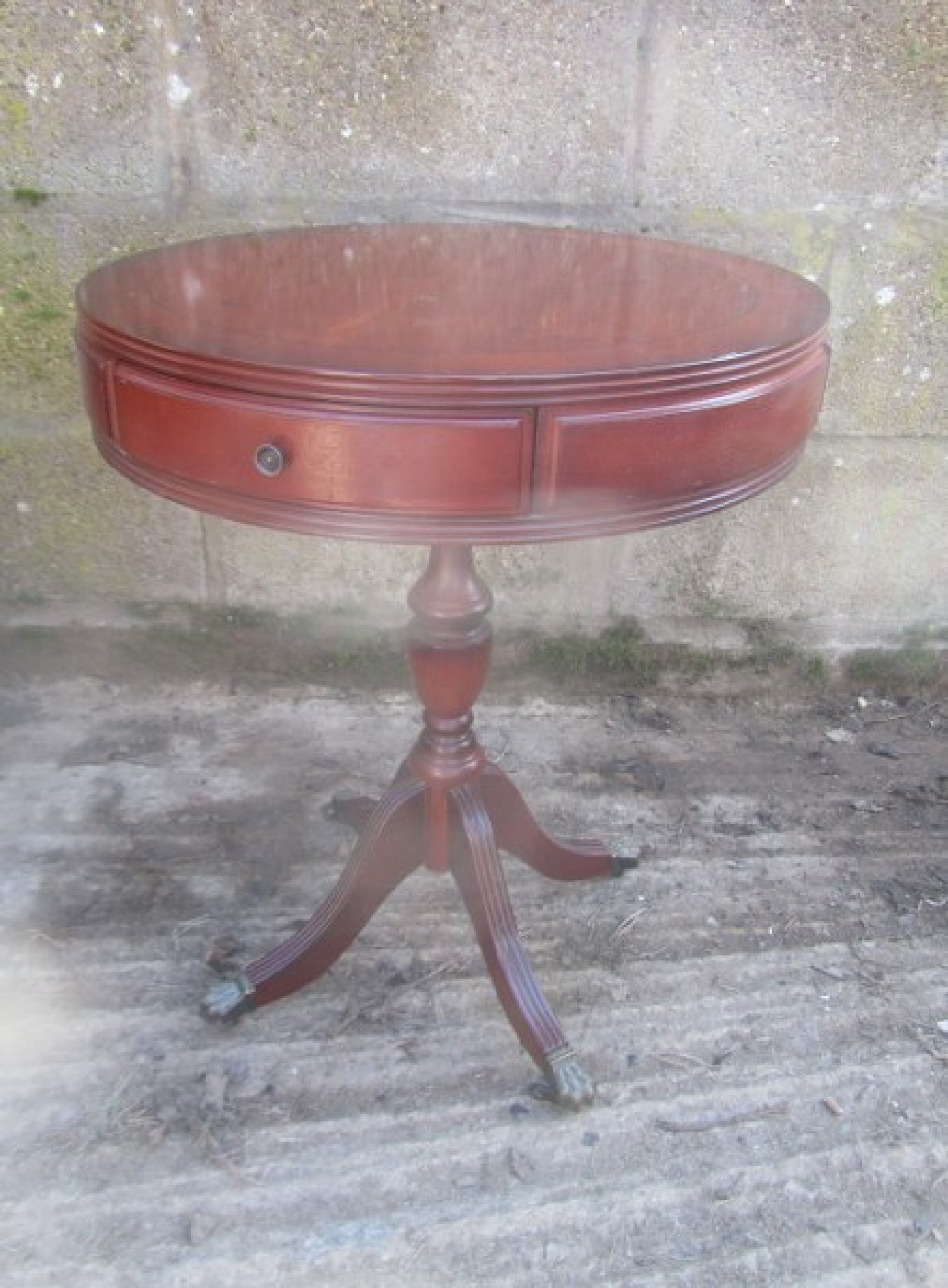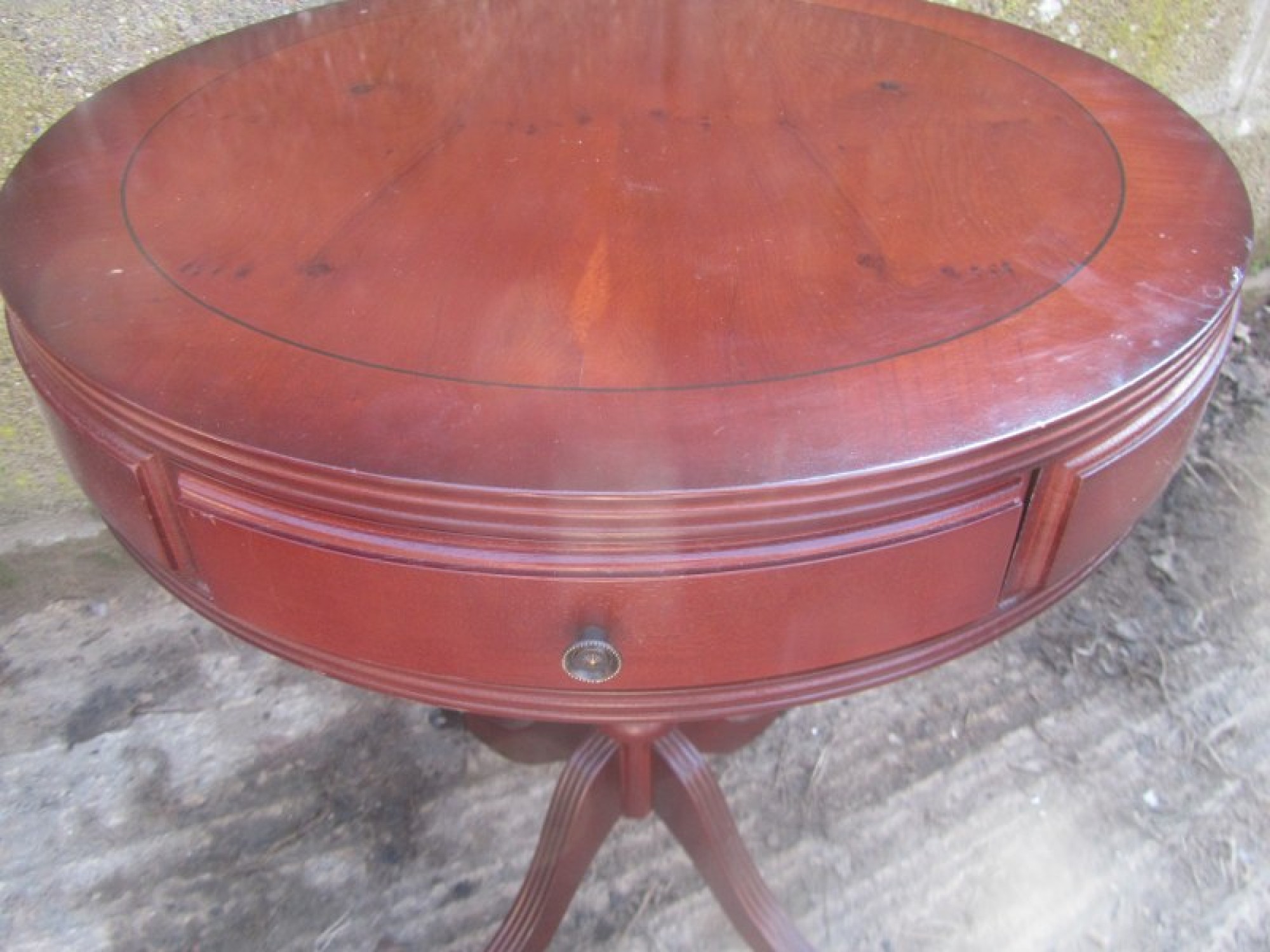A DRUM TABLE ON 3 SPLAYED LEGS IN A MAHOGANY COLOURED WOOD. THE TOP HAS SMALL DRAWERS.