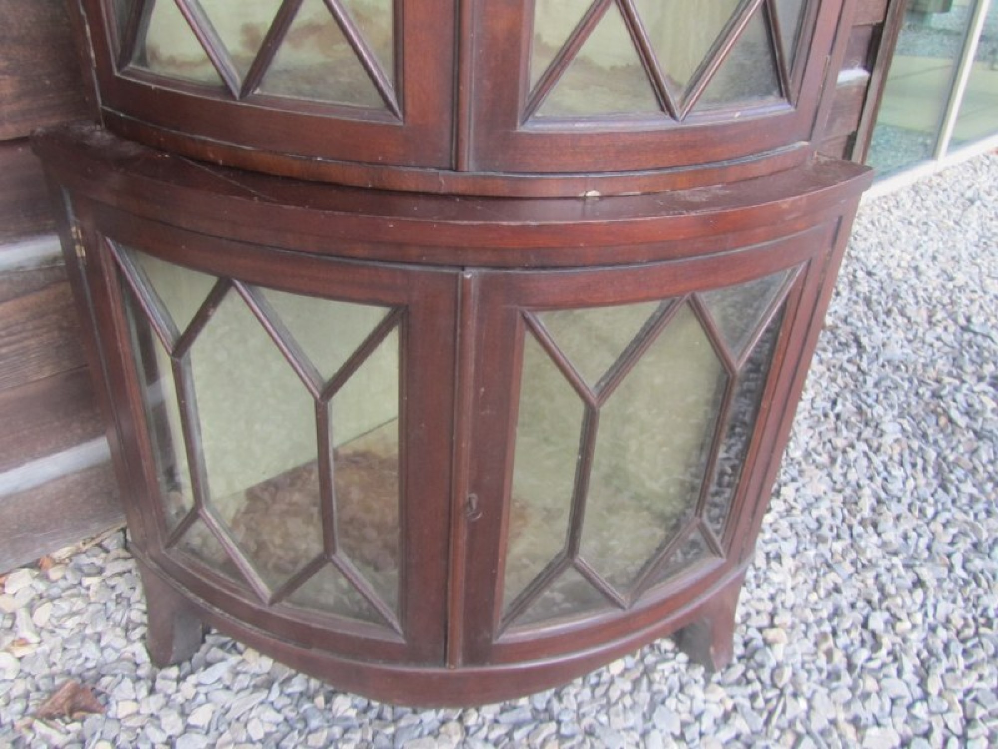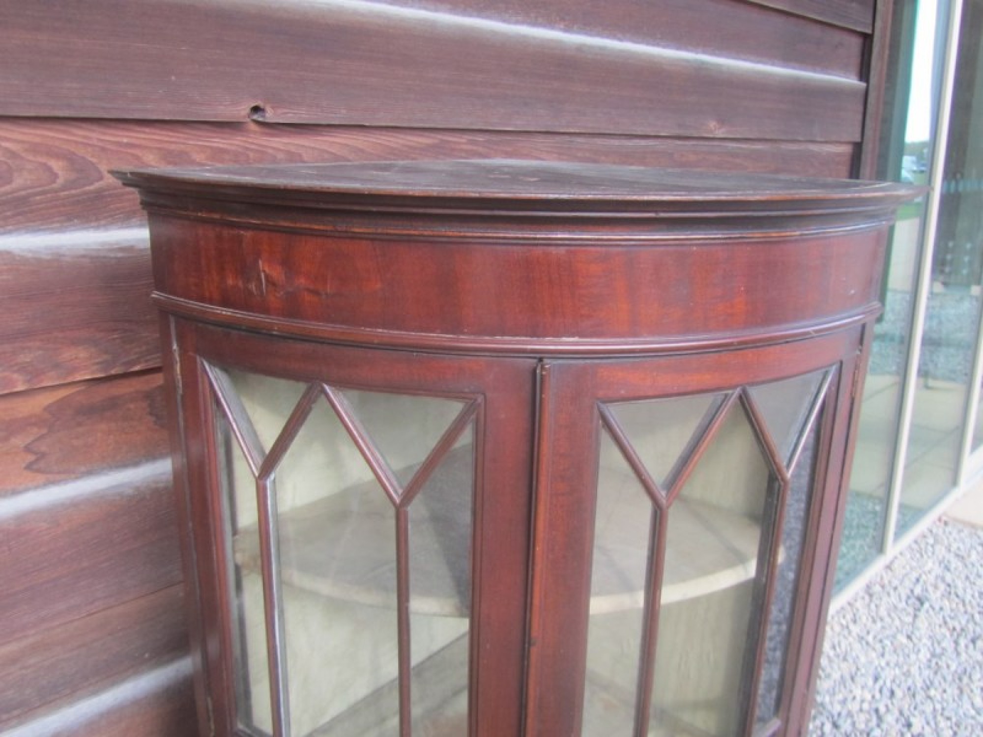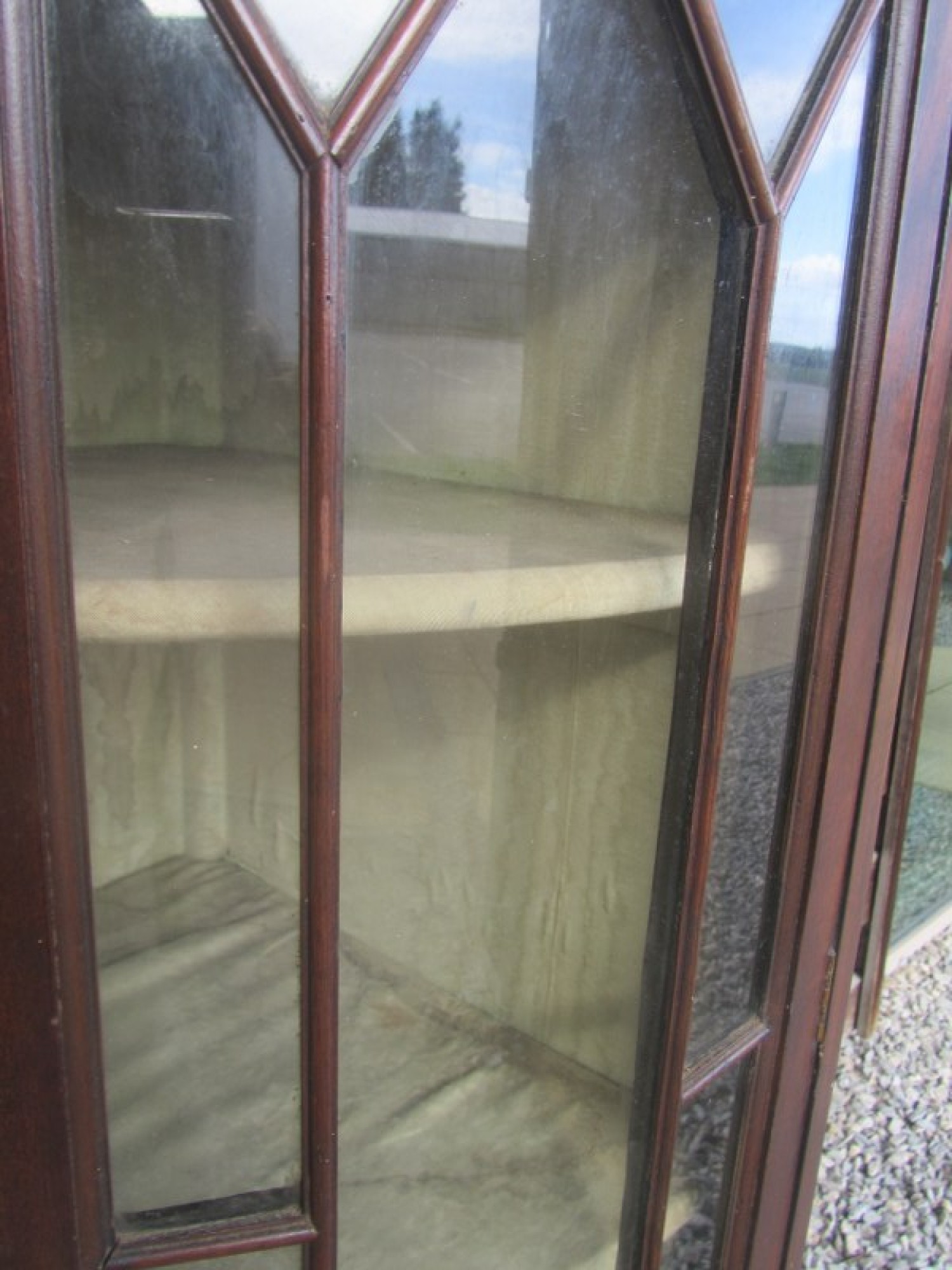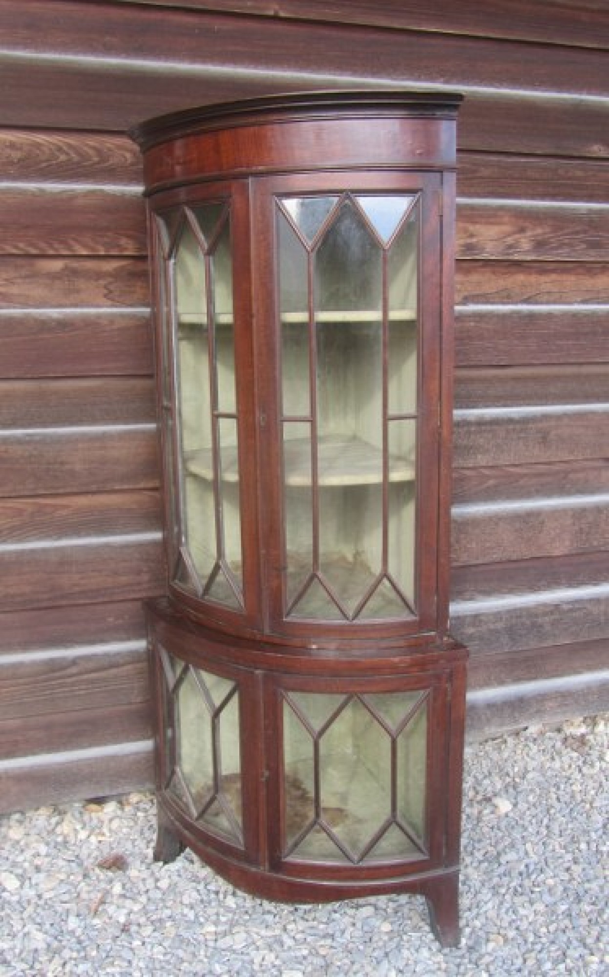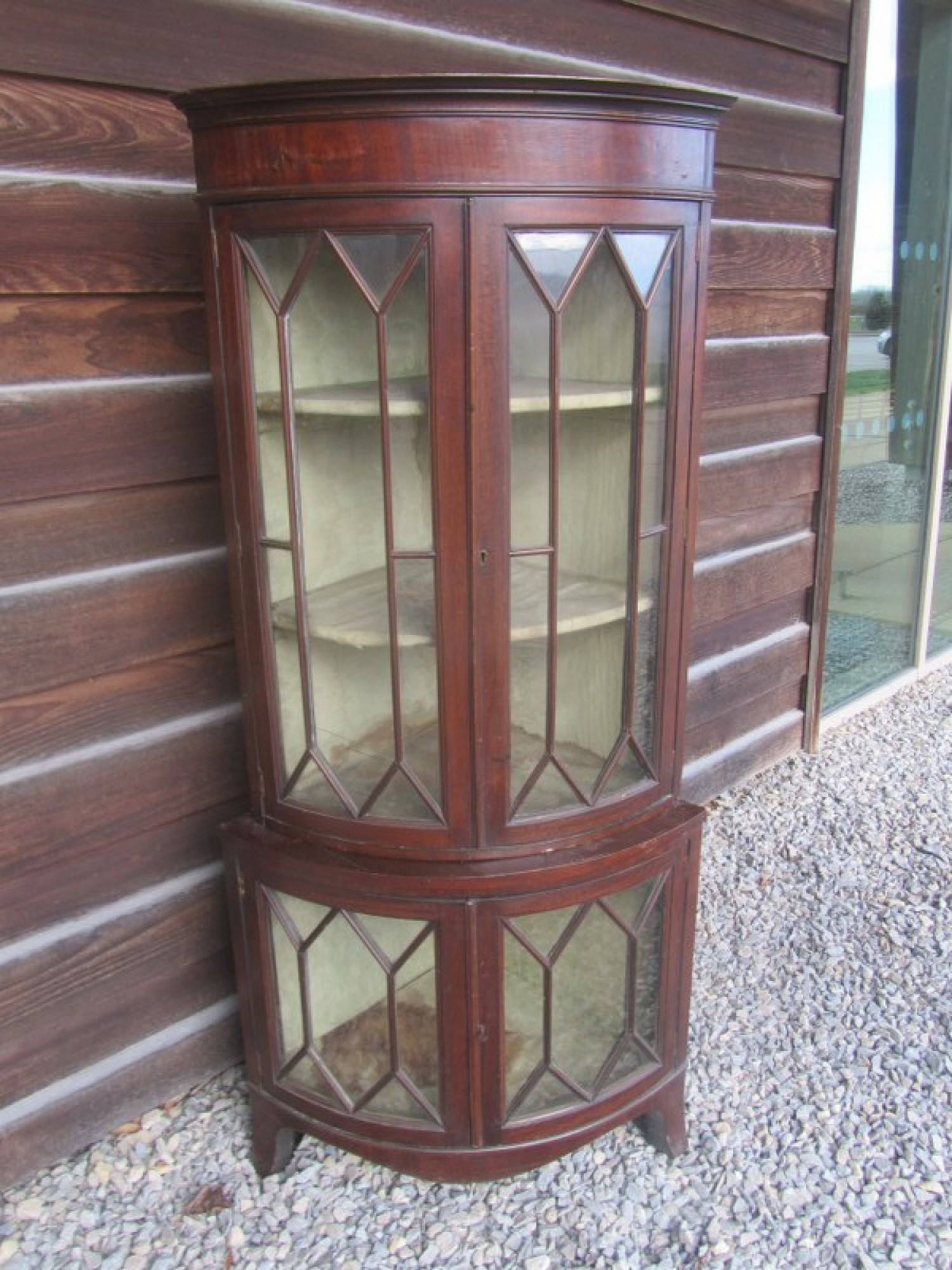MAHOGANY CABINET. IT IS IN AN EARLY 20th CENTURY CABINET FROM THE EDWARDIAN PERIOD. THE TOP SECTION HAS GLAZED DOORS, ONE PANEL IS CRACKED. INSIDE THERE ARE MATERIAL LINED SHELVES. BELOW THERE ARE 2 DOORS, ONE HAS A BROKEN HINGE. IT IS IN 2 PARTS.