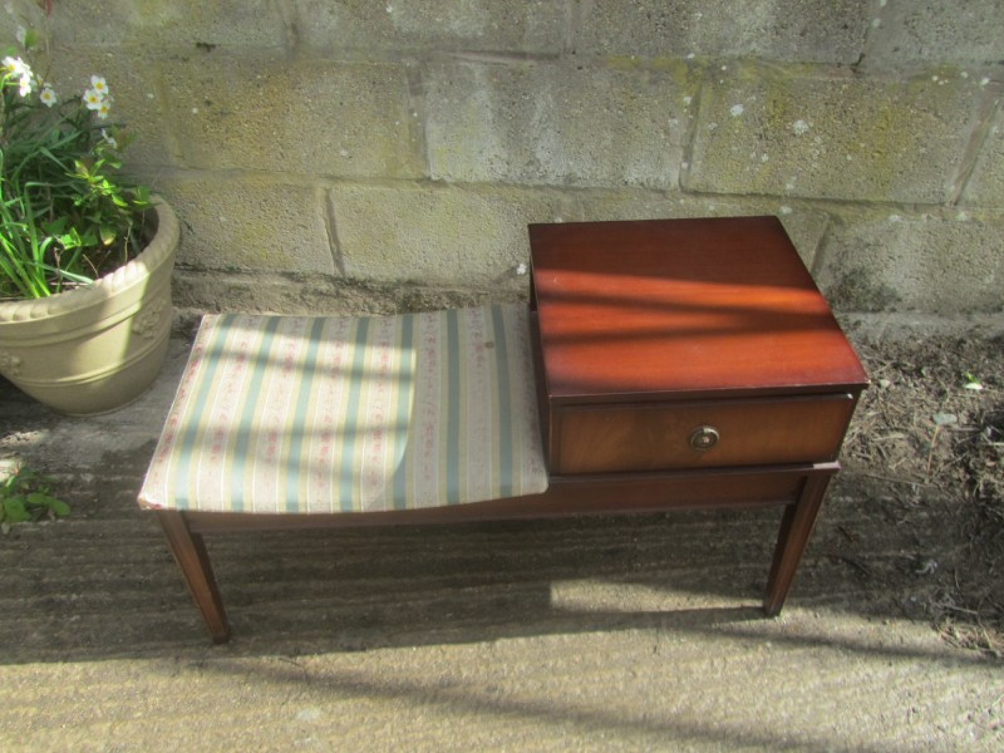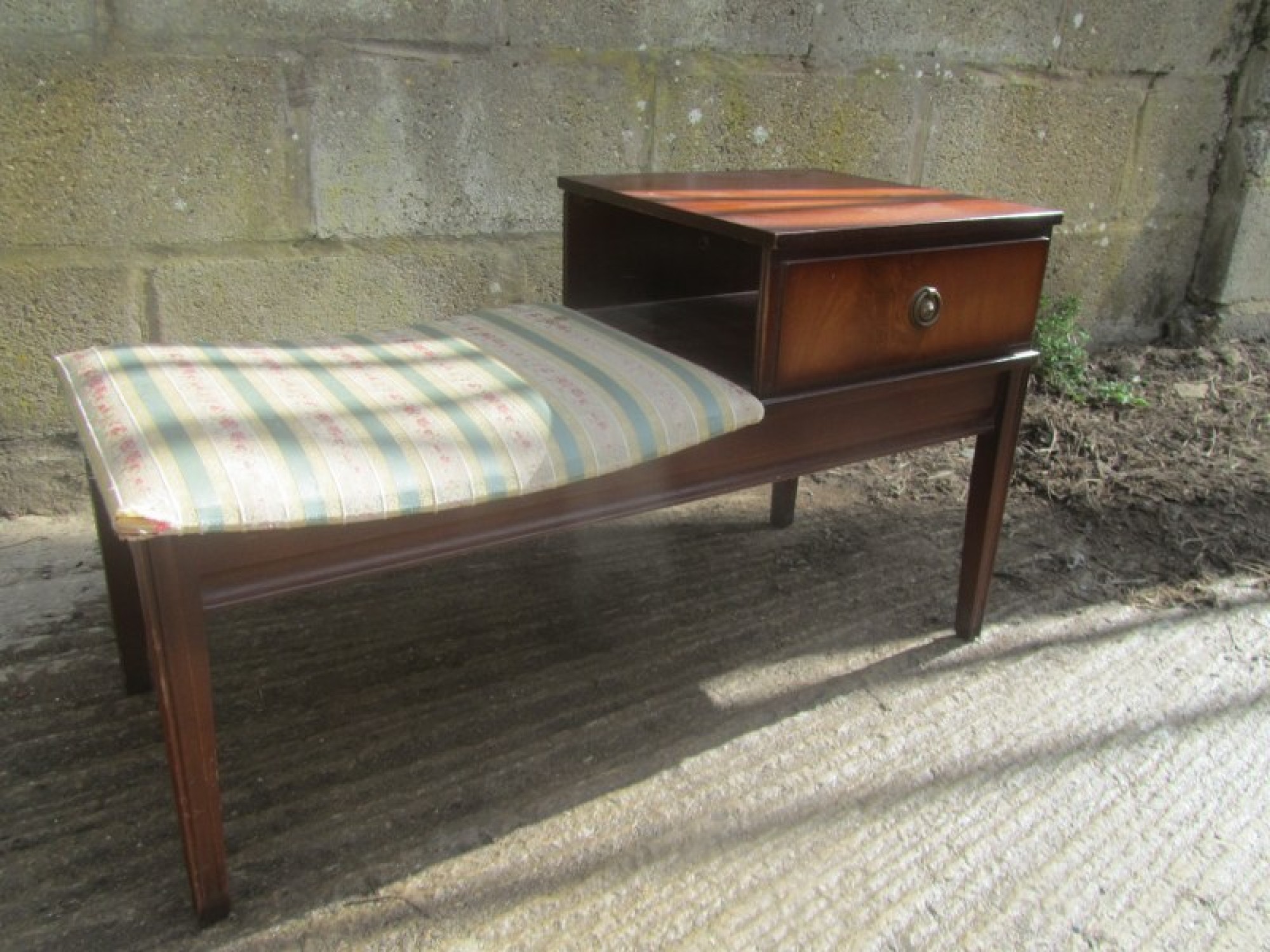 THIS IS A PHONE SEAT, THE FRAME IS STURDY, UPHOLSTERED IN MATERIAL. IN AVERAGE CONDITION, THE FRAME IS OK, NO LOOSE JOINTS, MINOR WEAR AND TEAR.