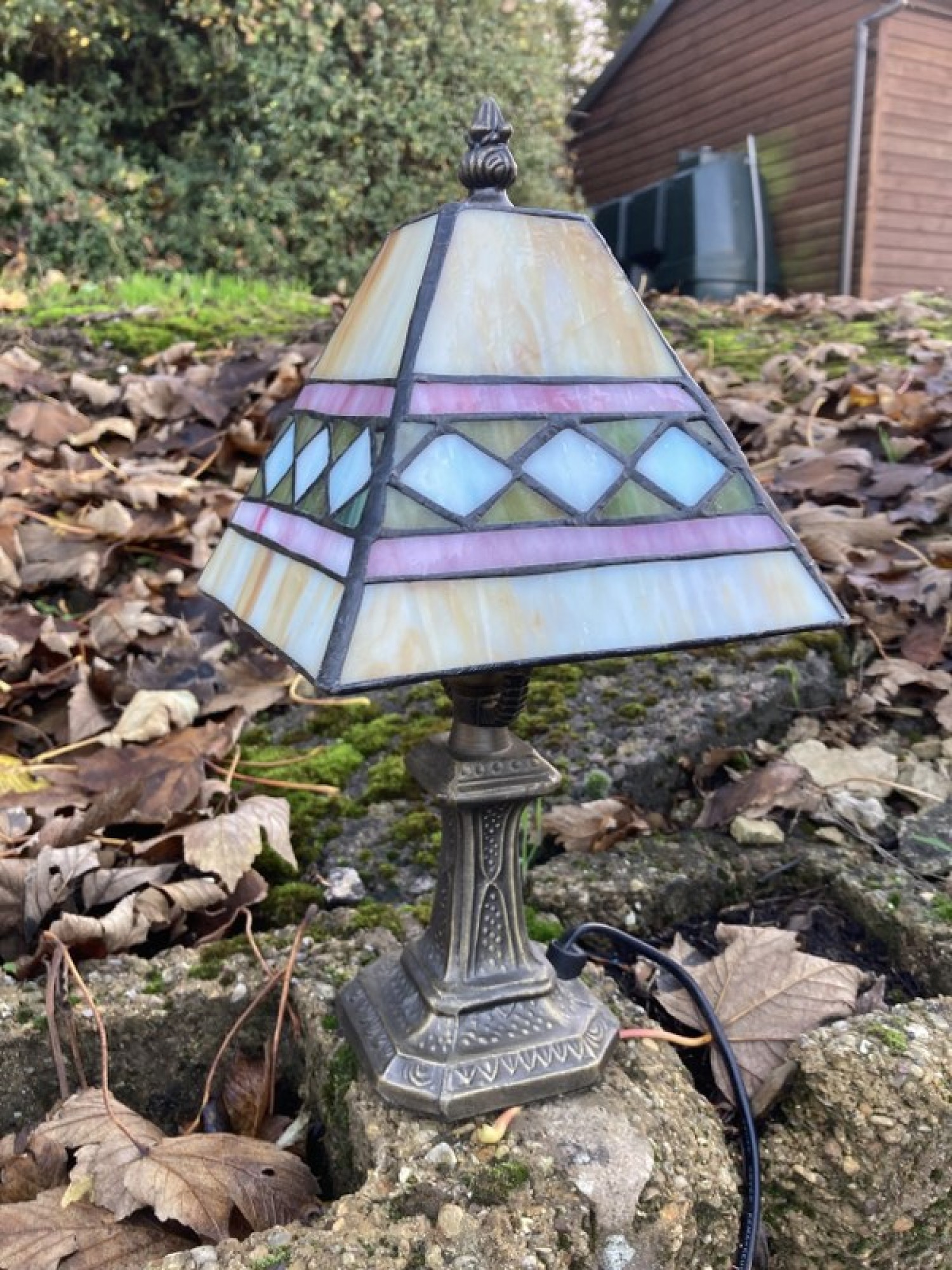 A REPRODUCTION SMALL BEDSIDE LAMP. THE BASE IS METAL, THE SHADE IS GLASS AND METAL, ONE PANEL IS CRACKED. IN A TIFFANY STYLE. A CLASSIC STYLISH DESIGN.