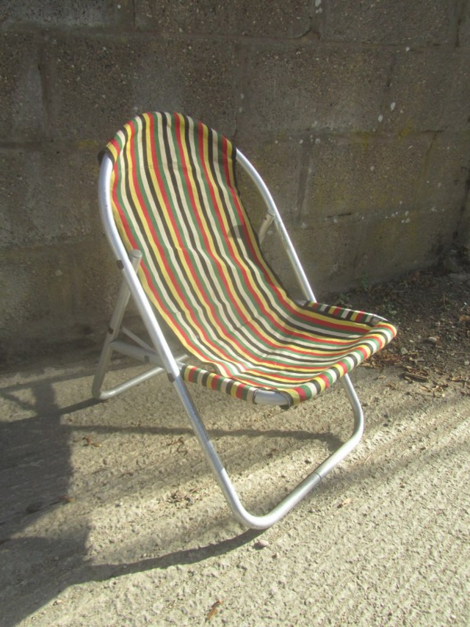THIS IS A SMALL FOLD UP OUTDOOR CHAIR. THE FRAME IS METAL. SOME WEAR AND STAINS. SEAT HEIGHT 33cm.