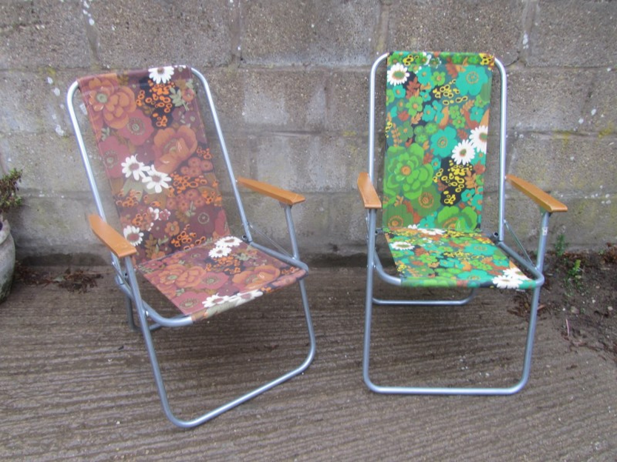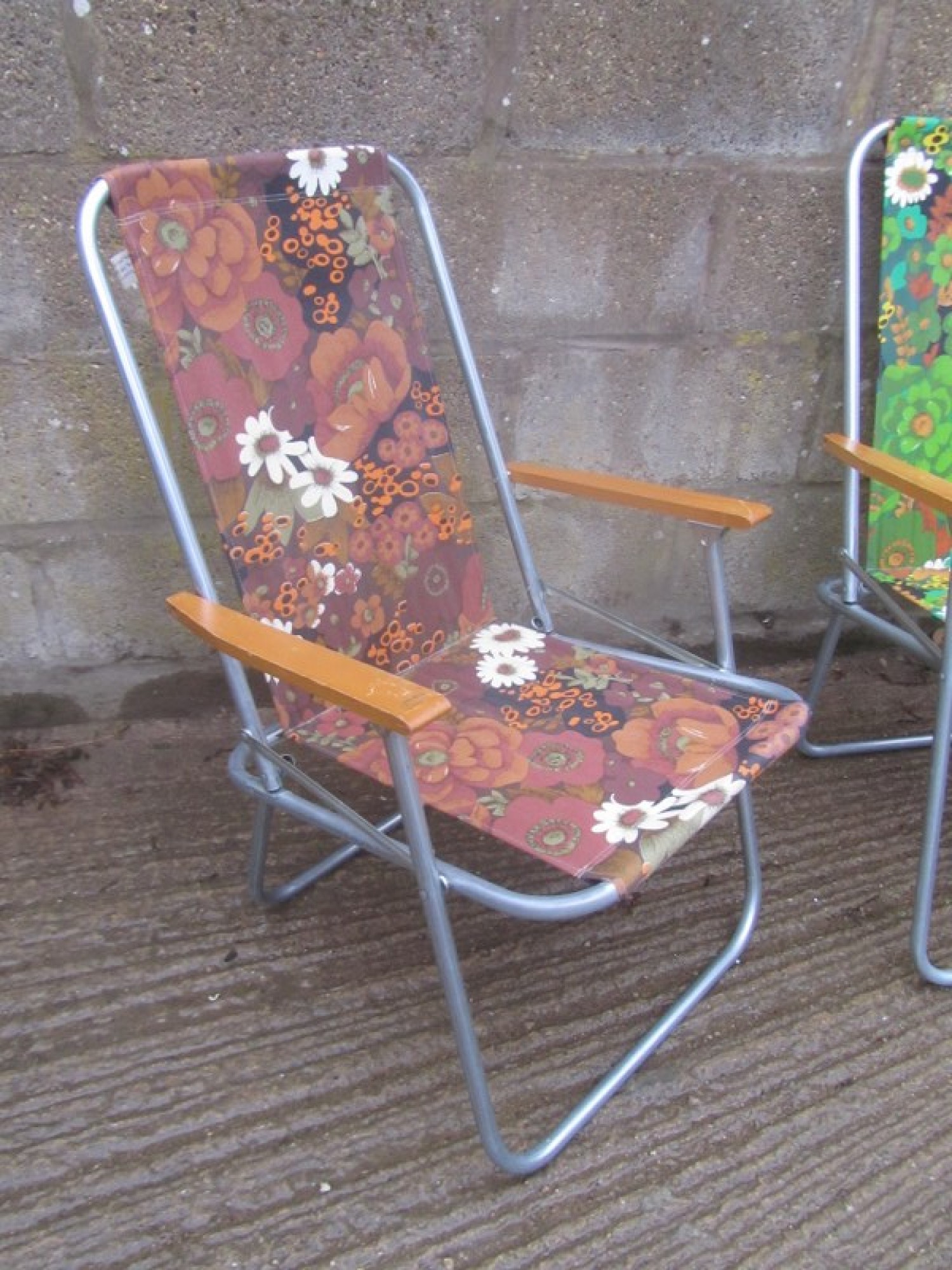 THIS IS A PAIR OF FOLD UP OUTDOOR CHAIRS. THE FRAMES ARE METAL. THE SEATS ARE MATERIAL. GREAT VINTAGE PATTERN.
