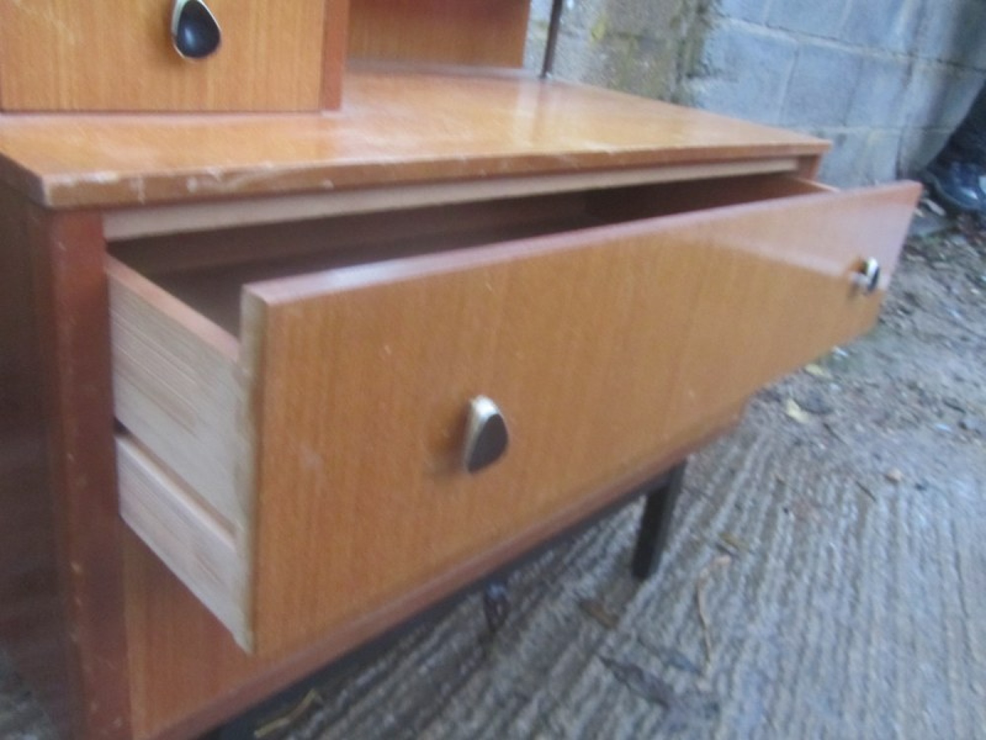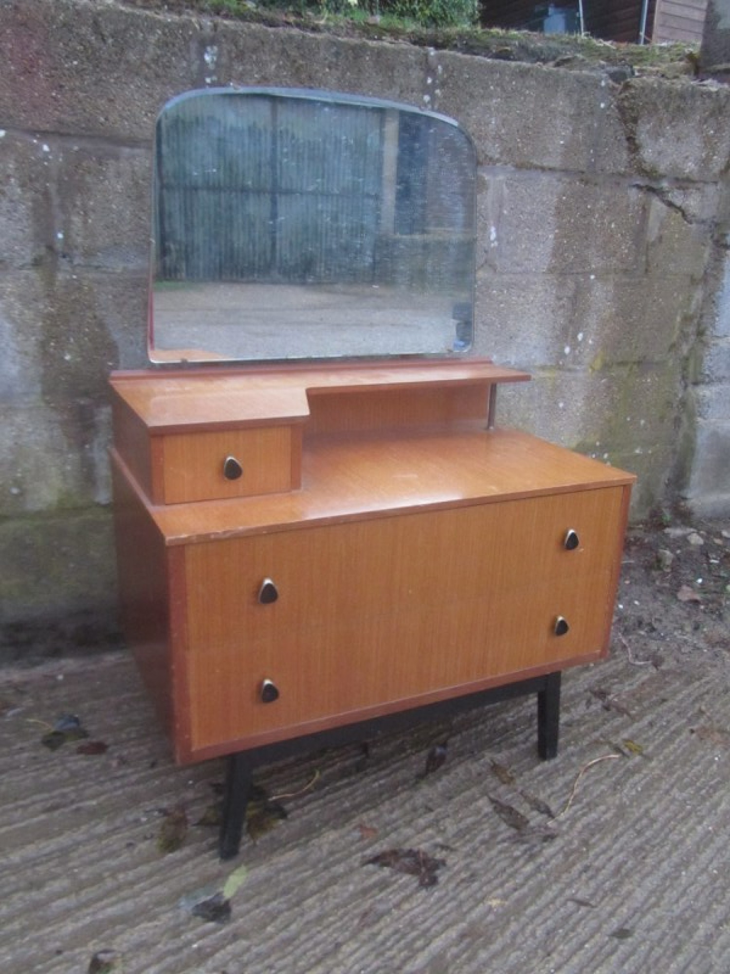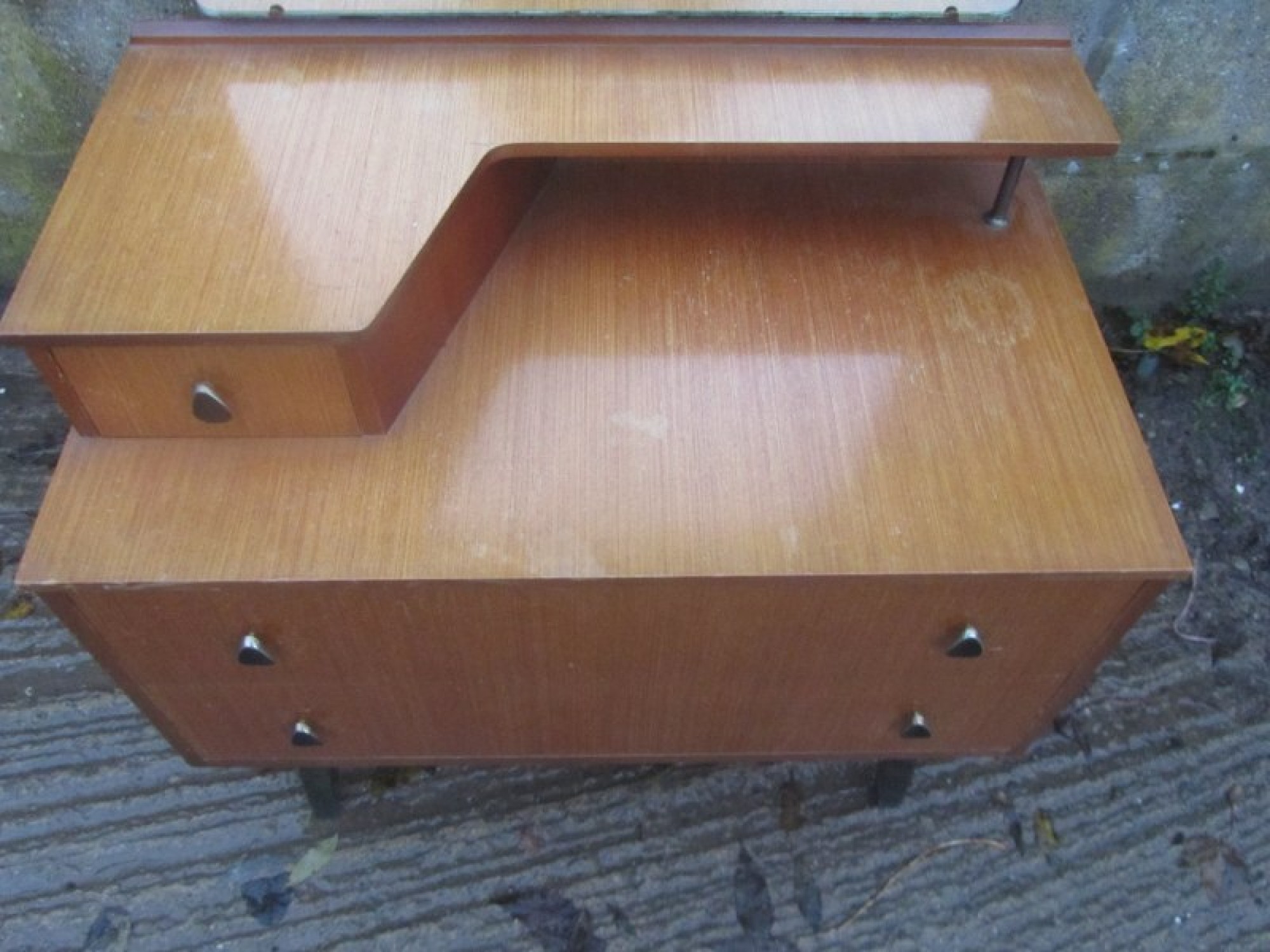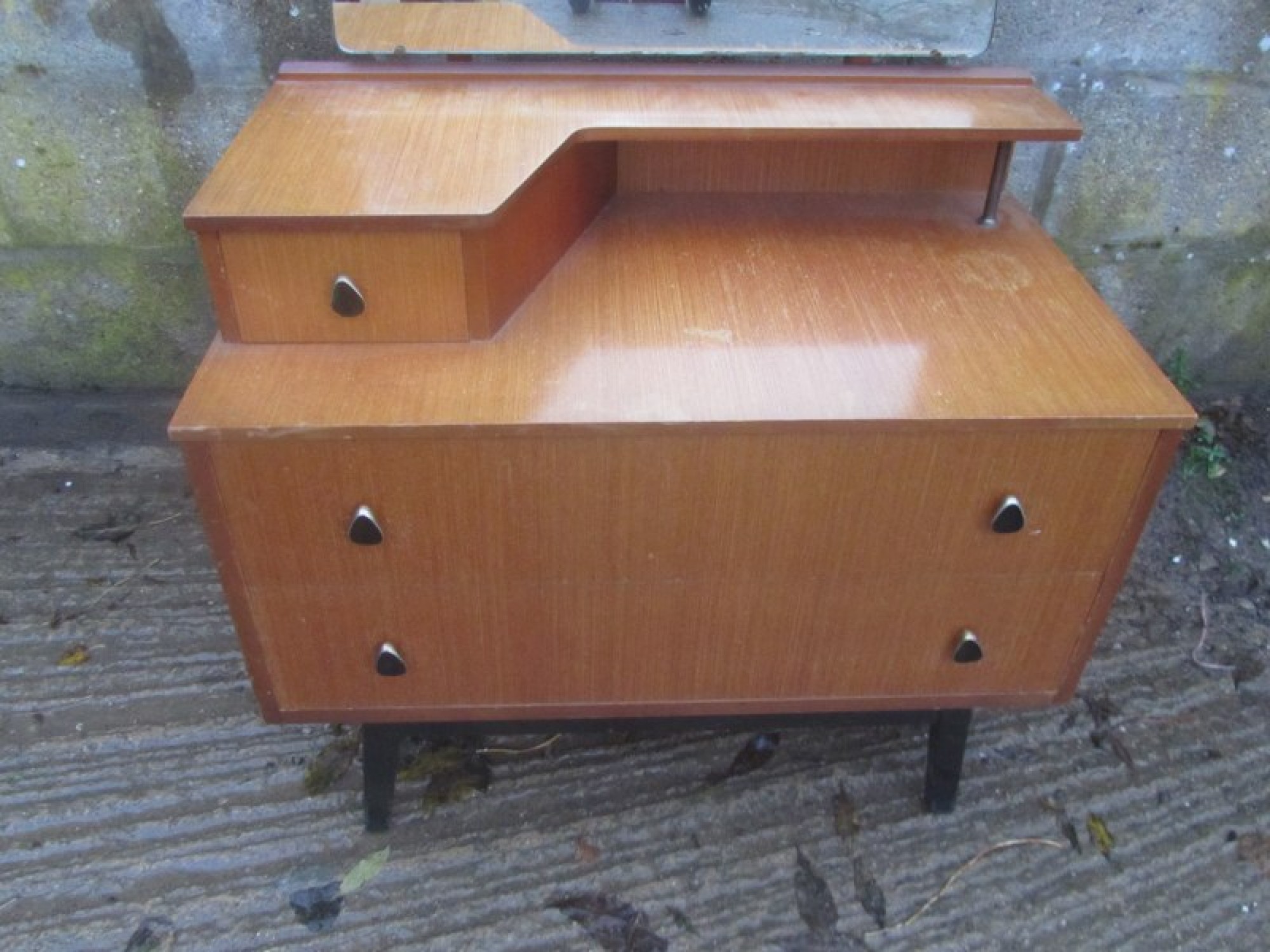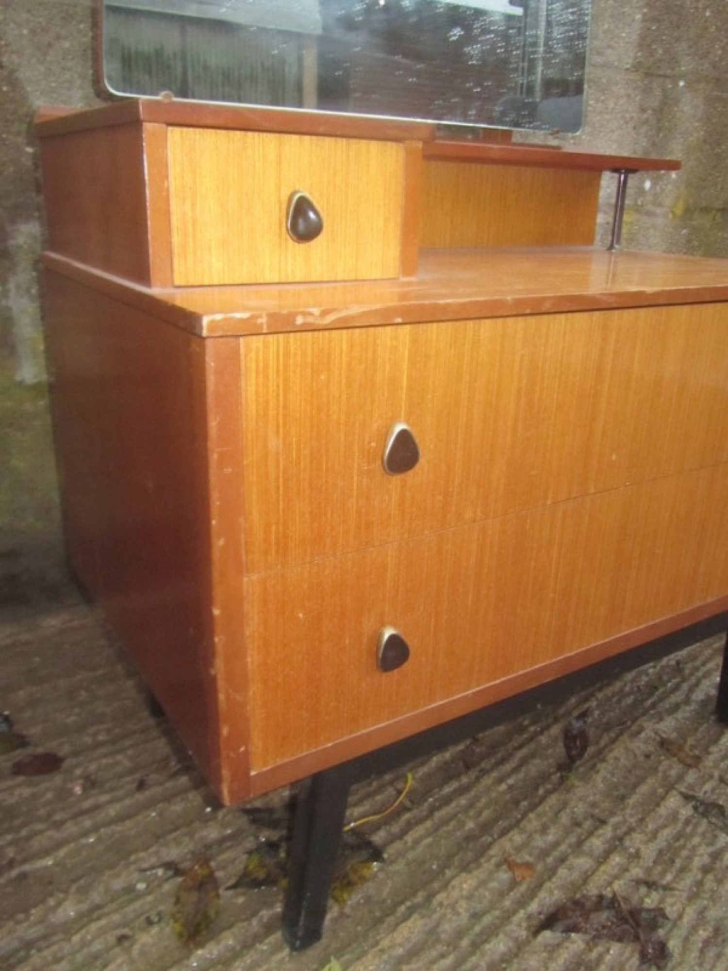 THIS IS A VINTAGE DRESSING CHEST FROM THE 1960s. IT IS A GREAT VINTAGE PIECE, A USEFUL ITEM FOR THE HOME. THE TOP AND SIDES ARE VENEERED. SOME SCUFFS AND WEAR. AVERAGE CONDITION.