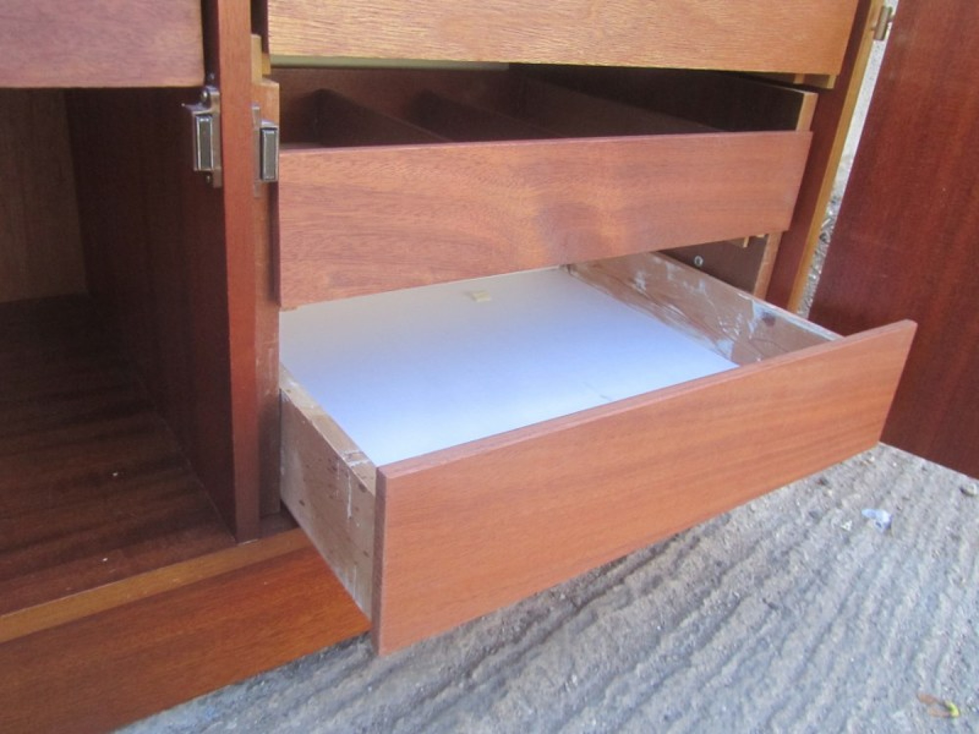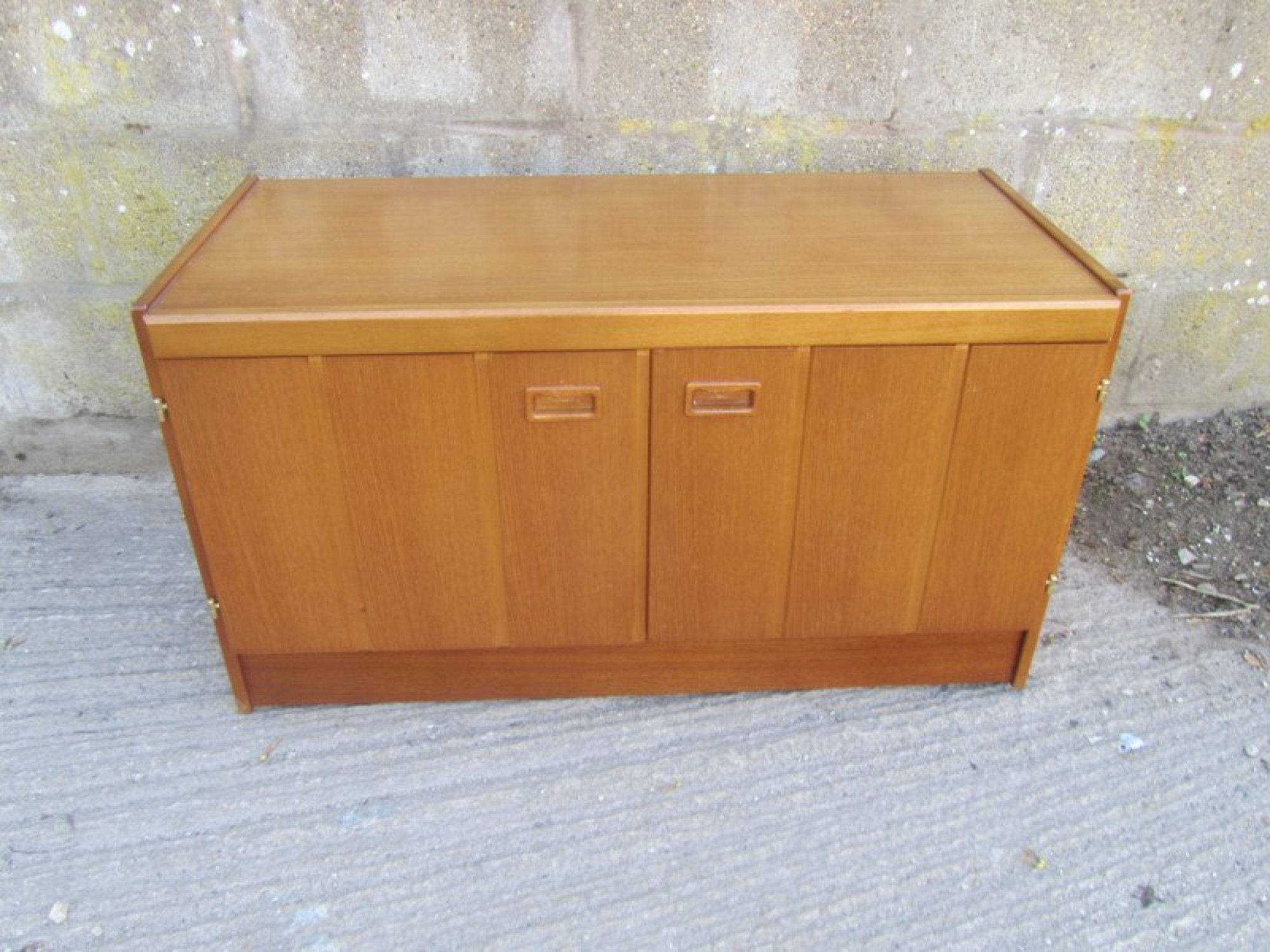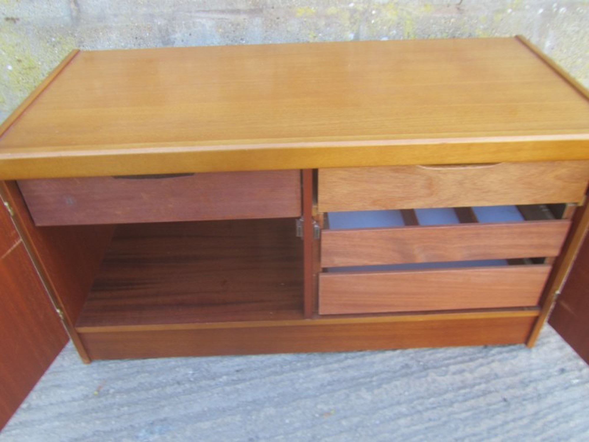 THIS IS A TEAK VENEERED SIDEBOARD. THERE ARE CUPBOARD DOORS & DRAWERS INSIDE.