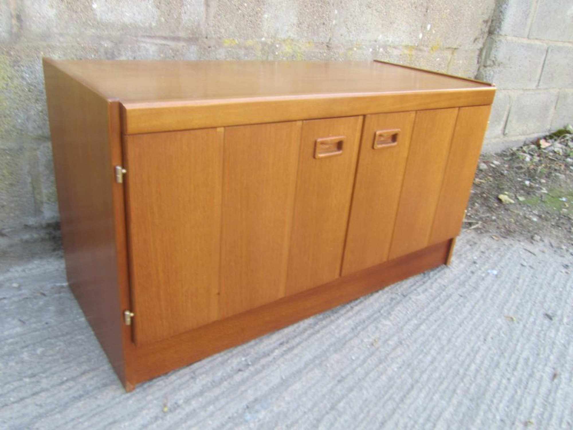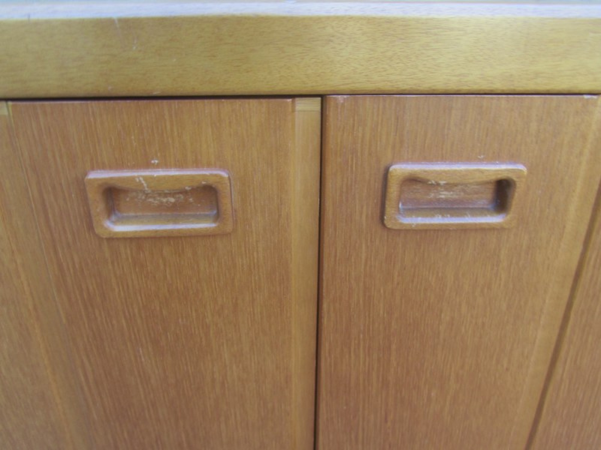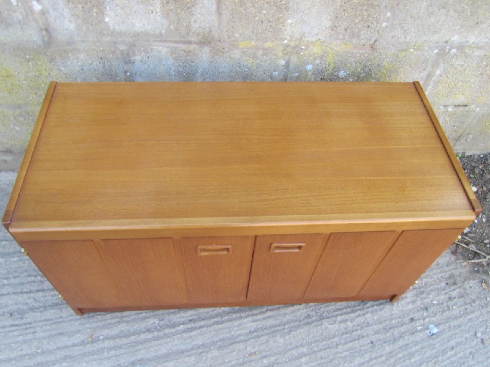 THIS IS A TEAK VENEERED SIDEBOARD. THERE ARE CUPBOARD DOORS & DRAWERS INSIDE.