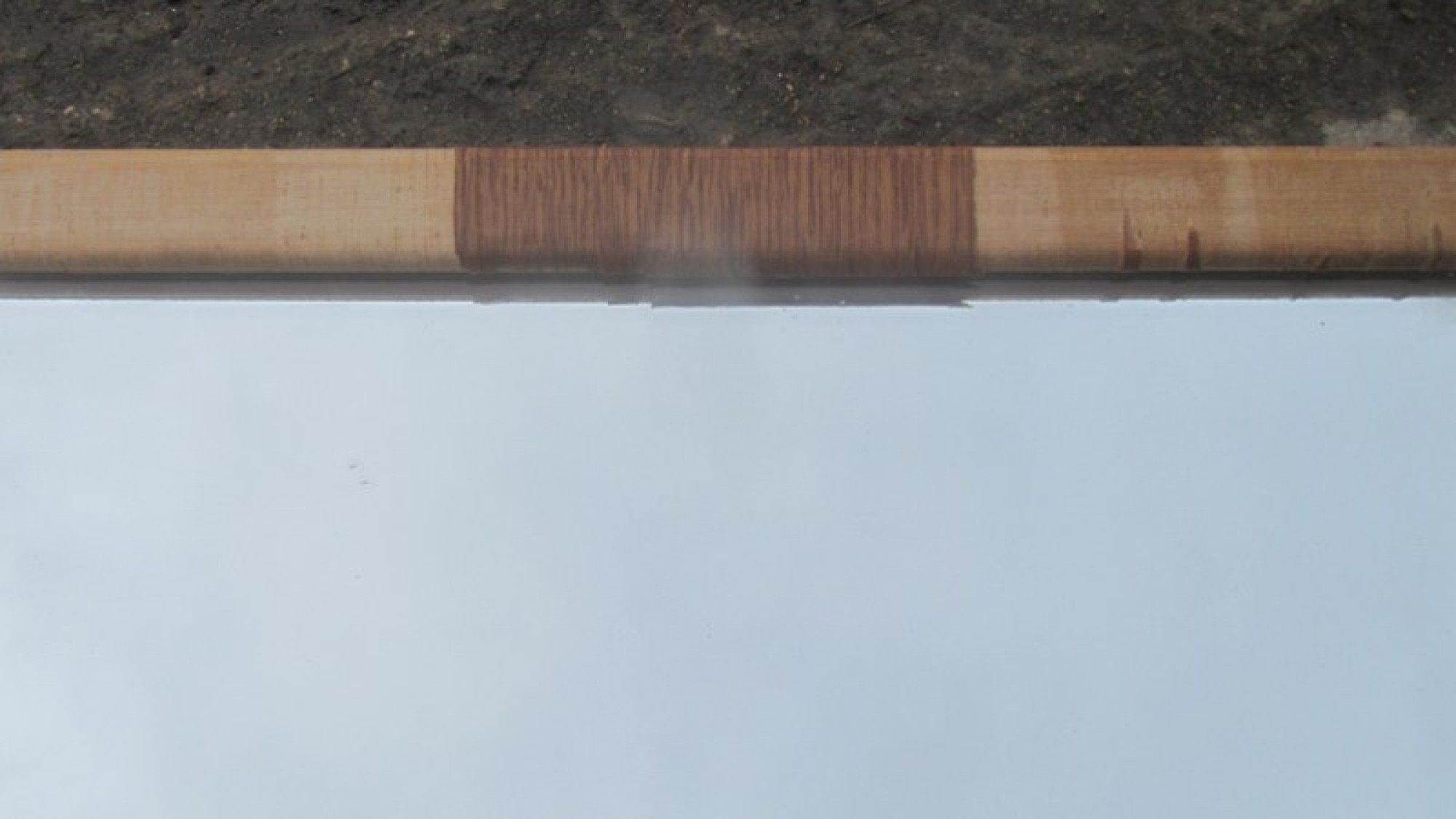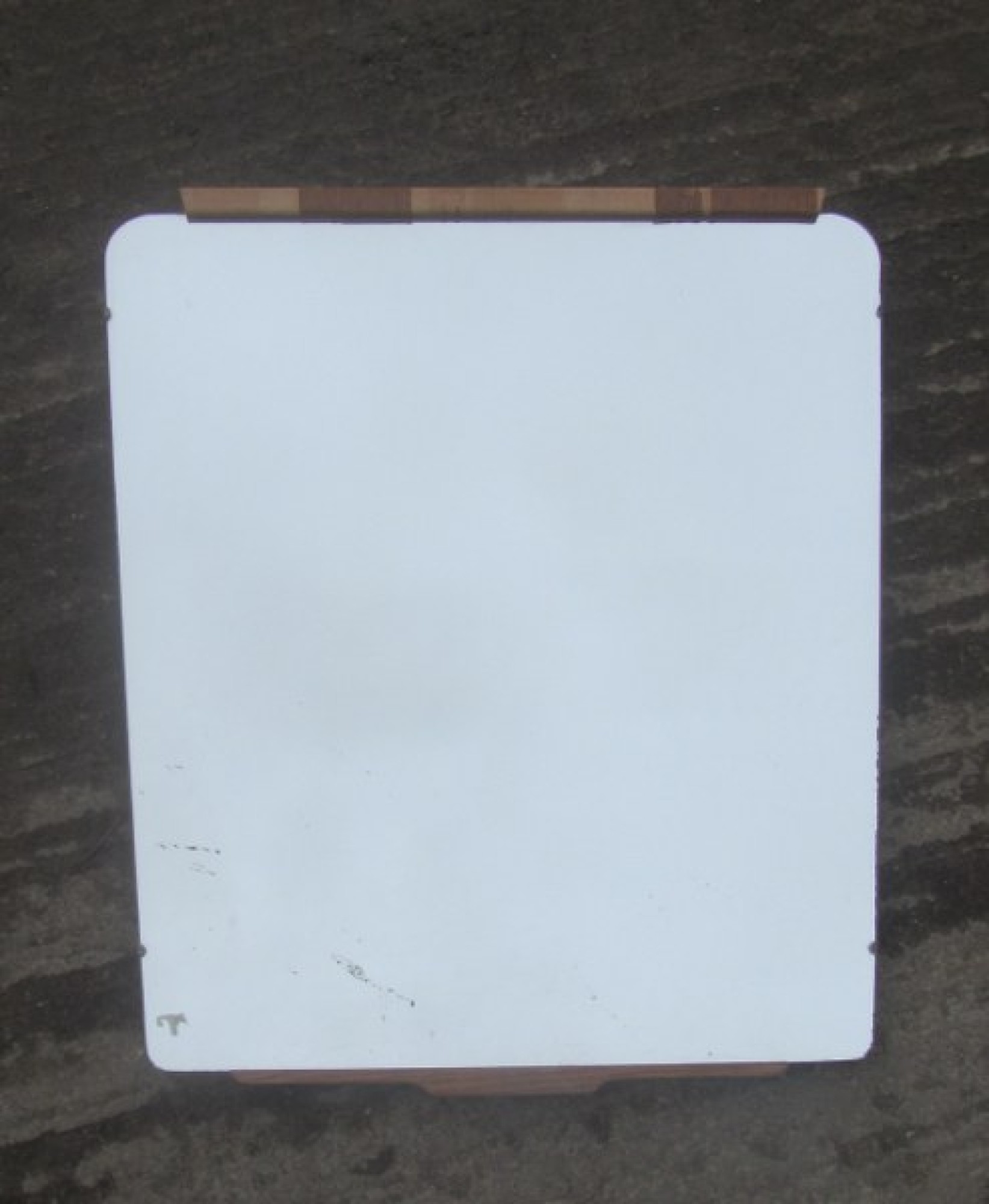 A STYLISH MIRROR ON A PLYWOOD BACKING. A SIMPLE AND ELEGANT VINTAGE MIRROR. NO CHAIN. WORN AROUND THE EDGE, THE WOOD TRIM HAS VENEER MISSING. ORIGINALLY FROM A DRESSING TABLE.