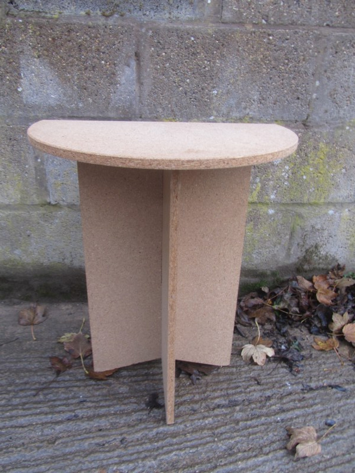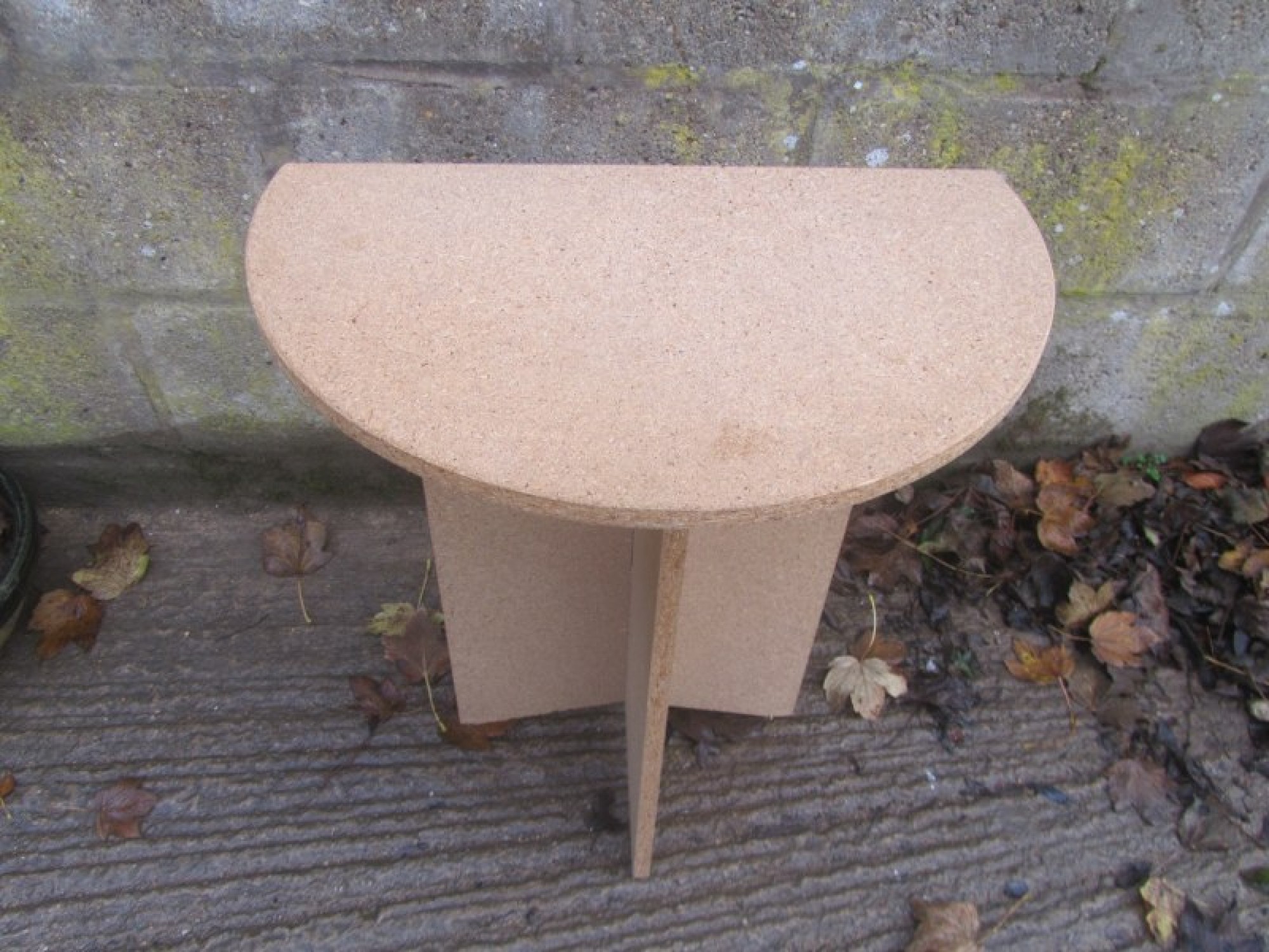 A SIMPLE TABLE, MADE FROM CHIP BOARD, SEMI CIRCLE TOP. TO BE USED WITH A TABLECLOTH, IDEAL FOR A SIMPLE TABLE ANYWHERE IN THE HOME.