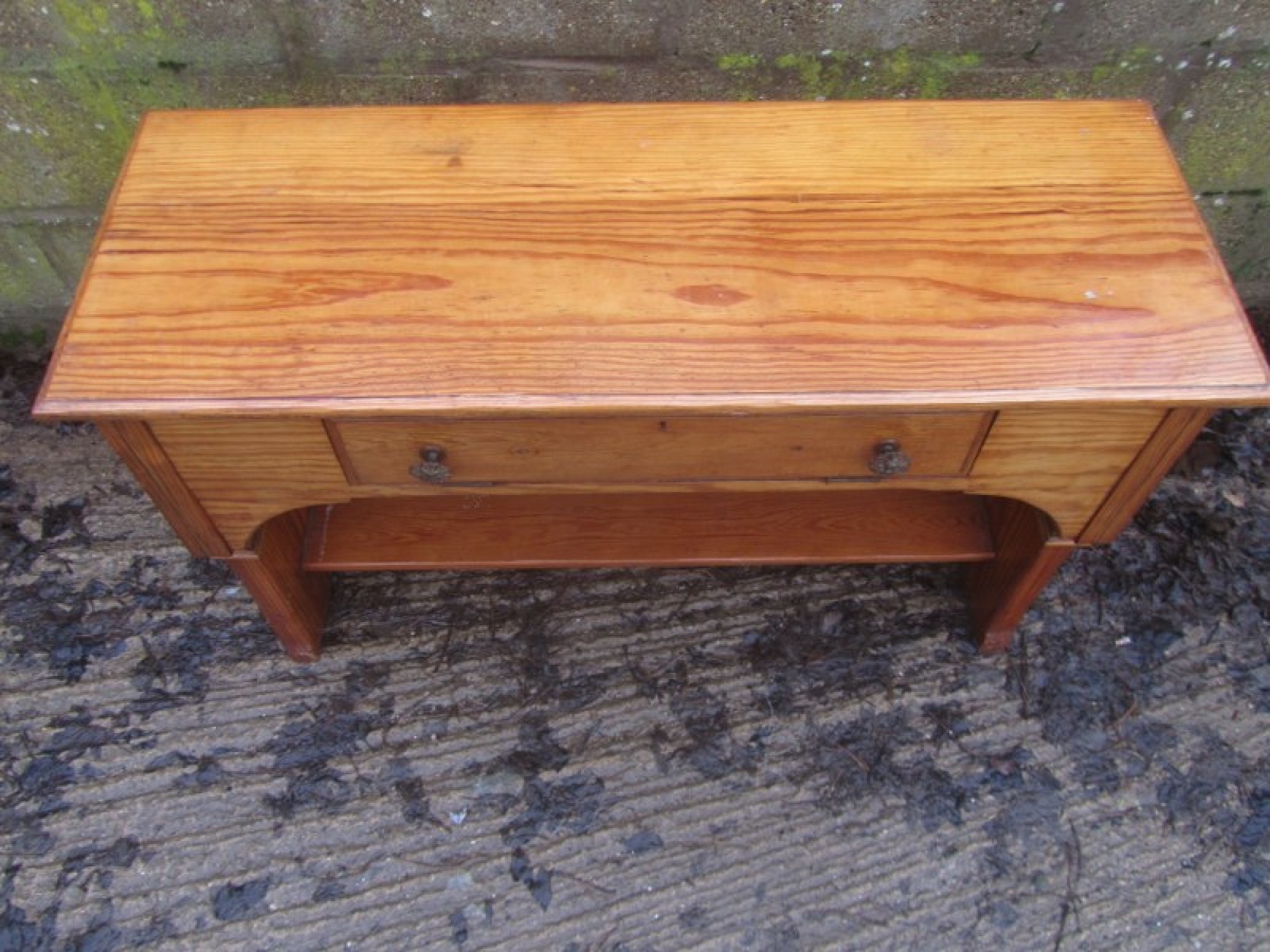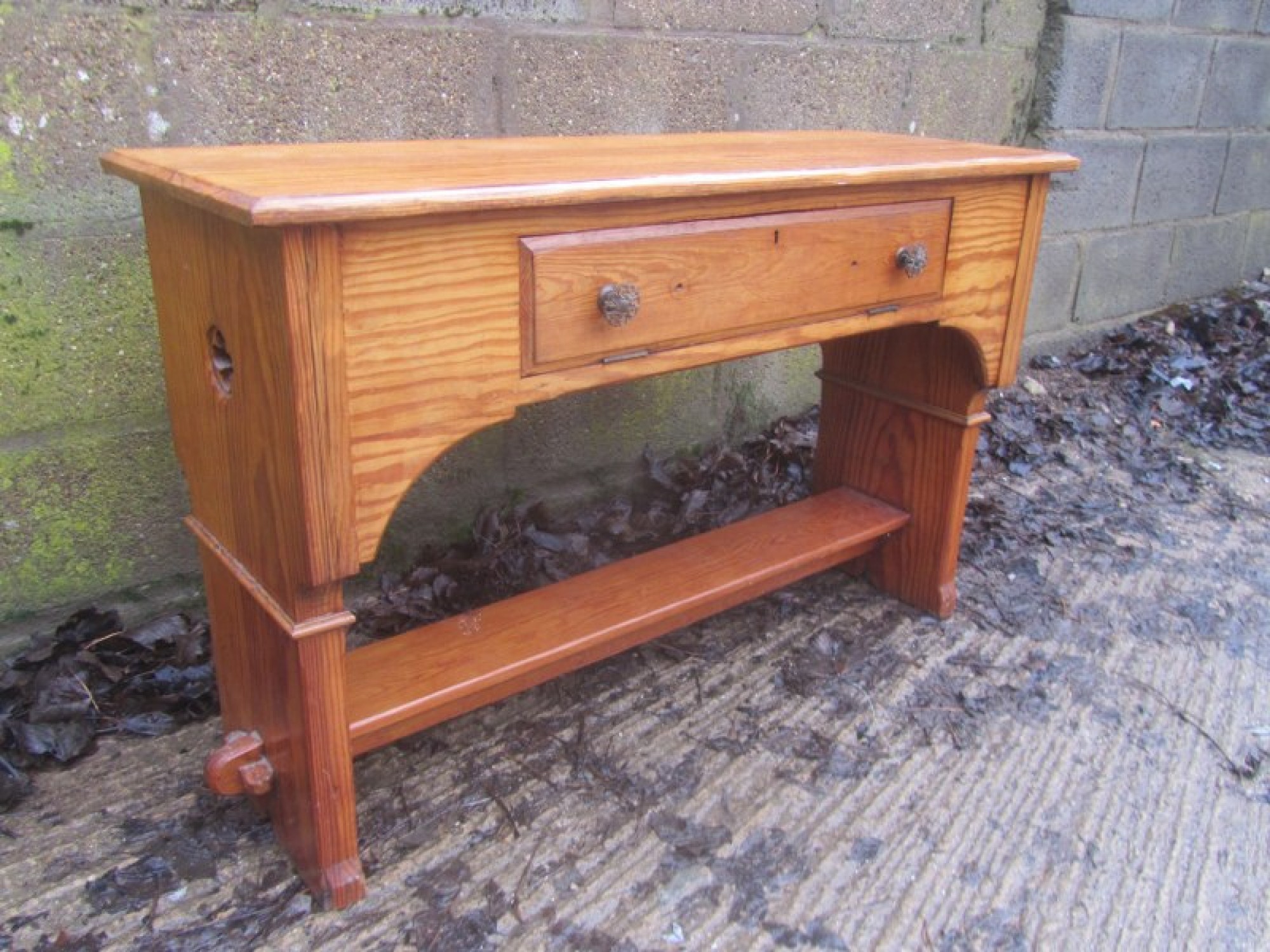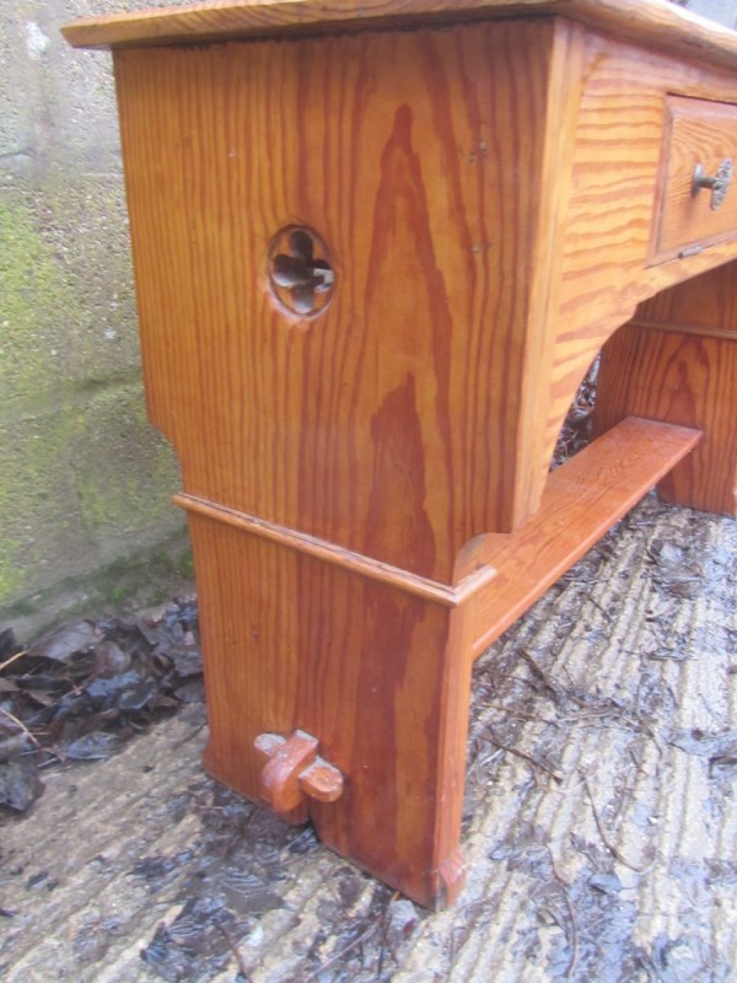 A SOLID PINE SIDE TABLE, IT IS STRONG AND STURDY. THE TABLE LOOKS TO BE HOME MADE, PROBABLY MADE FROM OLD CHURCH PEWS. WITH A DROP DOWN FRONT.