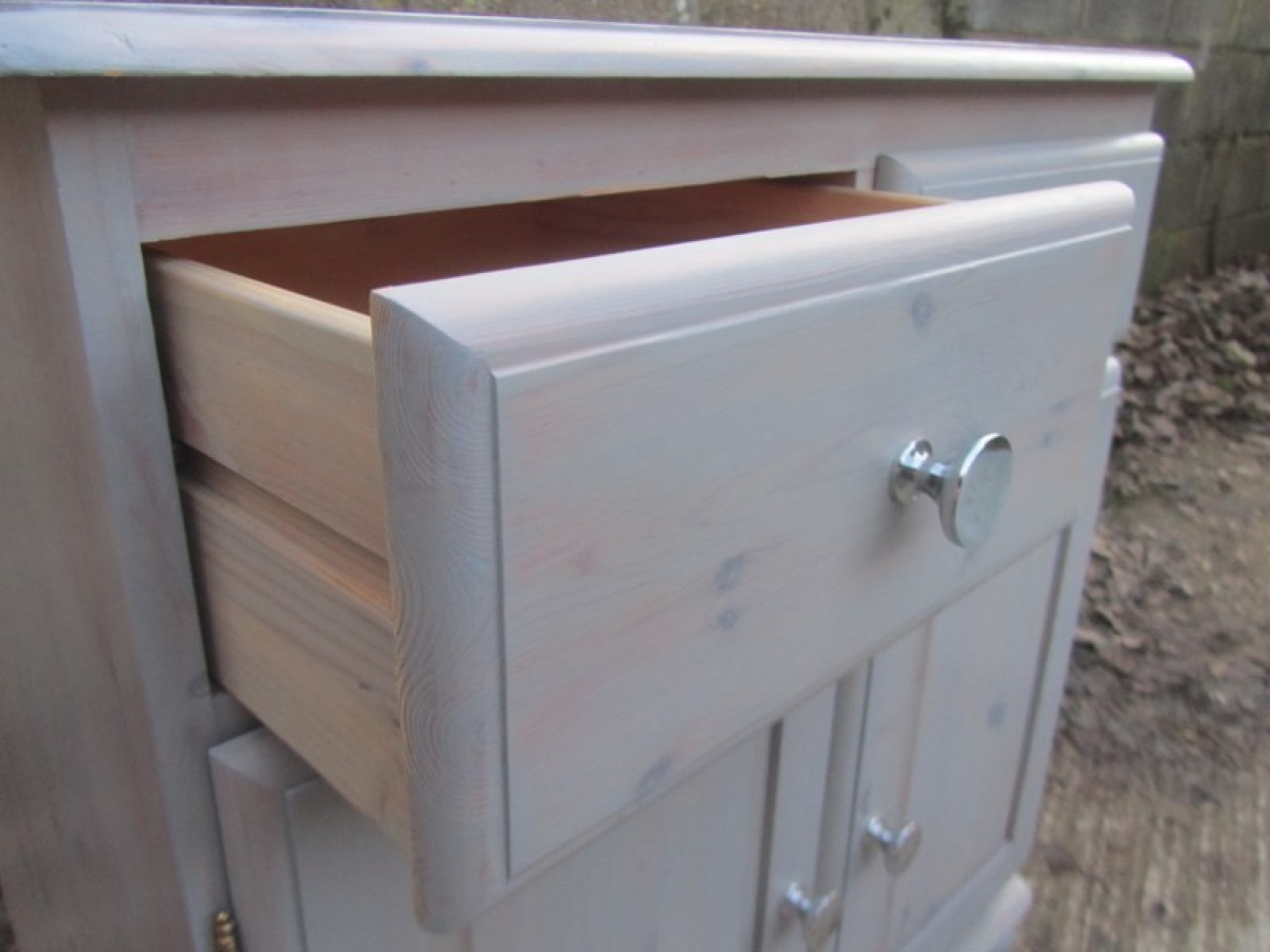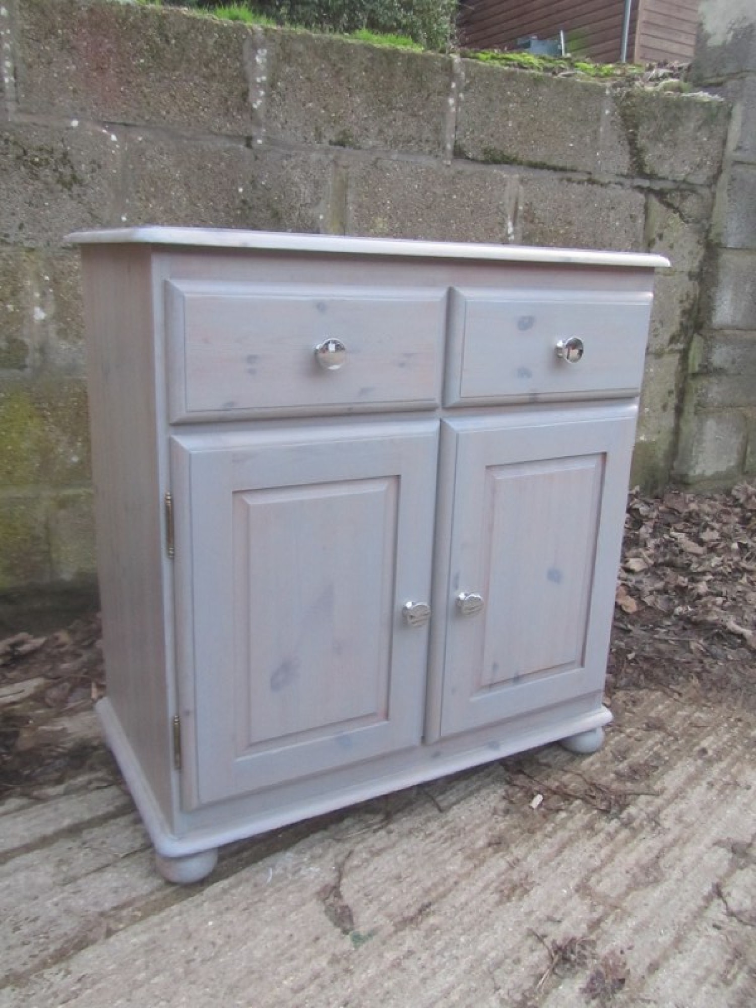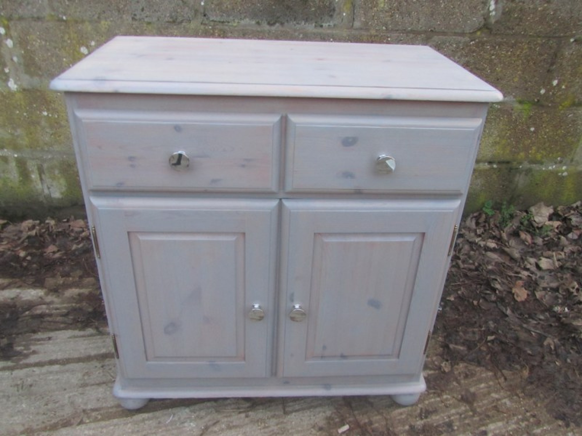 THIS IS A SOLID PINE CABINET, IT IS STRONG AND STURDY, AN ATTRACTIVE AND USEFUL PIECE FOR ANYWHERE IN THE HOME. IT IS A SMALL CABINET WITH DOORS AND DRAWERS. IN A GREY WASHED FINISH.