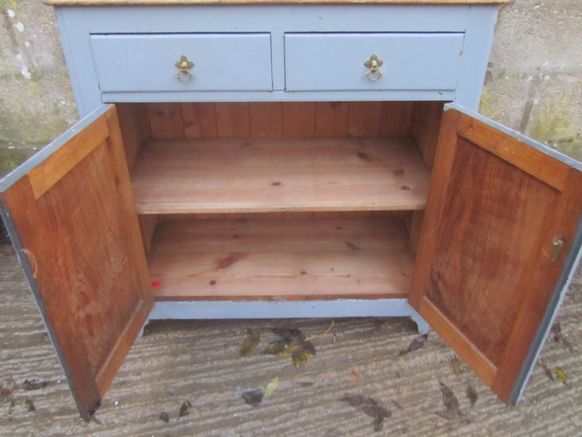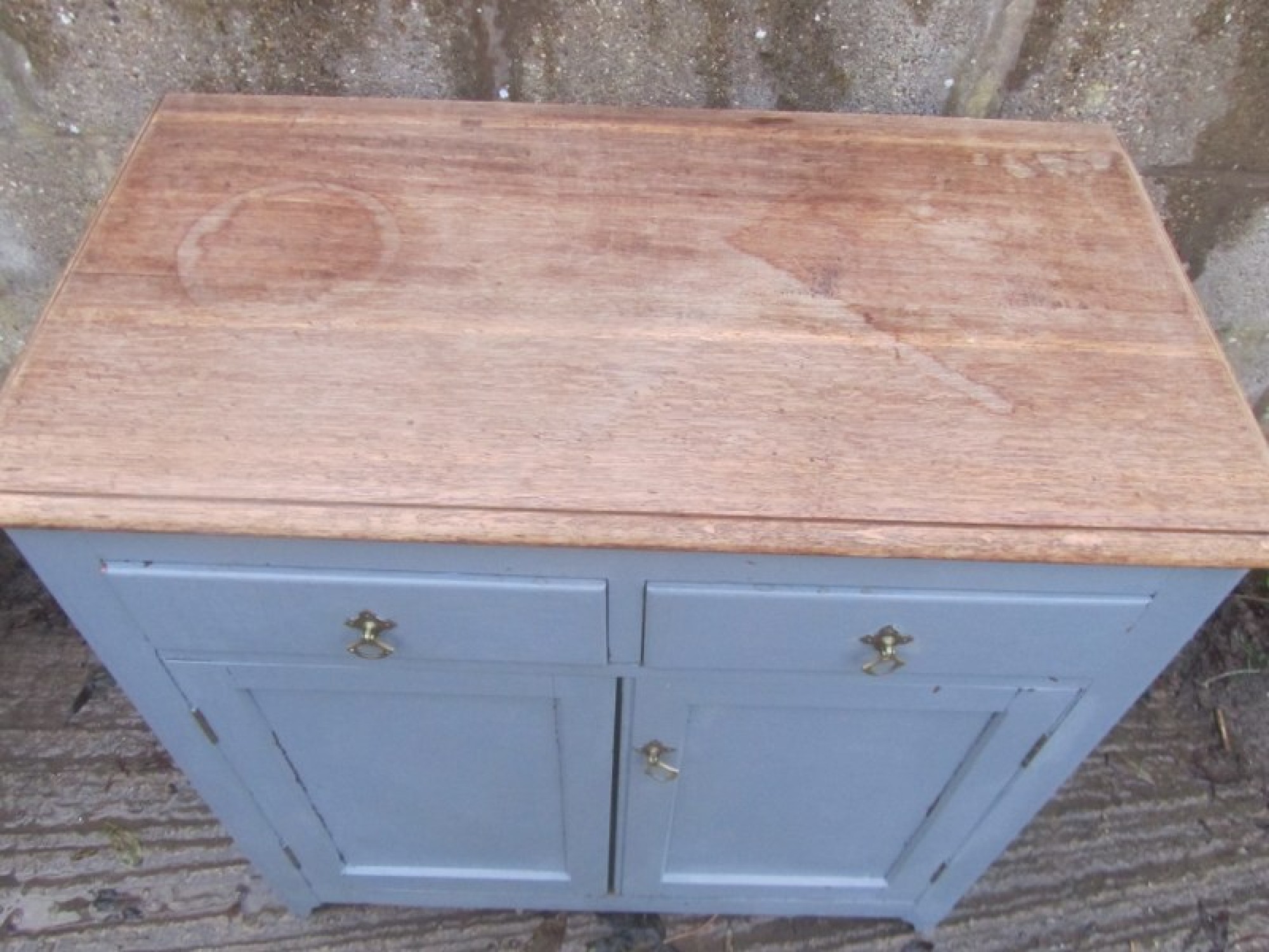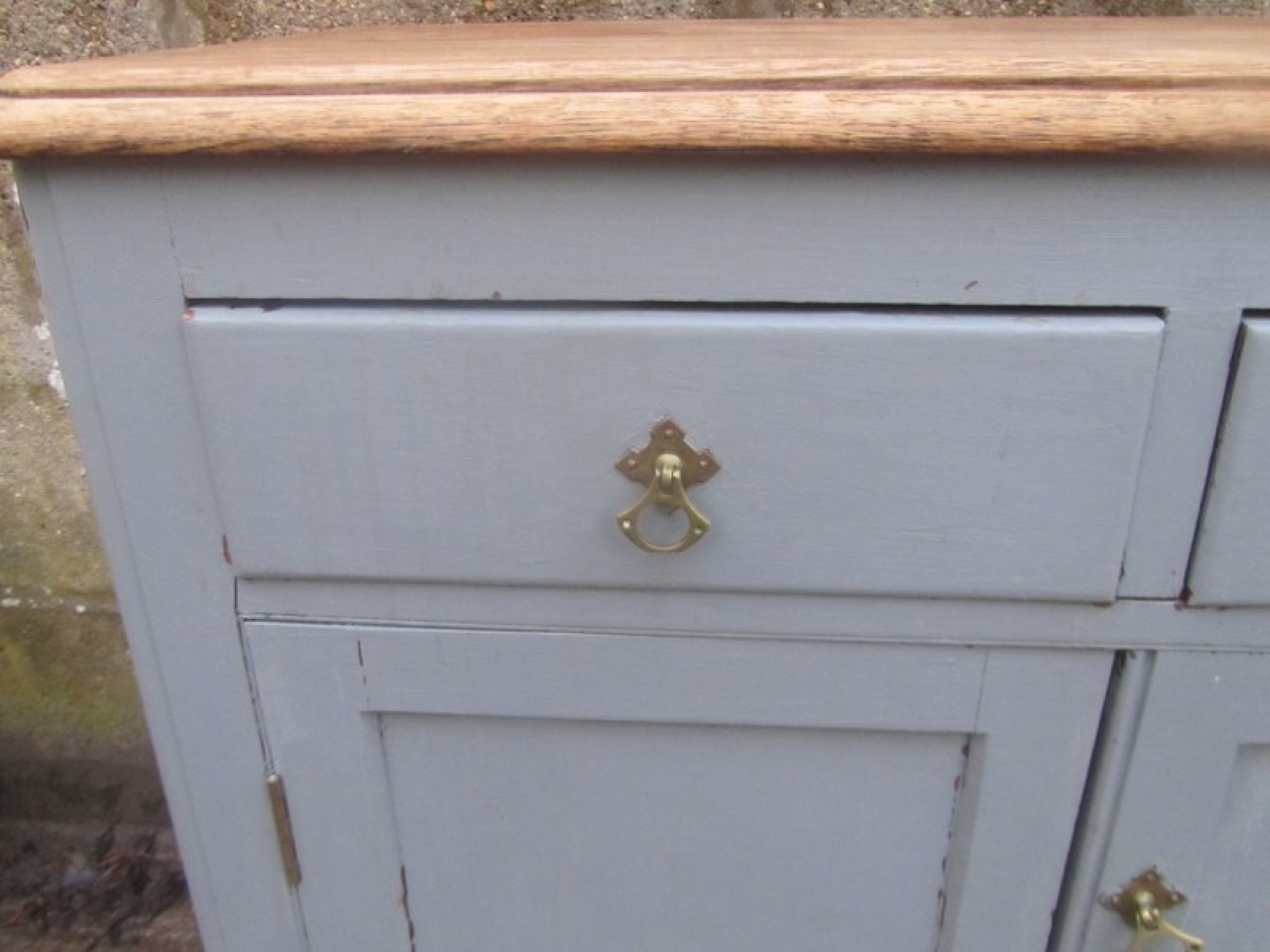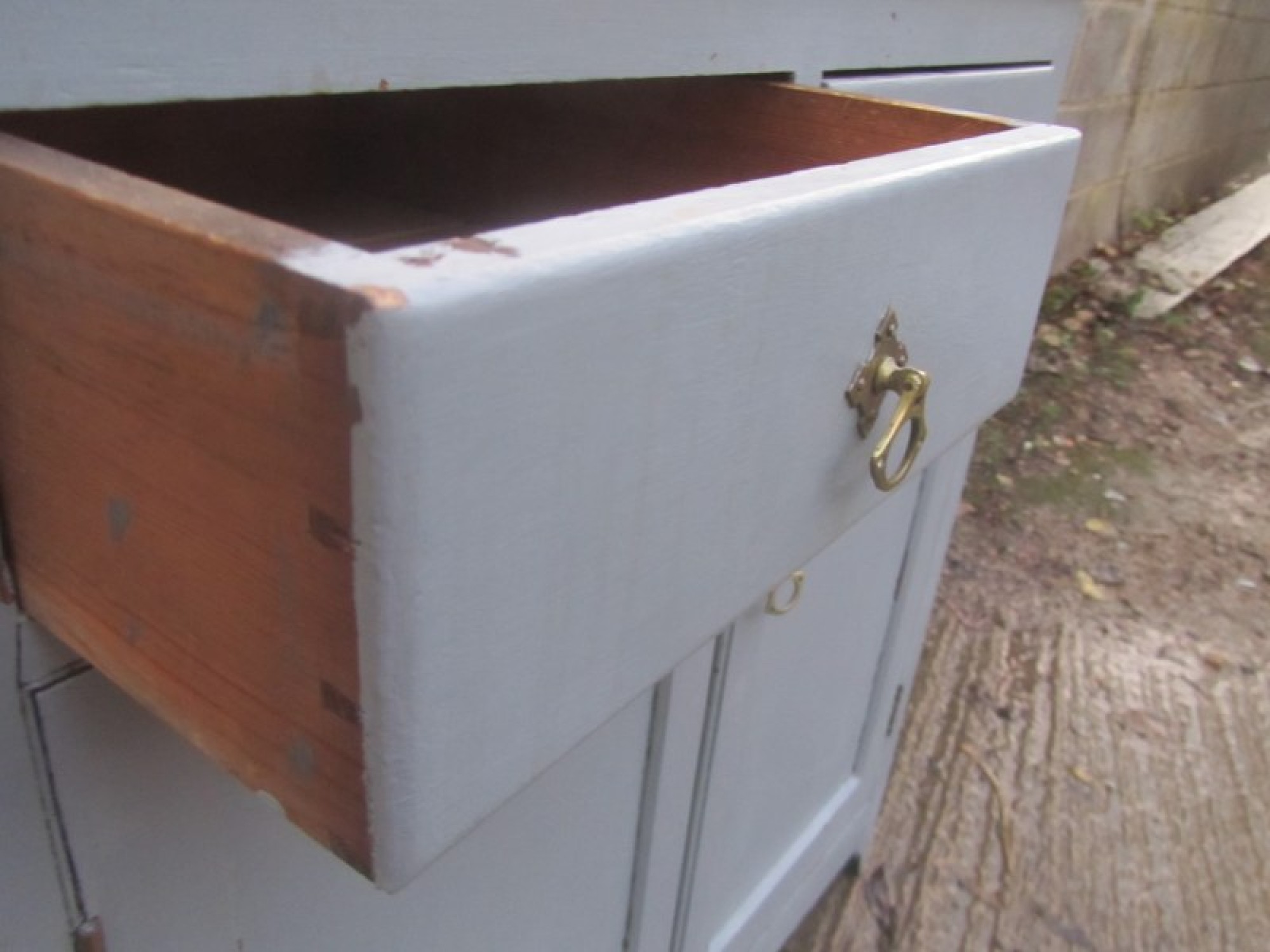 THERE IS WEAR AND TEAR, IT IS OVER 100 YEARS OLD AND WAS PAINTED GREY SOME TIME AGO. IN NEED OF SOME TLC. THE WOOD SEEMS TO BE OK UNDERNEATH THE PAINT. PROBABLY OAK UNDER THE PAINT WITH PINE DRAWER SIDES & BACKS.