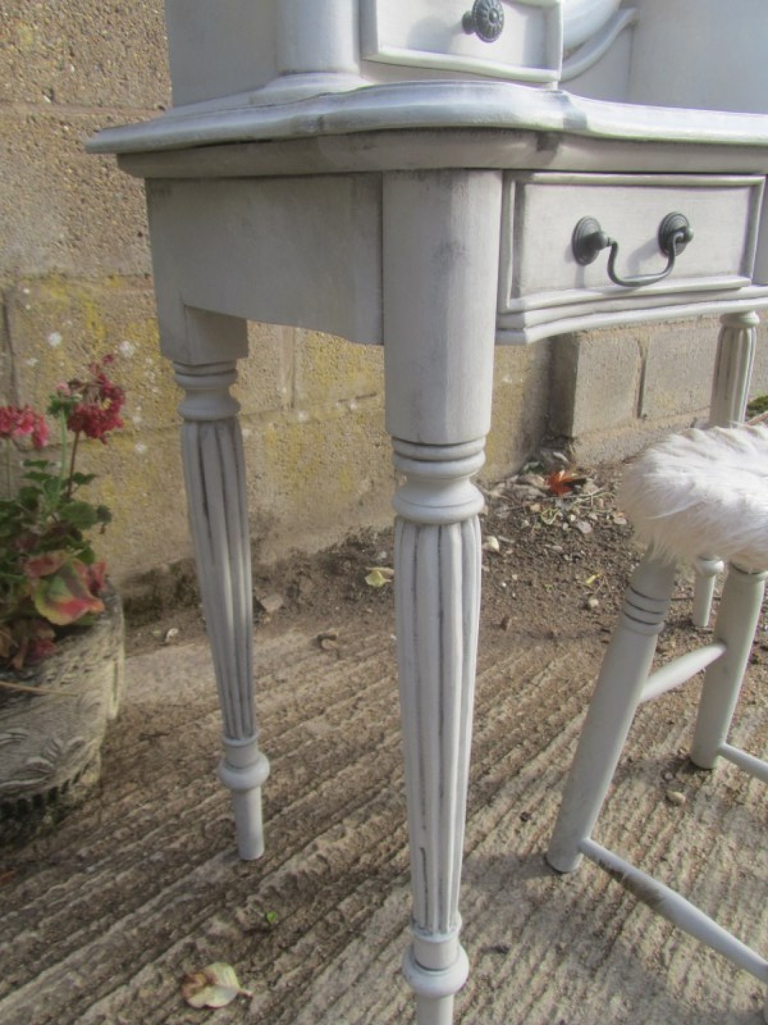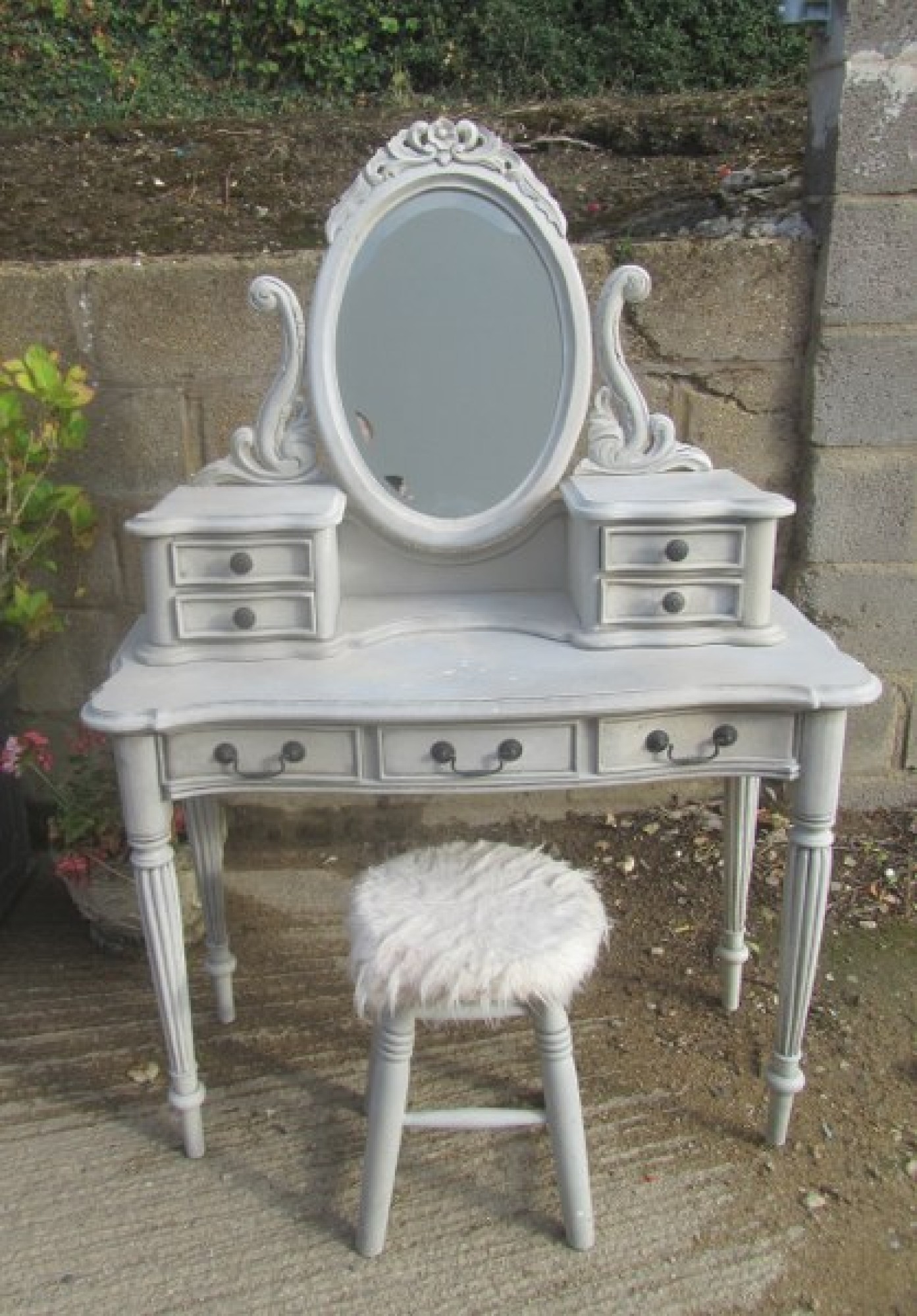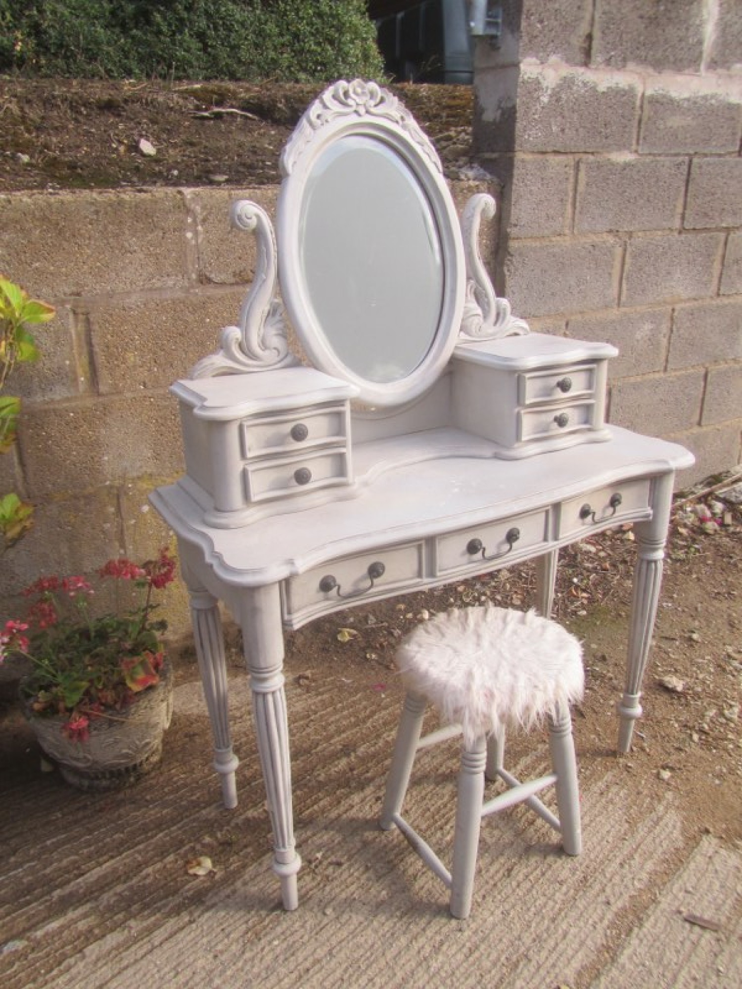 THIS IS A DRESSING TABLE AND STOOL IN A FRENCH STYLE, IN A GREY FINISH. SCUFFS AND WEAR. STRONG AND STURDY. WITH MIRROR & DRAWERS ABOVE.