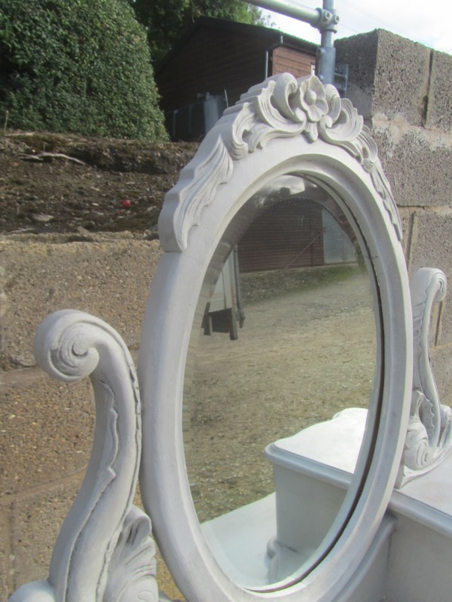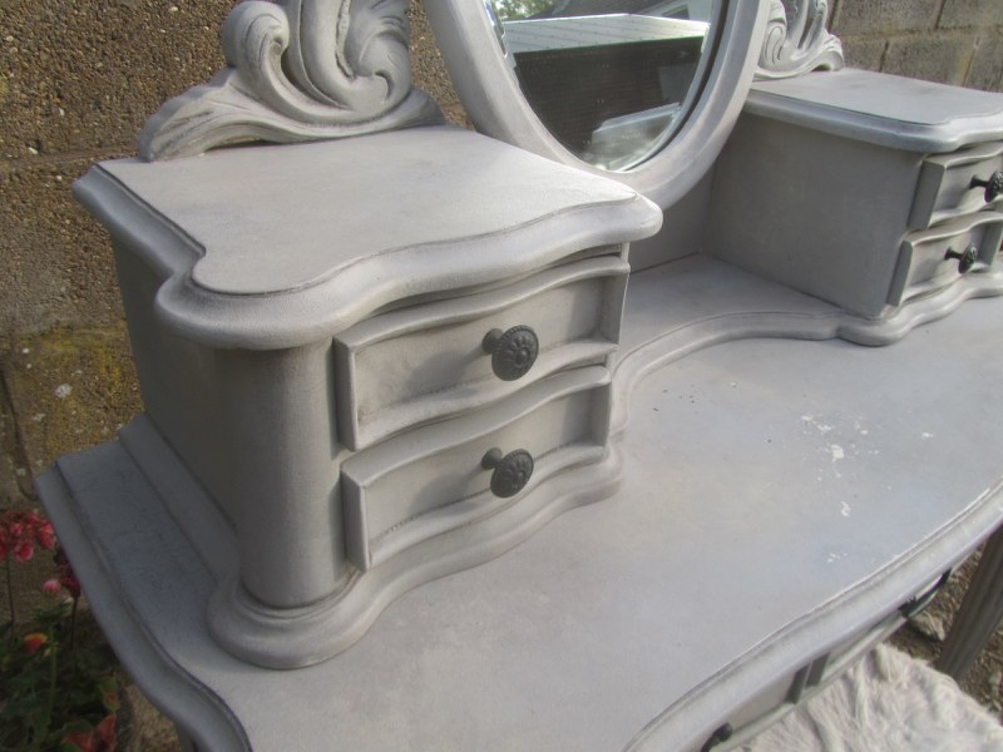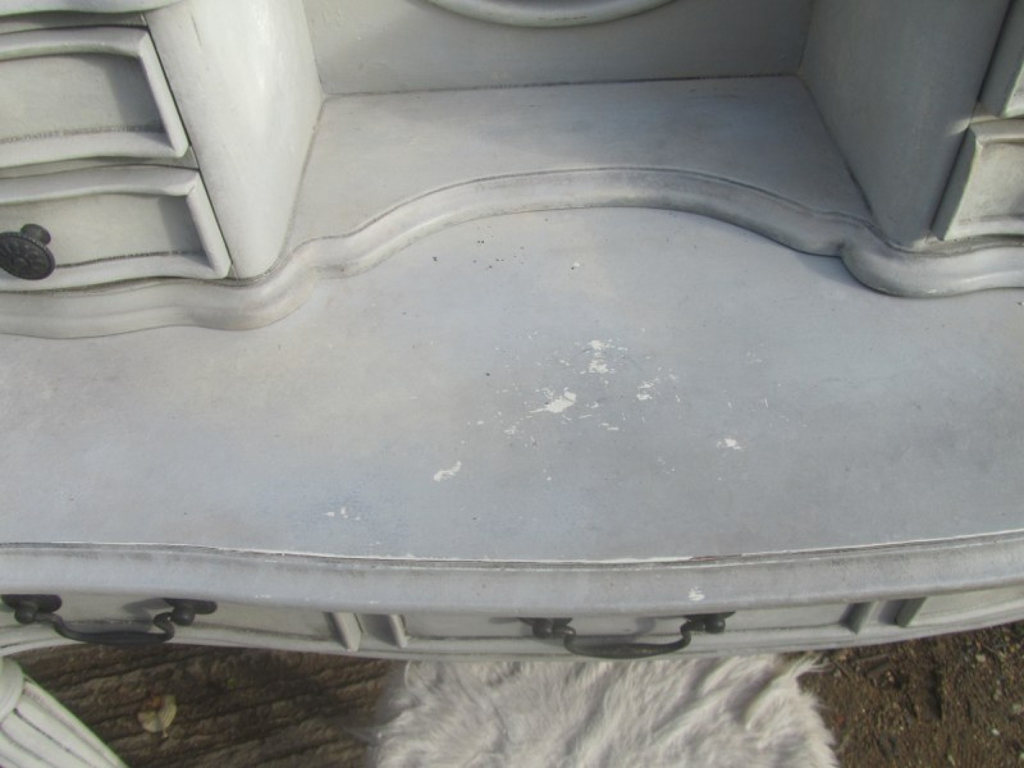 THIS IS A DRESSING TABLE AND STOOL IN A FRENCH STYLE, IN A GREY FINISH. SCUFFS AND WEAR. STRONG AND STURDY. WITH MIRROR & DRAWERS ABOVE.