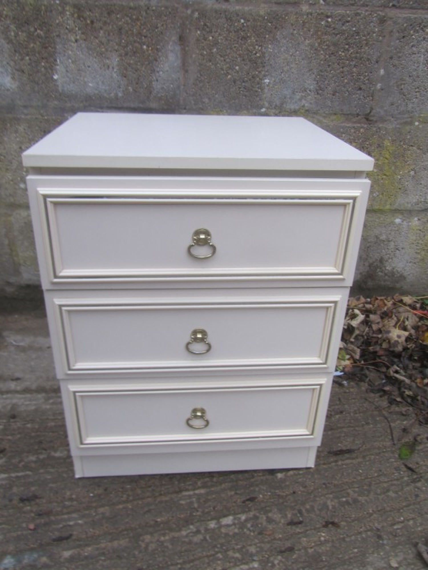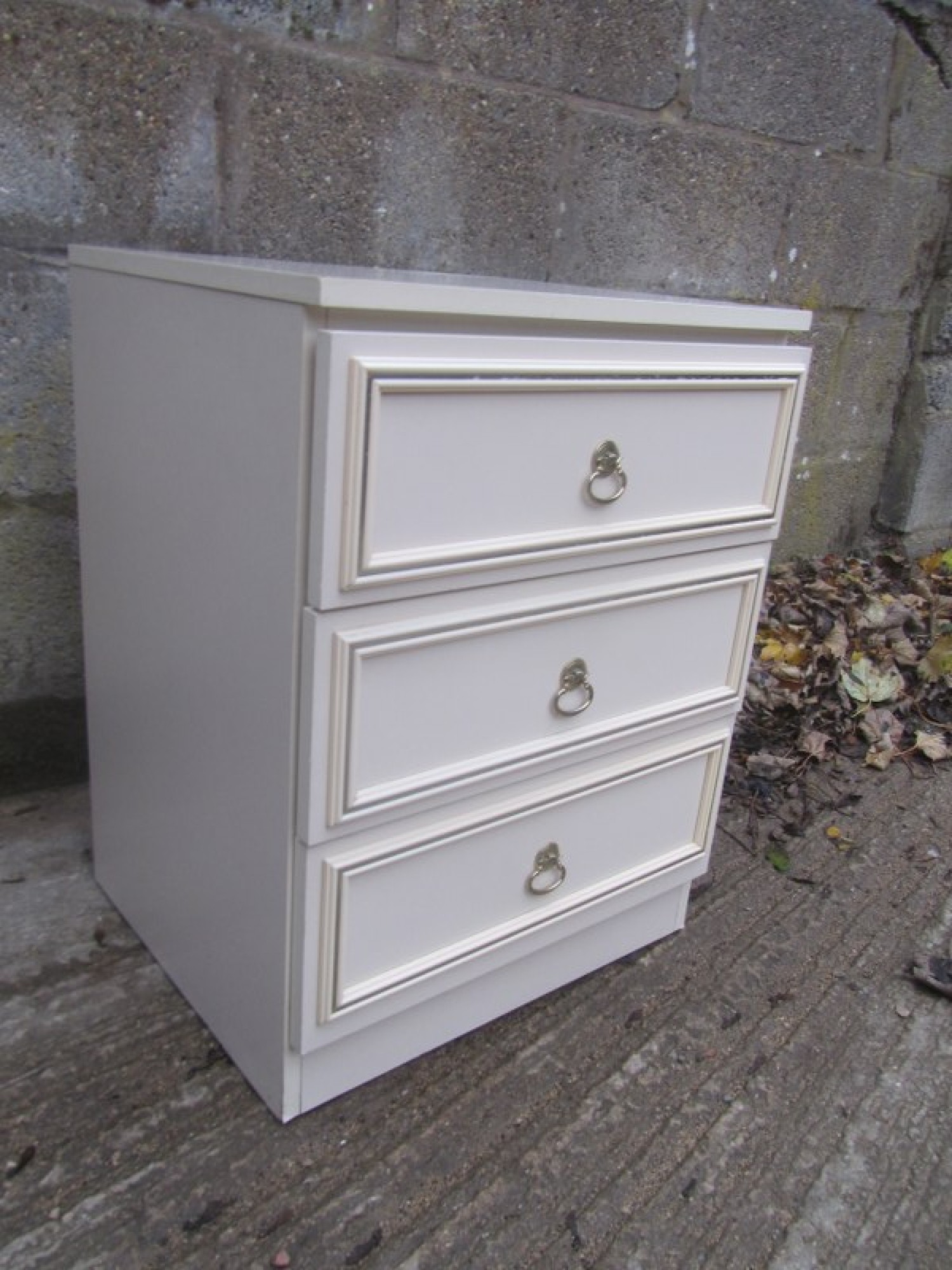 THIS IS A BEDSIDE CABINET. IN A CREAM MELAMINE FINISH. SOME SLIGHT WEAR. STRONG AND STURDY.