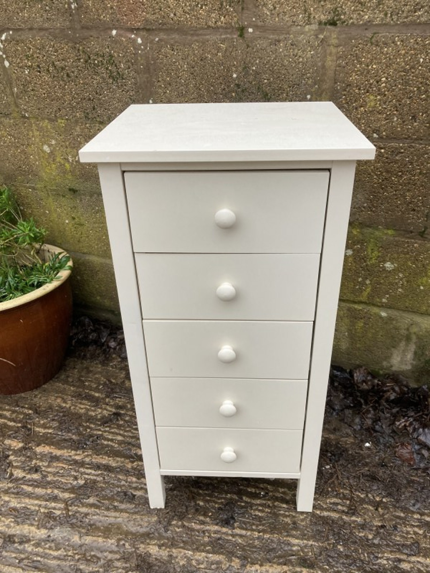 THIS IS A CHEST OF DRAWERS. IN A CREAM FINISH. STRONG AND STURDY.